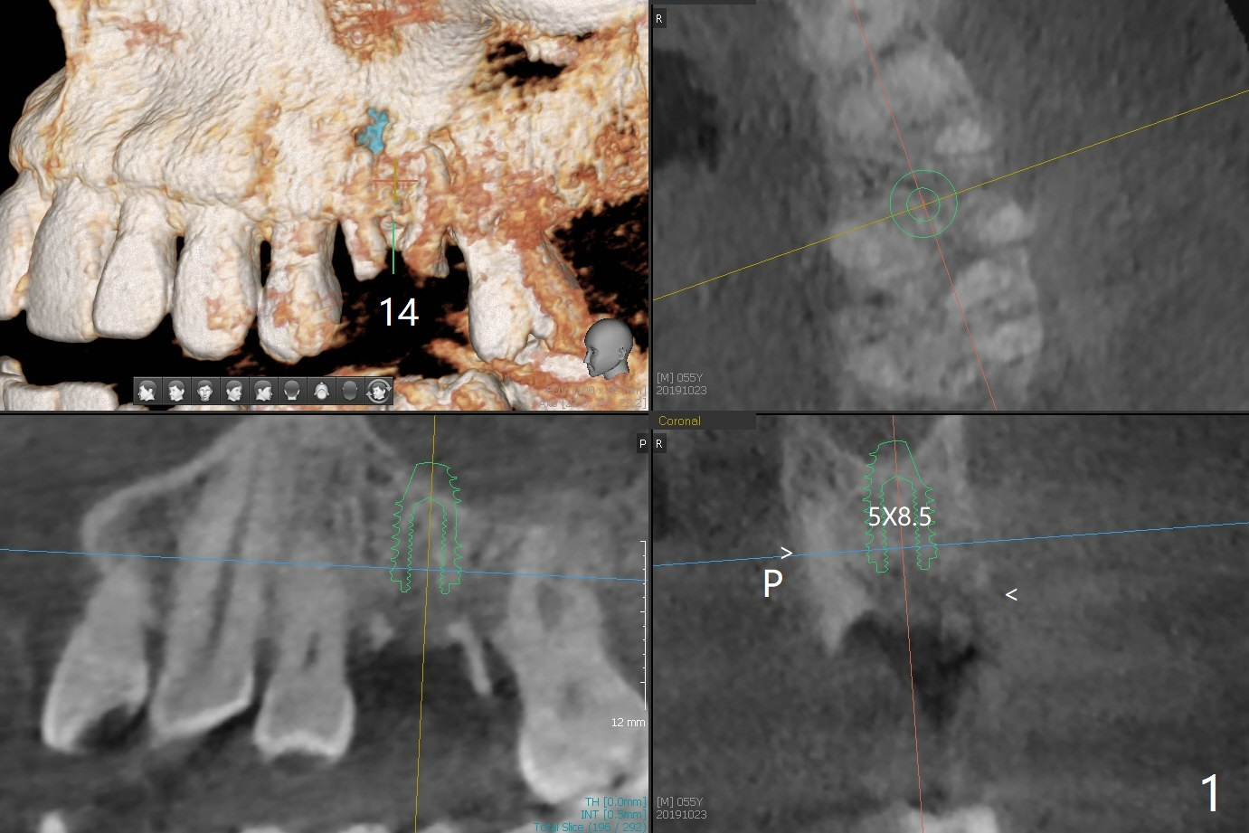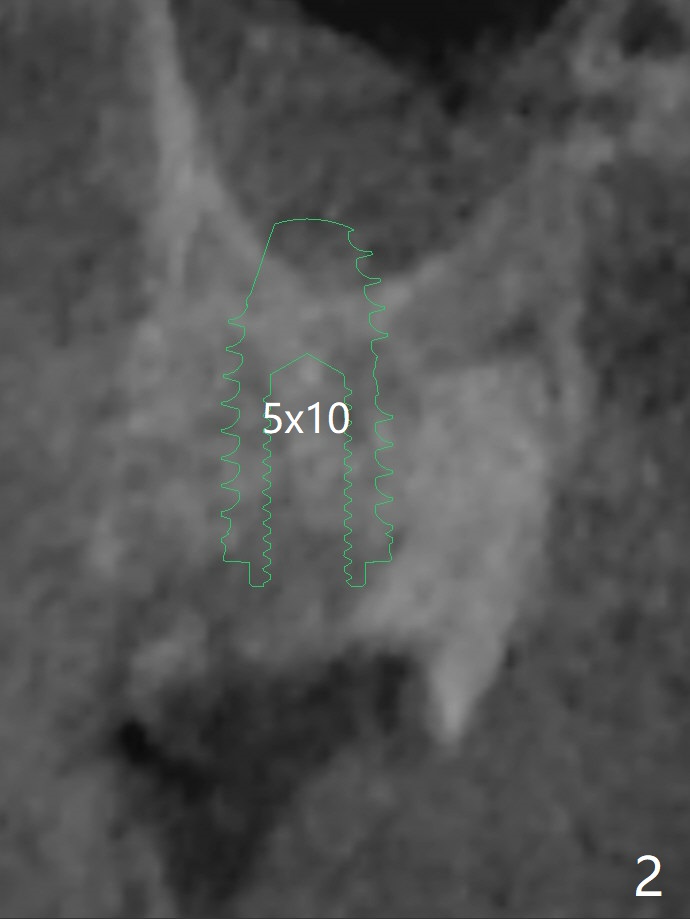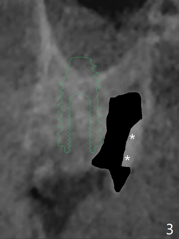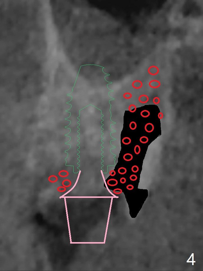 A 55-year-old man agrees to have the tooth #14 to be extracted for immediate implant. It appears that the palatal bone is lower than the buccal bone (Fig.1 arrowheads). If palatal shield is conducted (Fig.3 *), the implant can be longer (5x10 vs. 8.5 mm, Fig.2-4).