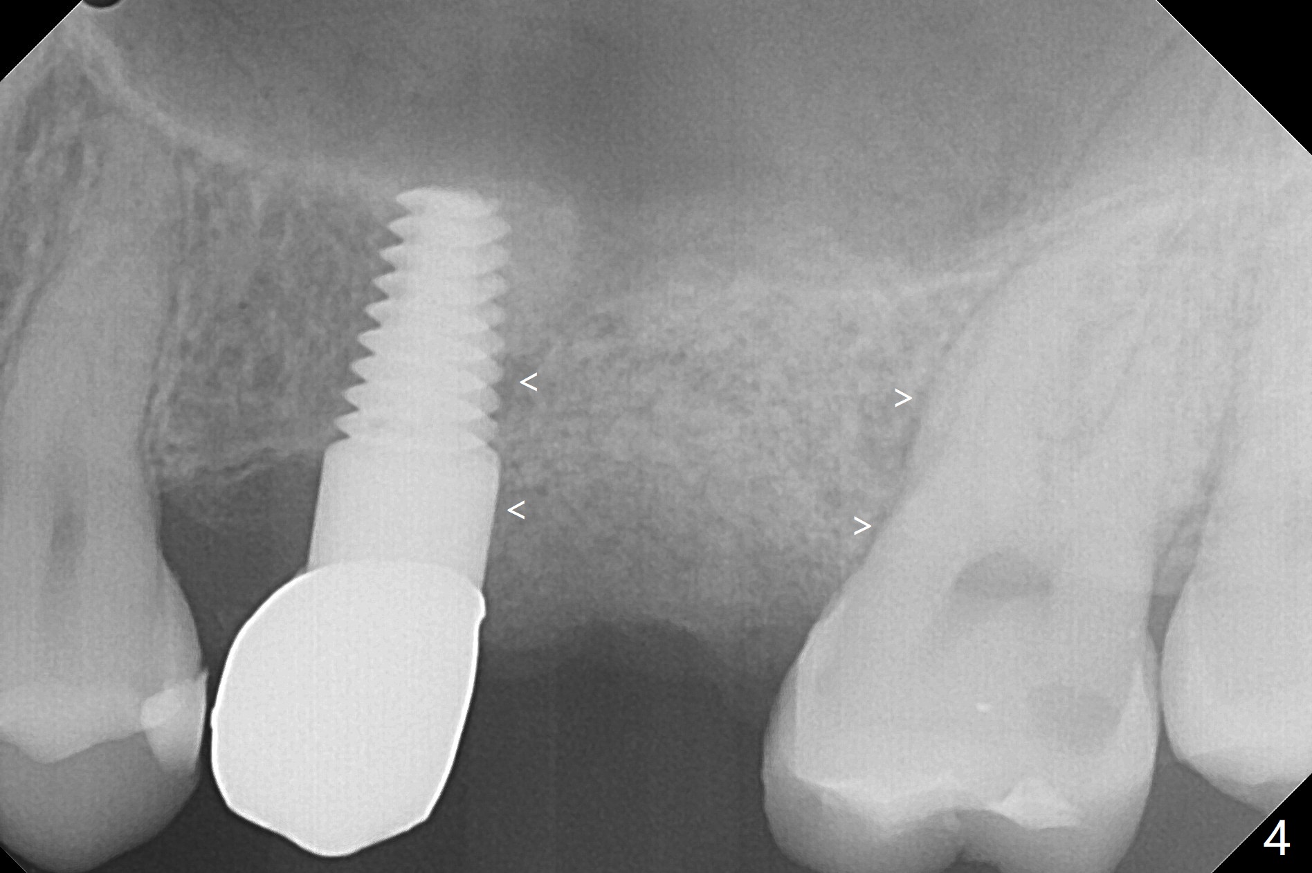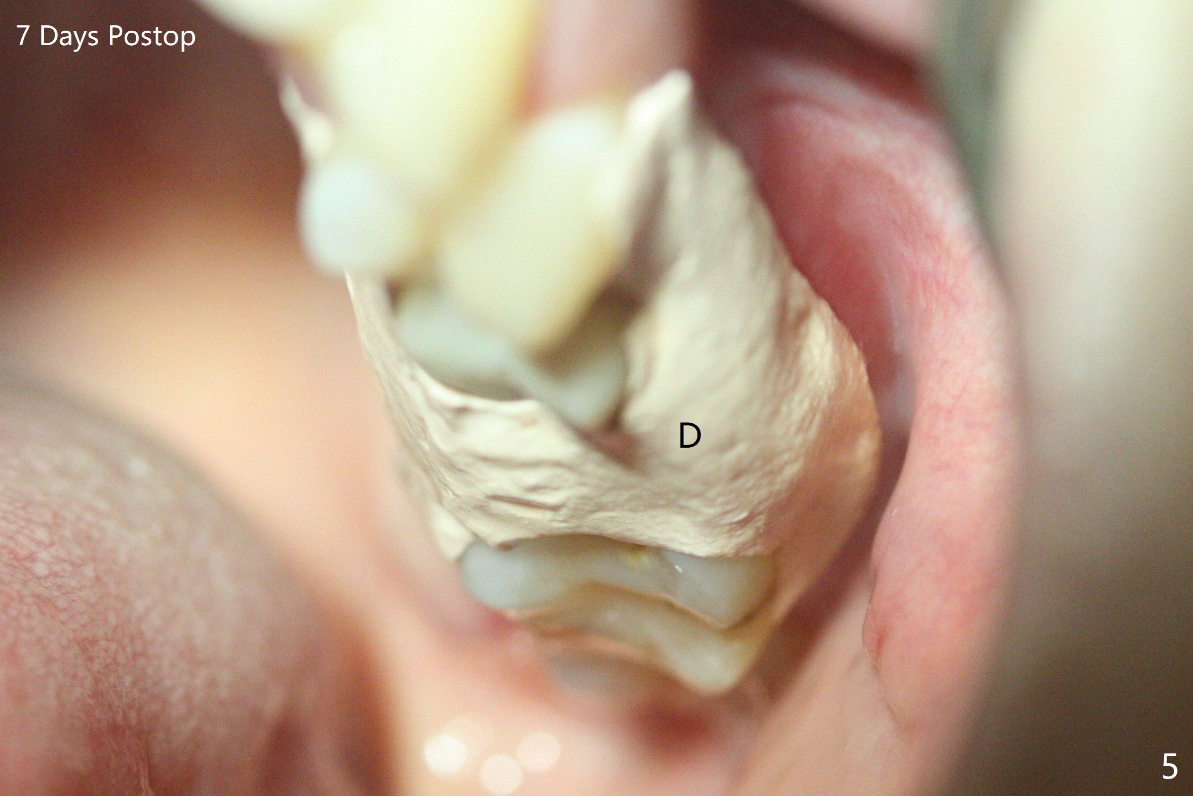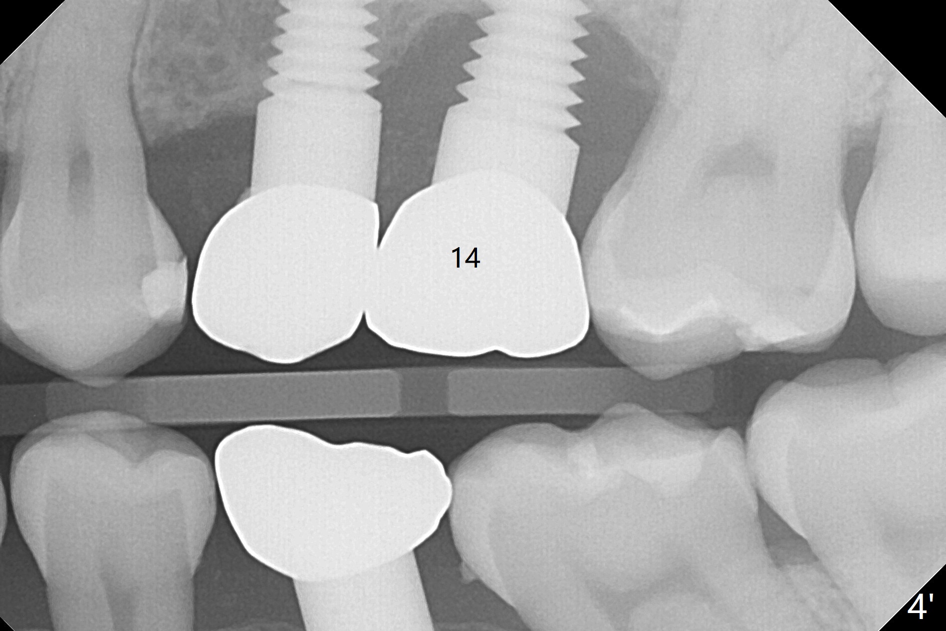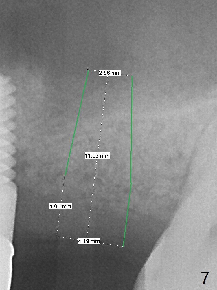 A 32-year-old woman develops periimplantitis (severe hemorrhage and deep pockets) at #14 three years 7 months post cementation (Fig.1).  A 4.5x11 mm implant is placed with flap at #13 after failure for the 1st time (Fig.2), while a 5x11 mm implant is placed flapless with sinus membrane perforation.  Uniposts are cemented with Ketac.  The lingual plate at #14 is defective (Fig.3).  The implant at #14 will be removed flapless, followed by Osteogen plug (most likely sinus floor defect) and bone graft.  After healing, an implant will be placed with guide.  By breaking the proximal contacts, the crown, abutment and implant at #14 are shaken loose using forceps.  Finally the crown breaks off.  Make a slot on the top of the abutment and use a screw bit to turn the abutment/implant counterclockwise.  There is abundant granulation tissue with arterial hemorrhage associated with granulation tissue removal.  The defect involves the distal surface of the implant at #13 and the mesial surface of the tooth #15.  Therefore bone graft is deposited in these surfaces (Fig.4 arrowheads, as compared to preop BW, Fig.4').  The periodontal dressing seems to remain in place asymptomatic 7 days postop (Fig.5).  The bone height 5.5 months postop should be enough for implantation (Fig.6).  To avoid marker associated with guided surgery, free hand will be adopted.  Sinus lift with PRF is expected.  To place in the middle of the ridge buccopalatally, incision will be made with bone expansion.