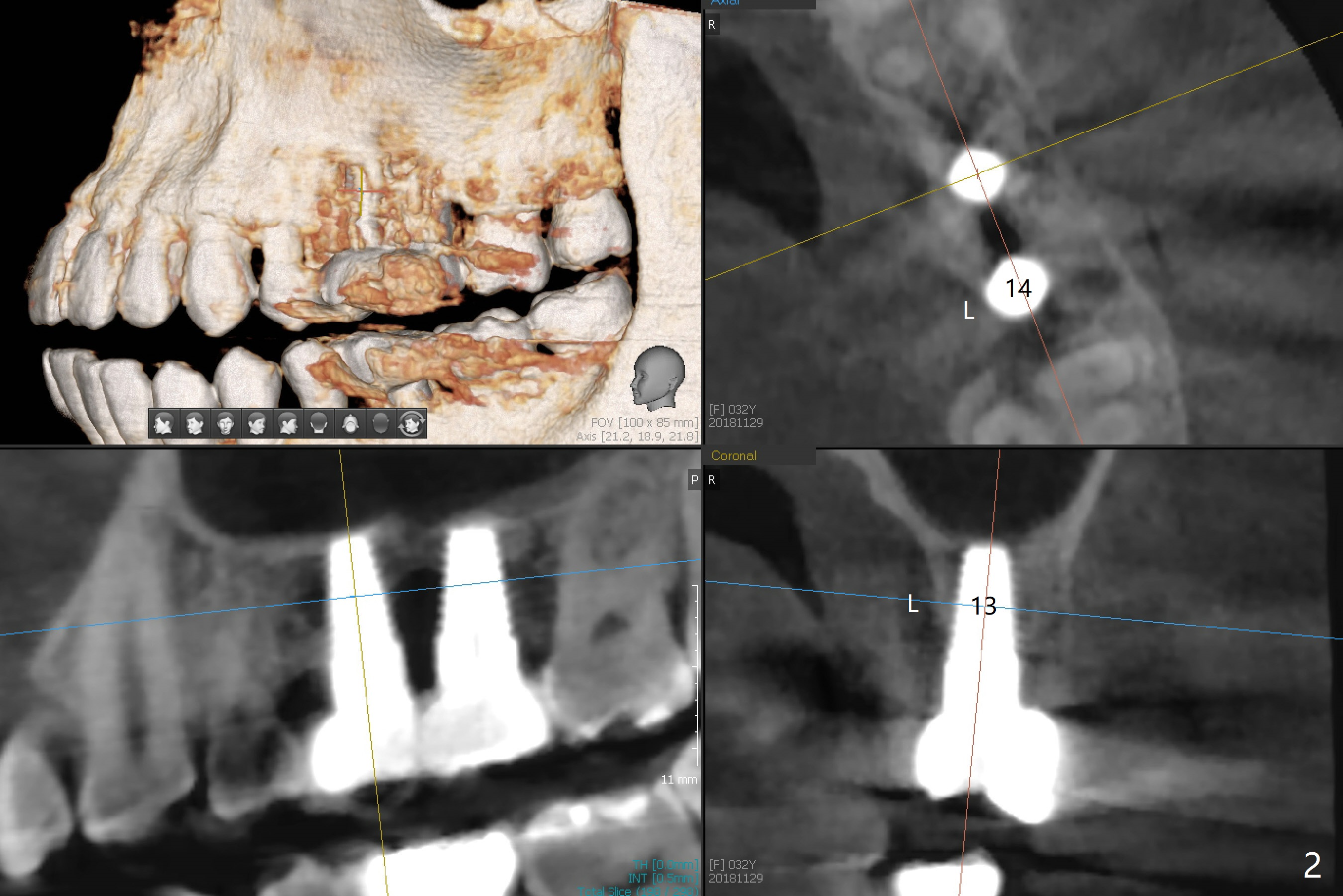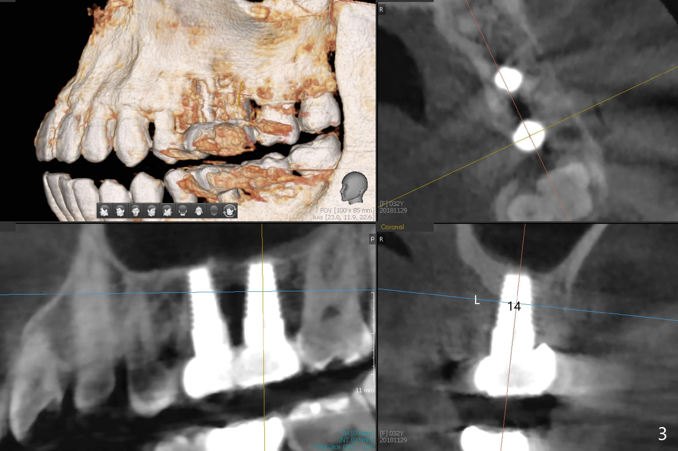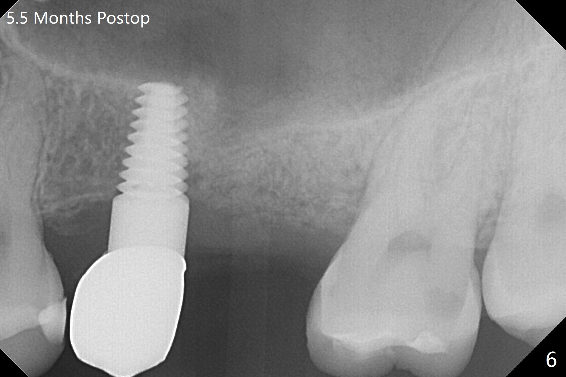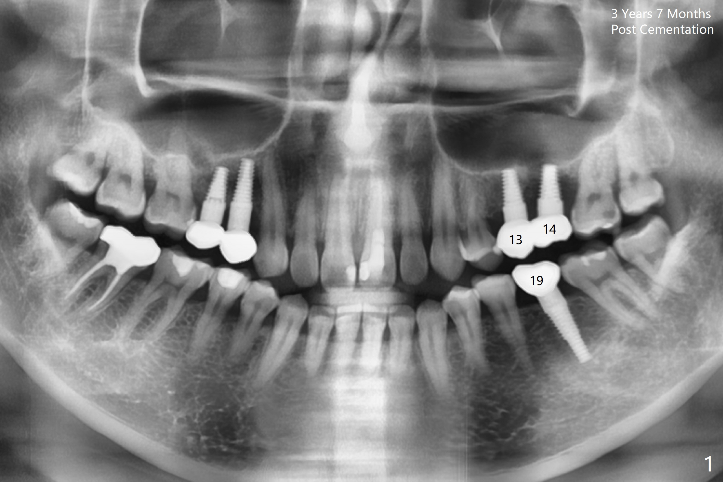 A 32-year-old woman develops periimplantitis (severe hemorrhage and deep pockets) at #14 three years 7 months post cementation (Fig.1).  A 4.5x11 mm implant is placed with flap at #13 after failure for the 1st time (Fig.2), while a 5x11 mm implant is placed flapless with sinus membrane perforation.  Uniposts are cemented with Ketac.  The lingual plate at #14 is defective (Fig.3).  The implant at #14 will be removed flapless, followed by Osteogen plug (most likely sinus floor defect) and bone graft.  After healing, an implant will be placed with guide.  By breaking the proximal contacts, the crown, abutment and implant at #14 are shaken loose using forceps.  Finally the crown breaks off.  Make a slot on the top of the abutment and use a screw bit to turn the abutment/implant counterclockwise.  There is abundant granulation tissue with arterial hemorrhage associated with granulation tissue removal.  The defect involves the distal surface of the implant at #13 and the mesial surface of the tooth #15.  Therefore bone graft is deposited in these surfaces (Fig.4 arrowheads, as compared to preop BW, Fig.4').  The periodontal dressing seems to remain in place asymptomatic 7 days postop (Fig.5).  The bone height 5.5 months postop should be enough for implantation (Fig.6).  To avoid marker associated with guided surgery, free hand will be adopted.  Sinus lift with PRF is expected.  To place in the middle of the ridge buccopalatally, incision will be made with bone expansion.