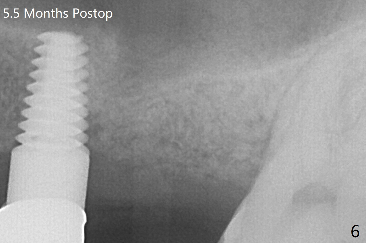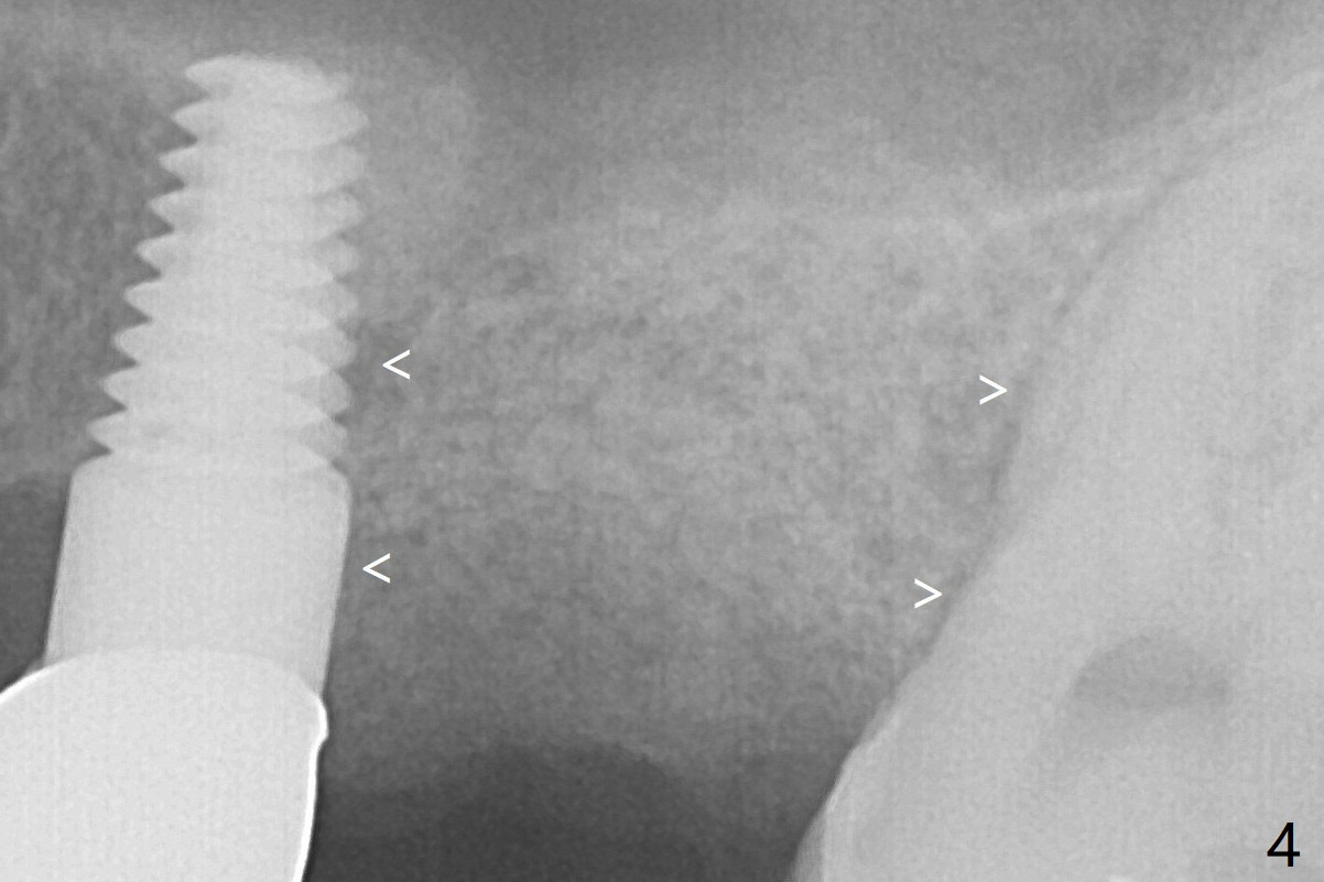 By breaking the proximal contacts, the crown, abutment and implant at #14 are shaken loose using forceps. Finally the crown breaks off. Make a slot on the top of the abutment and use a screw bit to turn the abutment/implant counterclockwise. There is abundant granulation tissue with arterial hemorrhage associated with removal. The defect involves the distal surface of the implant at #13 and the mesial surface of the tooth #15. Therefore bone graft is deposited in these surfaces (Fig.4 arrowheads). The bone height 5.5 months postop should be enough for implantation (Fig.6).