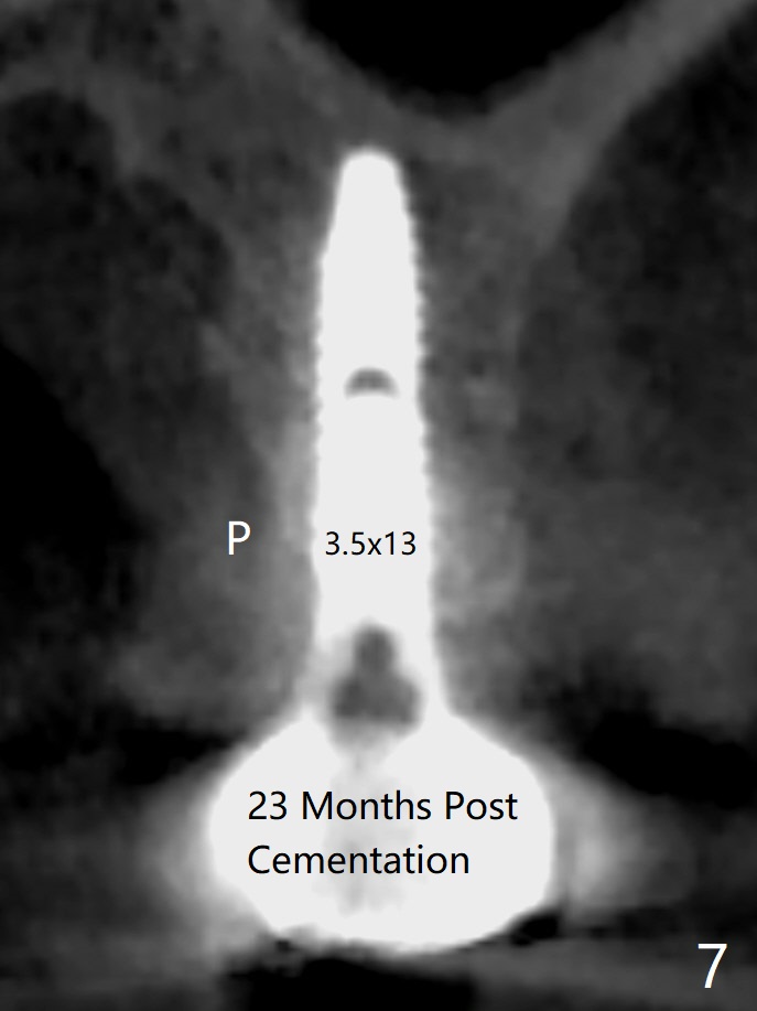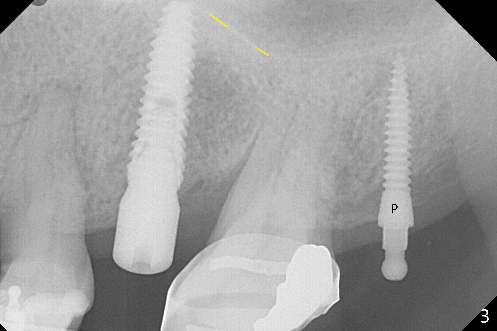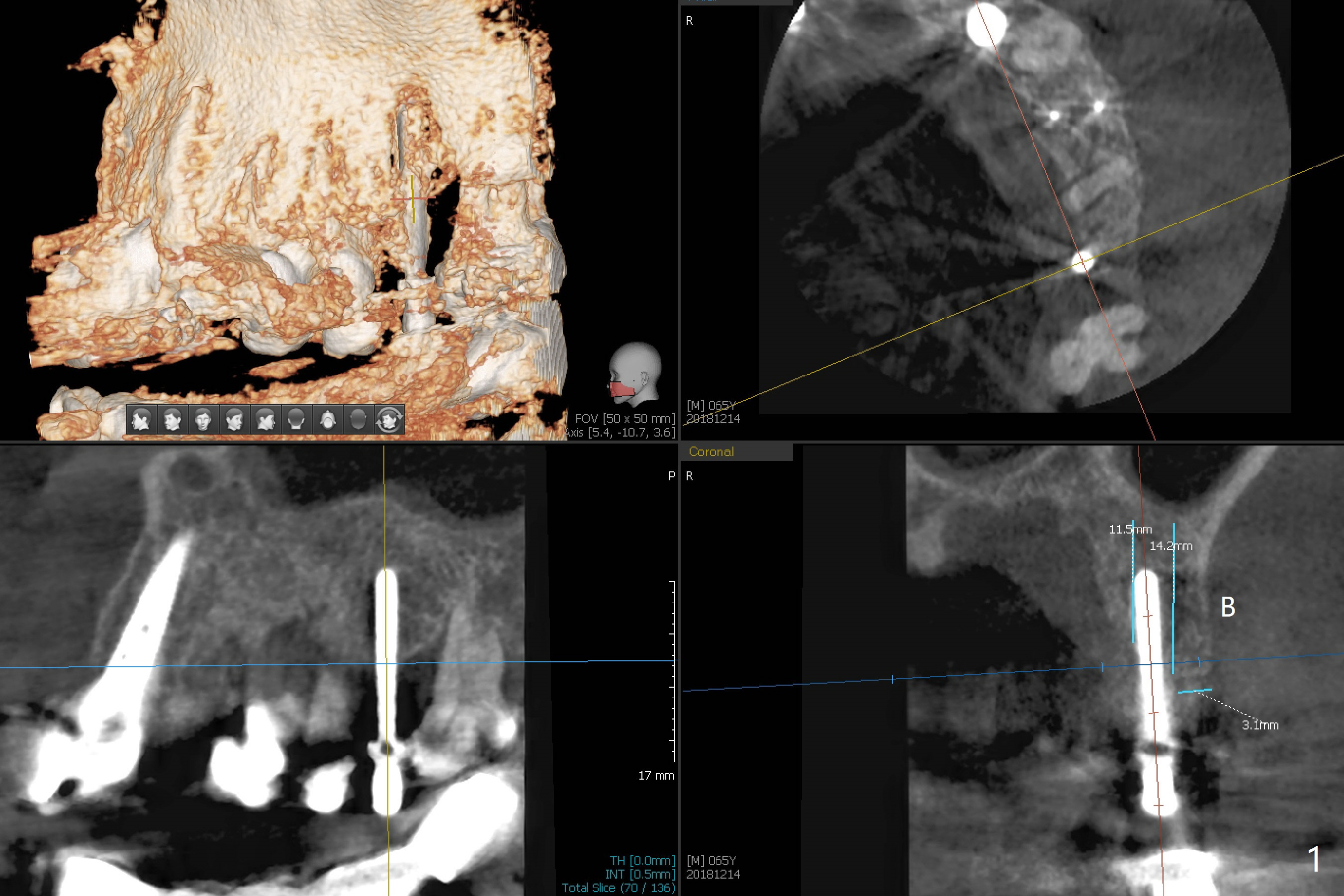 Eight-month limited ortho including use of a 1-piece implant (Fig.3 P (ball type)) as a distal anchor increases the mesiodistal space of #14 from <4 mm to 6 mm (near premolar width). Guided surgery is not indicated because of presence of brackets and band and the narrow space. Also due to the latter, incision is difficult to make. In stead a 3.5 mm tissue punch is applied. After 2.2 mm drill, a parallel pin is placed; it appears that the initial osteotomy is palatal (Fig.1). Lindamann bur is adopted to move the osteotomy buccal. The last drill (3 mm for 3.5 mm implant) has no resistance when it enters the buccalized osteotomy. A longer implant than designed is placed (3.5x13 mm, Fig.2,3, close to the sinus floor (dashed yellow line) with 50 Ncm. When the implant osteointegrates, it will be used a mesial anchor to distalize the 2nd molar.