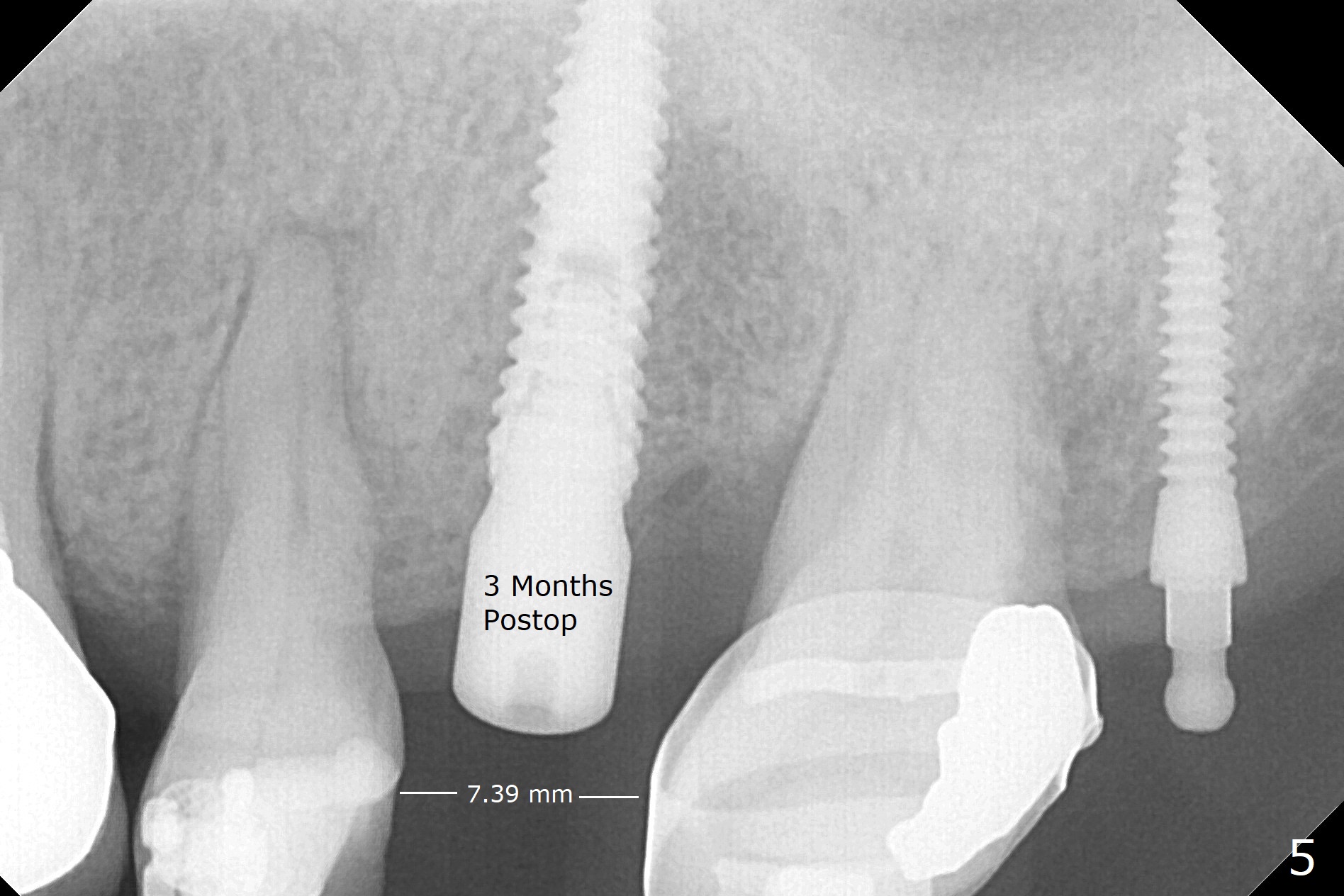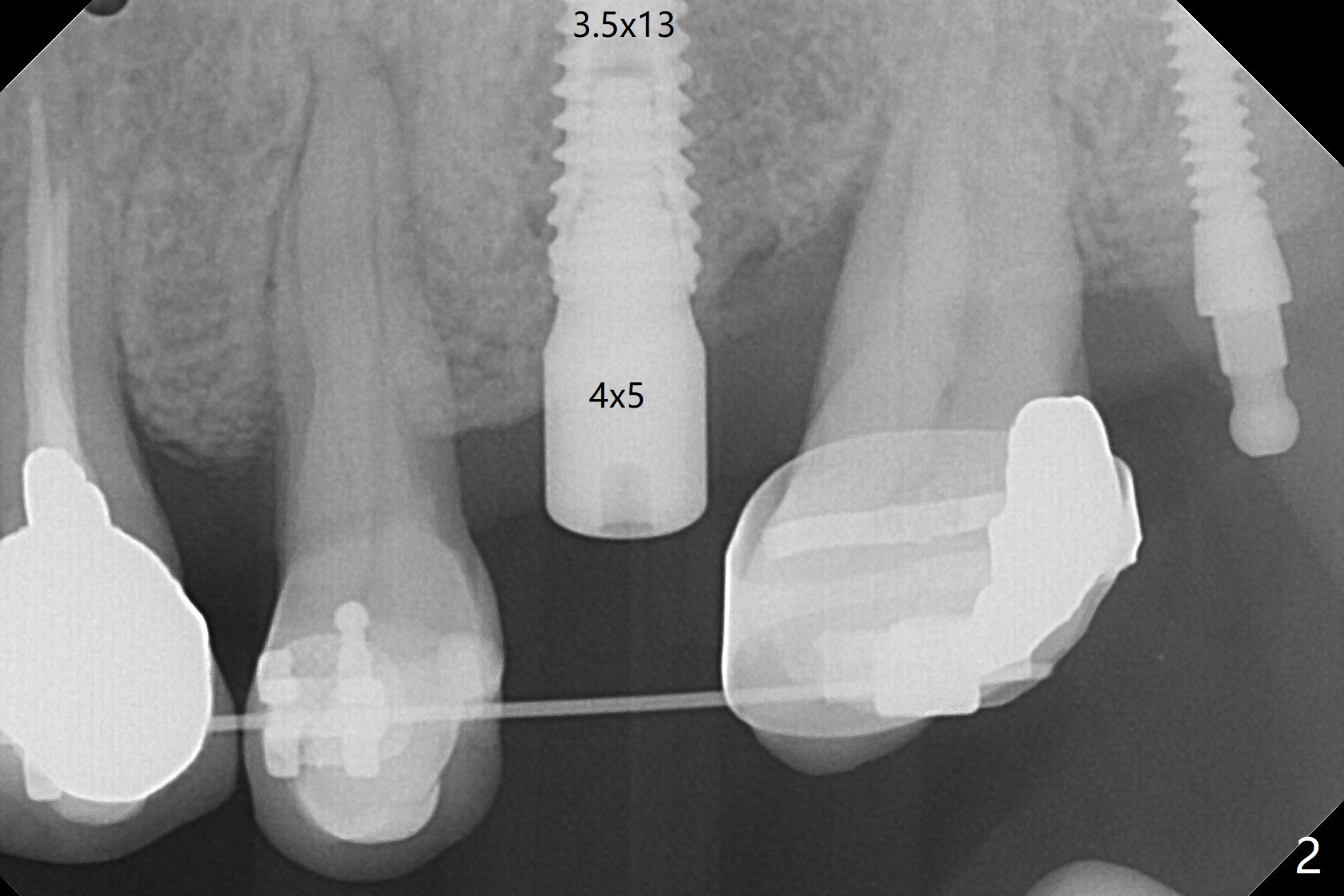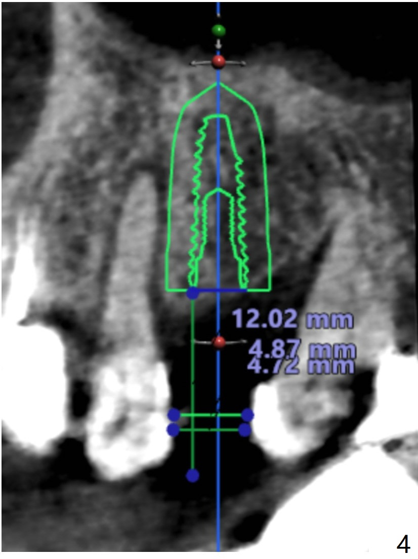 Eight-month limited ortho including use of a 1-piece implant (Fig.3 P (ball type)) as a distal anchor increases the mesiodistal space of #14 from <4 mm to 6 mm (near premolar width). Guided surgery is not indicated because of presence of brackets and band and the narrow space. Also due to the latter, incision is difficult to make. In stead a 3.5 mm tissue punch is applied. After 2.2 mm drill, a parallel pin is placed; it appears that the initial osteotomy is palatal (Fig.1). Lindamann bur is adopted to move the osteotomy buccal. The last drill (3 mm for 3.5 mm implant) has no resistance when it enters the buccalized osteotomy. A longer implant than designed is placed (3.5x13 mm, Fig.2,3, close to the sinus floor (dashed yellow line) with 50 Ncm. When the implant osteointegrates, it will be used a mesial anchor to distalize the 2nd molar.