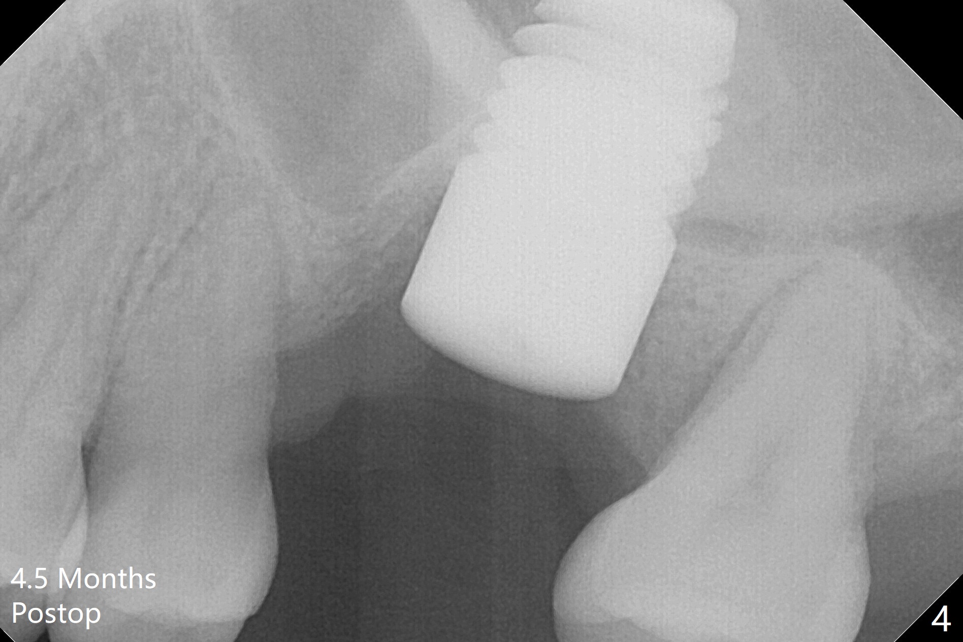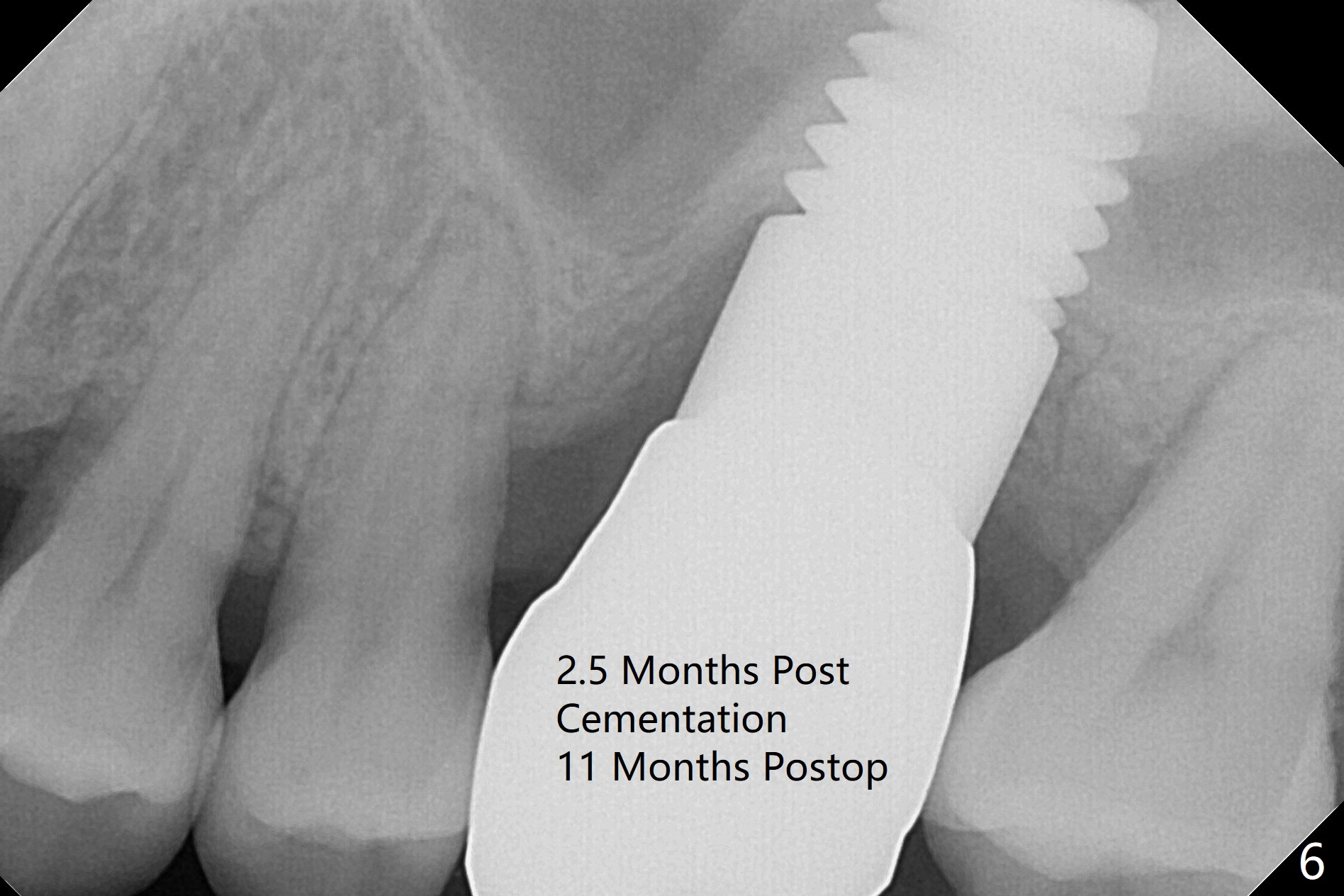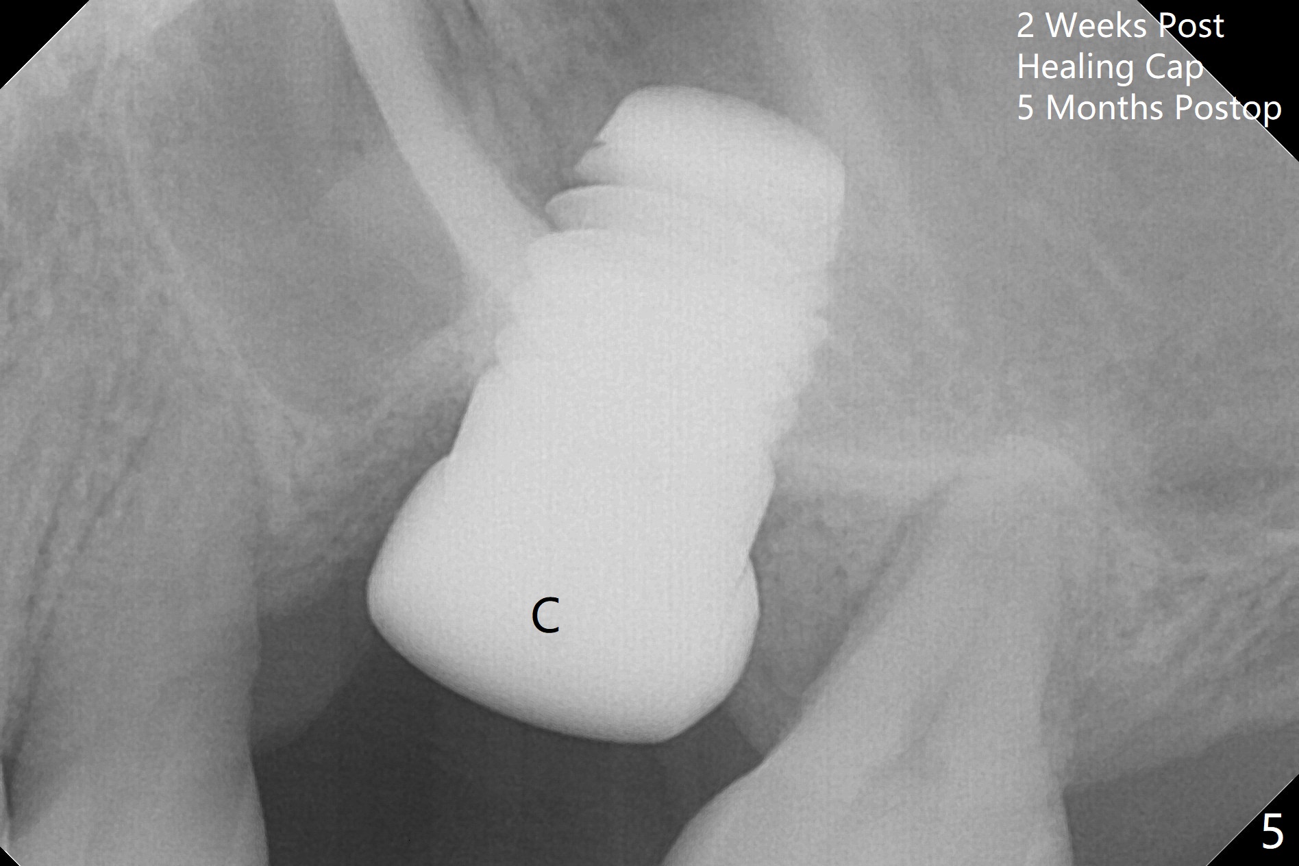 Three months post cementation, the implant at #14 is found loose (Fig.1: 6.5x11 mm) and removed. After removal of minimal granulation tissue, normal saline disappears into the apical end of osteotomy. In fact there is no bone apically, although the sinus membrane is intact. After try in of various taps (tapered and cylindrical, bone- and tissue-level), a 8x14 mm dummy implant is placed (Fig.2), followed by Osteogen plug and the same sized definitive implant, which has to be placed deeper to obtain ~ 45 Ncm (Fig.3). There is minimal thread engagement. If the implant fails, place 2 layers of PRF membrane apically, bone graft and 1 layer of PRF coronally for ridge preservation. A healing abutment will be placed to expose the coronal end of the implant ~ 4 months postop. The tissue-level implant remains subgingival 4.5 months postop (Fig.4). A 8 mm healing cuff cannot be placed even after laser gingivectomy. The implant is 2 mm subcrestal mesially. Torque wrench cannot reverse the implant at 60 Ncm. The implant is later reversed with Tatum wrench until it is turned with the torque wrench at 30 Ncm. The implant remains stable, while the healing cuff with Triple Antibiotic Ointment is placed. The healing cuff is stable 2 weeks later (Fig.5 C). With progressive loading for a month, a crown is cemented 9 months postop. There appears no bone loss 2.5 months post cementation (11 months postop, Fig.6). Return to Upper Molar Immediate Implant, Armaments, IBS #3 Xin Wei, DDS, PhD, MS 1st edition 04/30/2018, last revision 04/14/2019