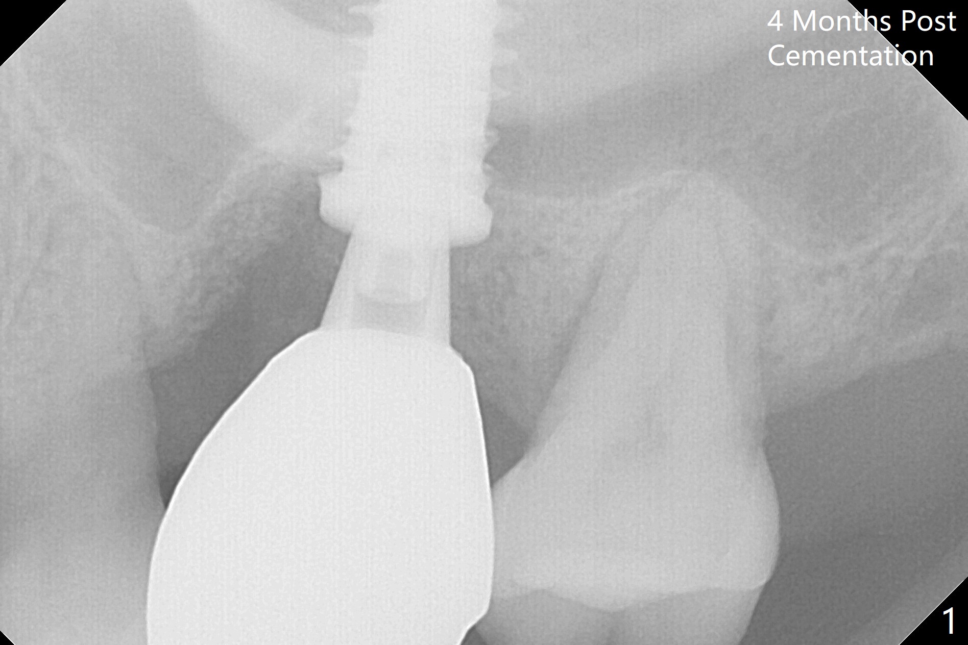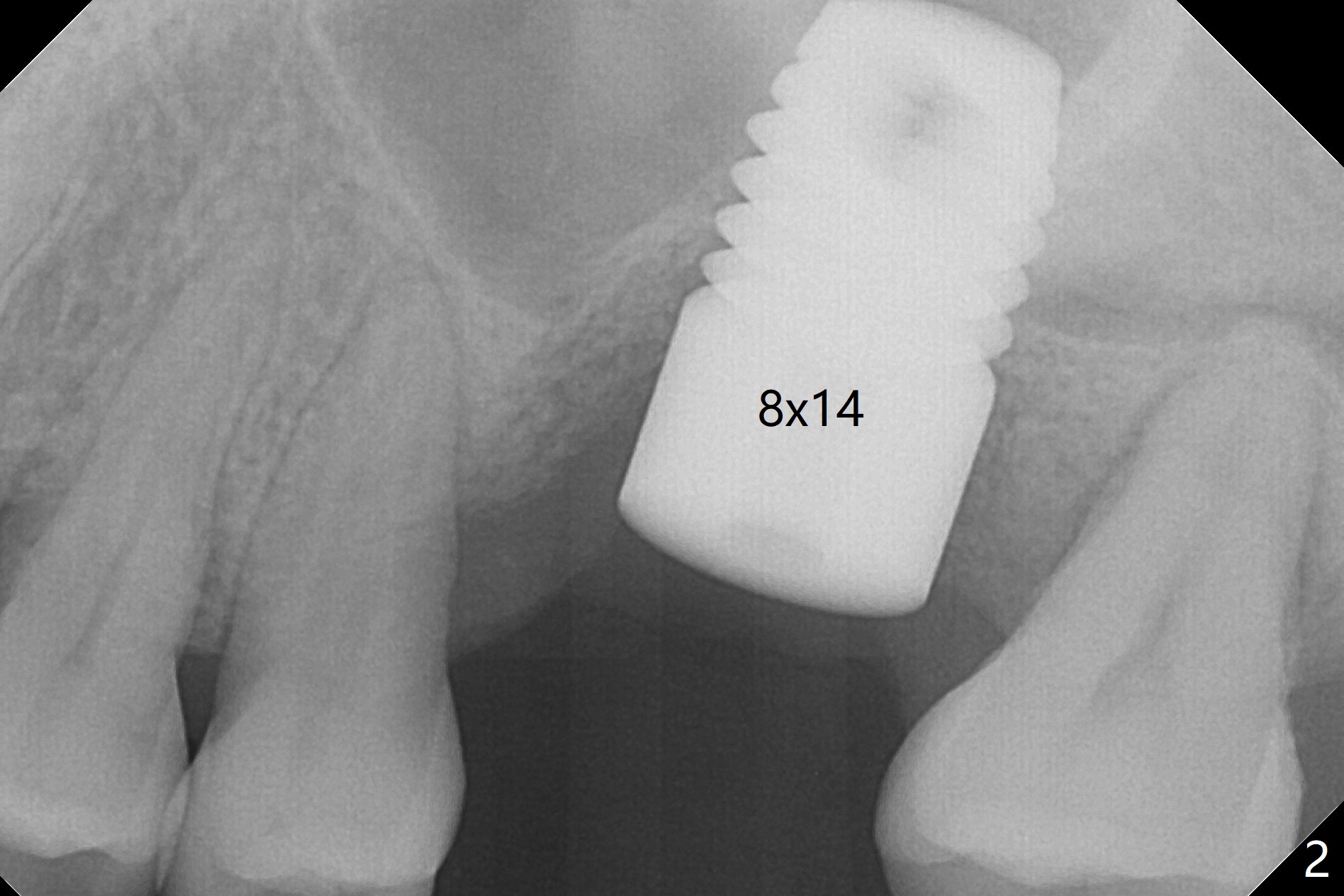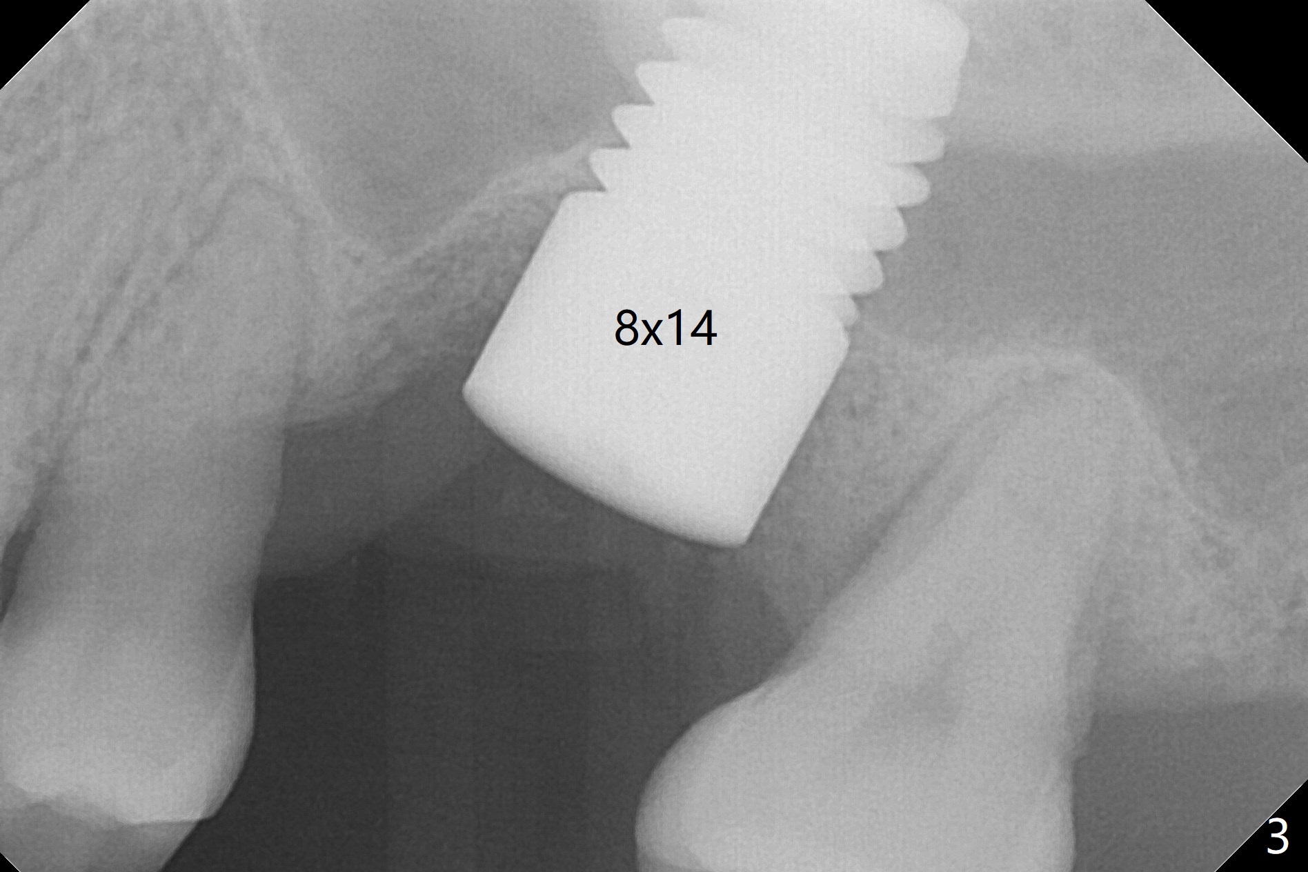 Three months post cementation, the implant at #14 is found loose (Fig.1: 6.5x11 mm) and removed. After removal of minimal granulation tissue, normal saline disappears into the apical end of osteotomy. In fact there is no bone apically, although the sinus membrane is intact. After try in of various taps (tapered and cylindrical, bone- and tissue-level), a 8x14 mm dummy implant is placed (Fig.2), followed by Osteogen plug and the same sized definitive implant, which has to be placed deeper to obtain ~ 45 Ncm (Fig.3). There is minimal thread engagement. If the implant fails, place 2 layers of PRF membrane apically, bone graft and 1 layer of PRF coronally for ridge preservation. A healing abutment will be placed to expose the coronal end of the implant ~ 4 months postop. The tissue-level implant remains subgingival 4.5 months postop (Fig.4). A 8 mm healing cuff cannot be placed even after laser gingivectomy. The implant is 2 mm subcrestal mesially. Torque wrench cannot reverse the implant at 60 Ncm. The implant is later reversed with Tatum wrench until it is turned with the torque wrench at 30 Ncm. The implant remains stable, while the healing cuff with Triple Antibiotic Ointment is placed. The healing cuff is stable 2 weeks later (Fig.5 C). With progressive loading for a month, a crown is cemented 9 months postop. There appears no bone loss 2.5 months post cementation (11 months postop, Fig.6). Return to Upper Molar Immediate Implant, Armaments, IBS #3 Xin Wei, DDS, PhD, MS 1st edition 04/30/2018, last revision 04/14/2019