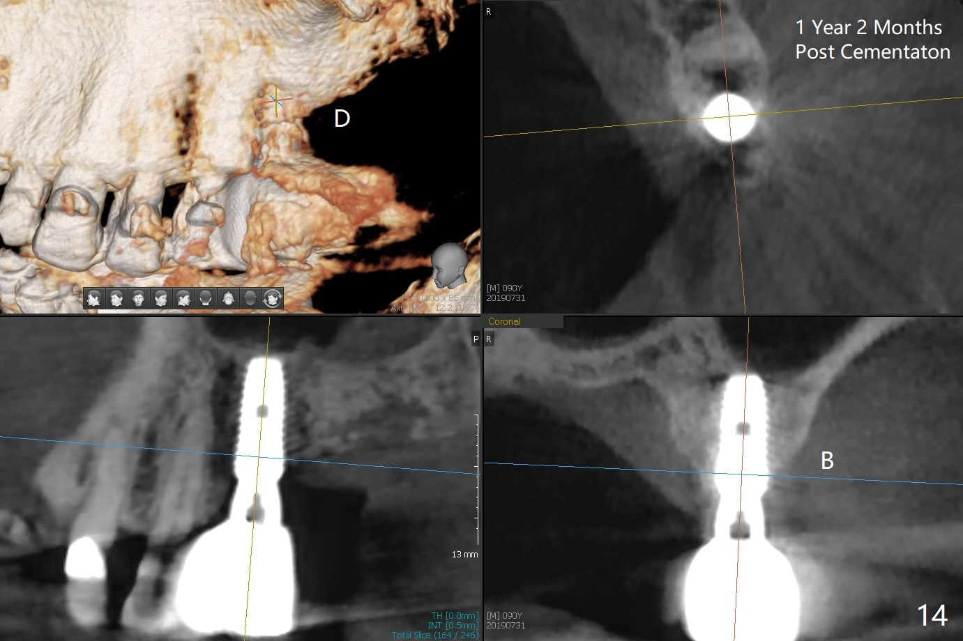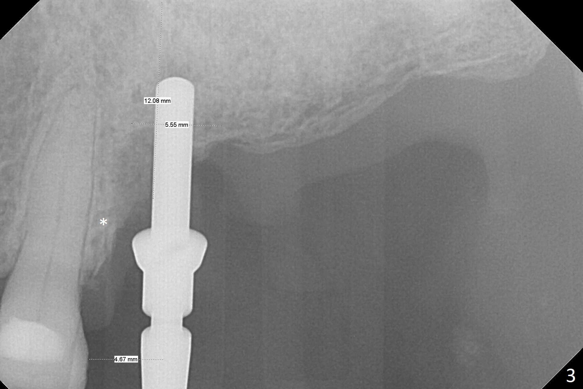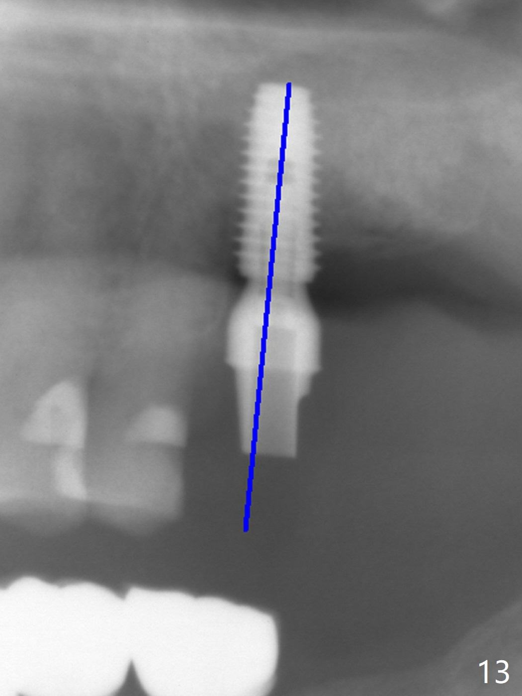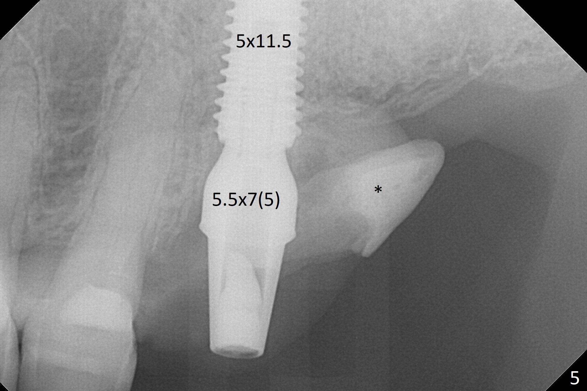 The septum is found to be pointed after extraction of the tooth #14 (Fig.1 *). The septum is flattened with Rongeur (Fig.2 *) prior to osteotomy. Because of interference of the mesial bone (Fig.3 *), osteotomy does not reach the depth with use of stopper. Without the latter, a 5x11.5 mm implant barely penetrates the sinus floor (Fig.4 (no postop nasal hemorrhage)). Also due to the mesial bone interference, a 6.5 mm abutment is not seated. Finally a 5.5x7(5) mm abutment is placed for an immediate provisional. Periodontal dressing is applied to cover the buccal repaired gingiva (Fig.5 *). There is minimal thread exposure after removal of the provisional nearly 2 months postop (Fig.6). The provisional does not return for easy self cleansing. In fact this is not an easy task, because of the posterior position (Fig.8 (after Piezo scaling)). The distal implant remains exposed; the abutment is removed and a healing screw is placed (Fig.9). The implant should have been subcrestal distally (Fig.7 <, nearly 3 months postop). One month later, the implant seems to be buried (Fig.10). The straight abutment is changed to an angled one (4.5 x15 degree A (5) mm) before impression retake (Fig.11,12 (<, dashed line: access hole)). The implant should have been placed more mesial (Fig.13). Surgical guide is needed. There is no implant exposure clinically or in CBCT sections 1 year 2 months post cementaton (Fig.14), although 3 D image suggests missing distopalatal plate (Fig.15).