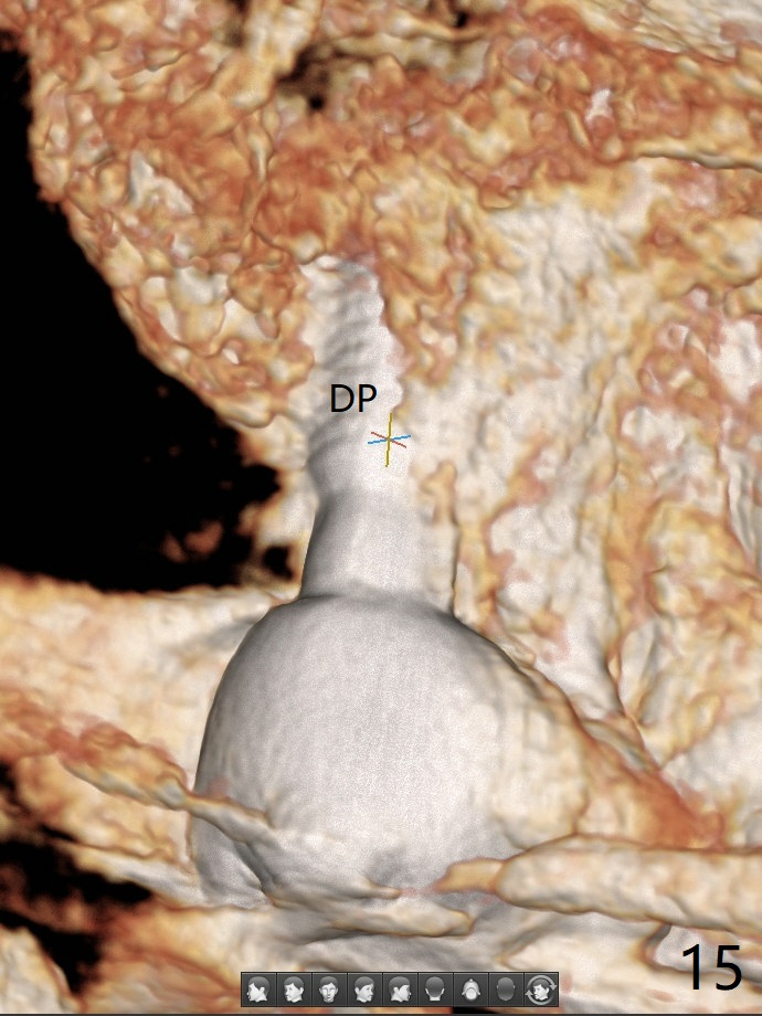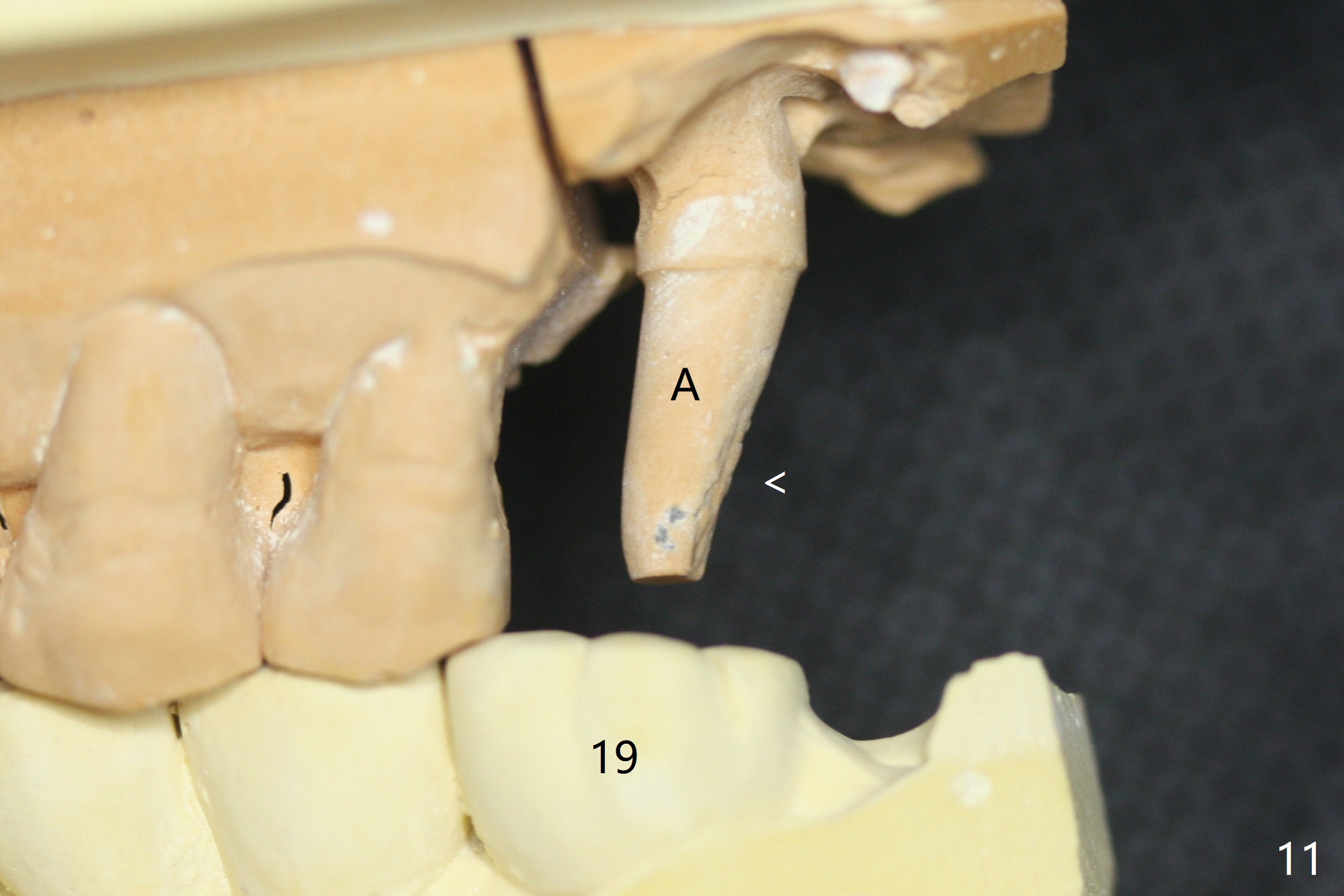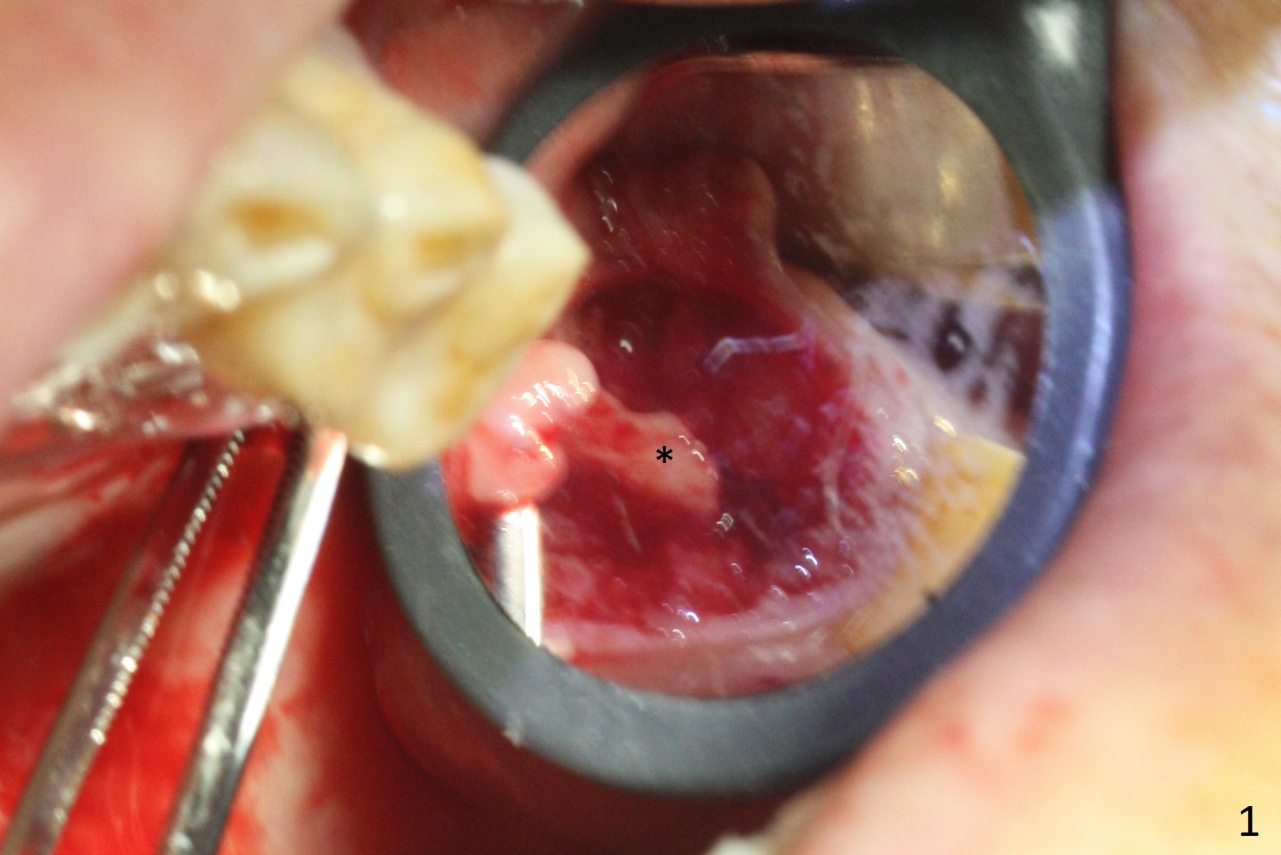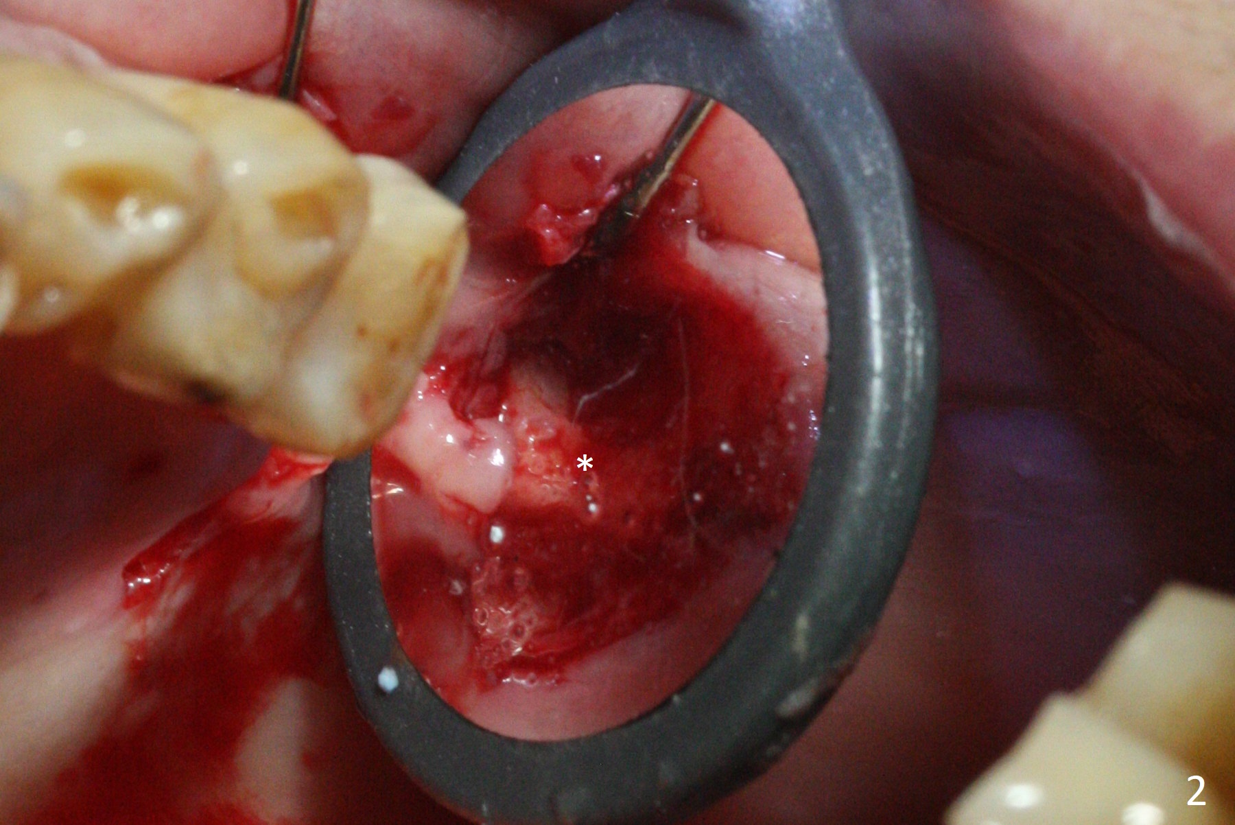 The septum is found to be pointed after extraction of the tooth #14 (Fig.1 *). The septum is flattened with Rongeur (Fig.2 *) prior to osteotomy. Because of interference of the mesial bone (Fig.3 *), osteotomy does not reach the depth with use of stopper. Without the latter, a 5x11.5 mm implant barely penetrates the sinus floor (Fig.4 (no postop nasal hemorrhage)). Also due to the mesial bone interference, a 6.5 mm abutment is not seated. Finally a 5.5x7(5) mm abutment is placed for an immediate provisional. Periodontal dressing is applied to cover the buccal repaired gingiva (Fig.5 *). There is minimal thread exposure after removal of the provisional nearly 2 months postop (Fig.6). The provisional does not return for easy self cleansing. In fact this is not an easy task, because of the posterior position (Fig.8 (after Piezo scaling)). The distal implant remains exposed; the abutment is removed and a healing screw is placed (Fig.9). The implant should have been subcrestal distally (Fig.7 <, nearly 3 months postop). One month later, the implant seems to be buried (Fig.10). The straight abutment is changed to an angled one (4.5 x15 degree A (5) mm) before impression retake (Fig.11,12 (<, dashed line: access hole)). The implant should have been placed more mesial (Fig.13). Surgical guide is needed. There is no implant exposure clinically or in CBCT sections 1 year 2 months post cementaton (Fig.14), although 3 D image suggests missing distopalatal plate (Fig.15).