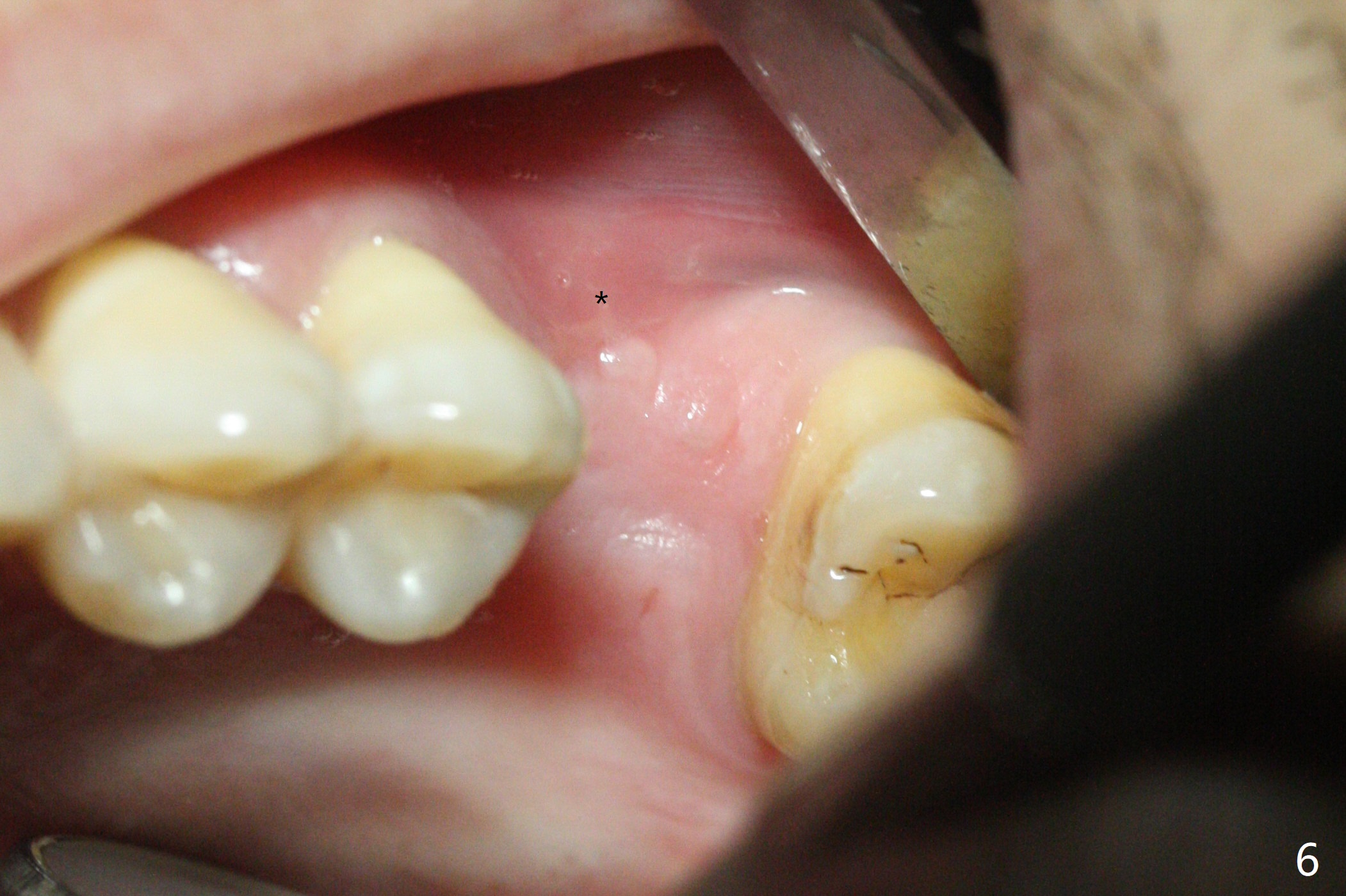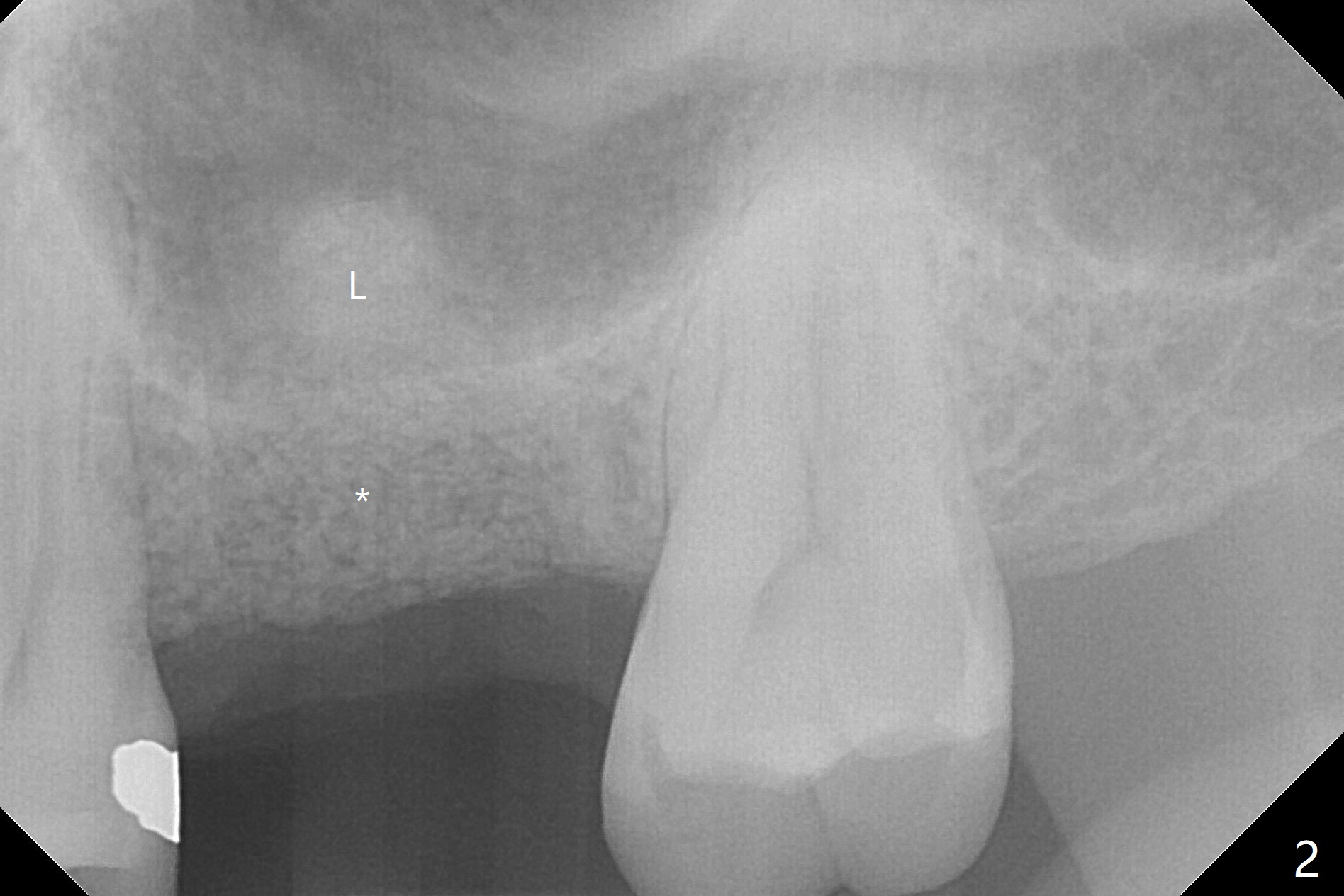 When the crown and abutment at #14 are removed, the implant is found to be shallowly placed. Upon incision, the implant threads are exposed circumferentially and coronal to the buccal crest (Fig.1 *). It seems to be difficult to expect bone regeneration post bone graft. The implant (6.4x6 mm) is removed with a 7/8 mm trephine bur, followed by sticky allograft (Fig.2 *), PRF membrane and 6-month membrane. In spite of the setback, the bone height increases from 3.9 mm to 11 mm due to sinus lift associated with the previous implant placement (Fig.2 L). The depth of the 2nd placement will be controlled by surgical guide. When the periodontal dressing dislodges 11 days postop, the 6-month membrane is lost as well as part of the bone graft. If there is remaining apical native bone, an immediate implant should be placed so that bone graft can be kept in place more securely with an immediate abutment and provisional! The seemingly conservative approach is actually not safe. The wound heals 1 month postop (following dislodgement of the 2nd periodontal dressing, Fig.3). Three months later, consider using bone expanders to do sinus lift and place a SM implant subcrestal. Take PA after 1st expander to the depth. The wound heals 4 months postop (Fig.4), but the bone height (Fig.5) and width (Fig.6) decreases. The latter continues to decrease 9 months postop (Fig.7,8), but bone density is high, average 1360 units. Preparation includes guide, incision, sinus lift, implant placement (possibly tissue-level (9) or FC if the sinus membrane perforates), bone graft, and suture.
