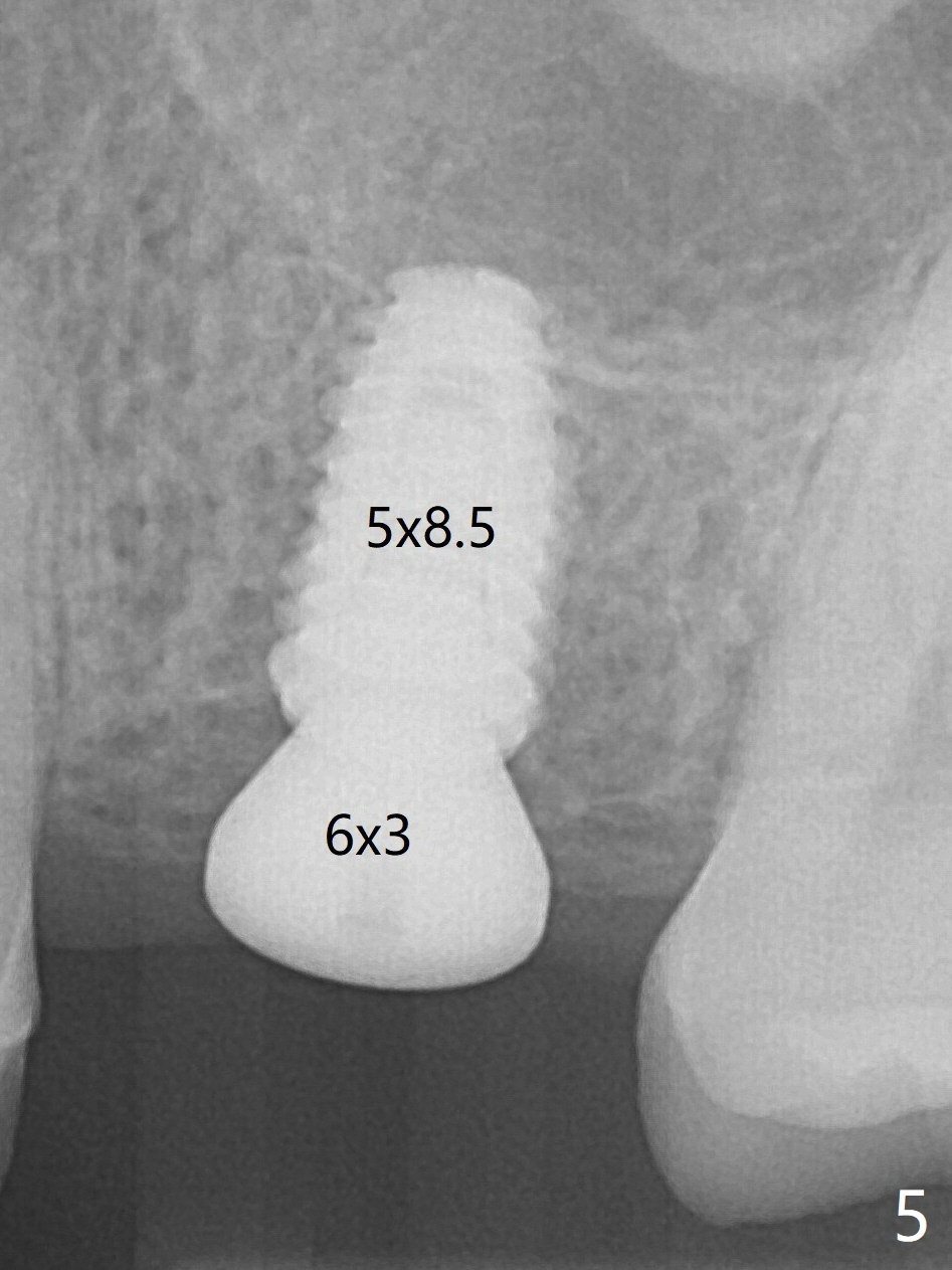 A 5x8.5 mm implant is placed with satisfactory insertion torque and depth, followed by insertion of a 6x3 mm healing abutment (Fig.5). There is mild resorption of the sinus floor distally 3.5 months postop, although the implant remains stable (Fig.6).