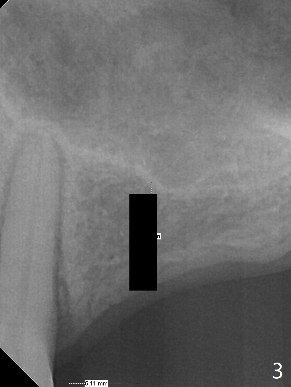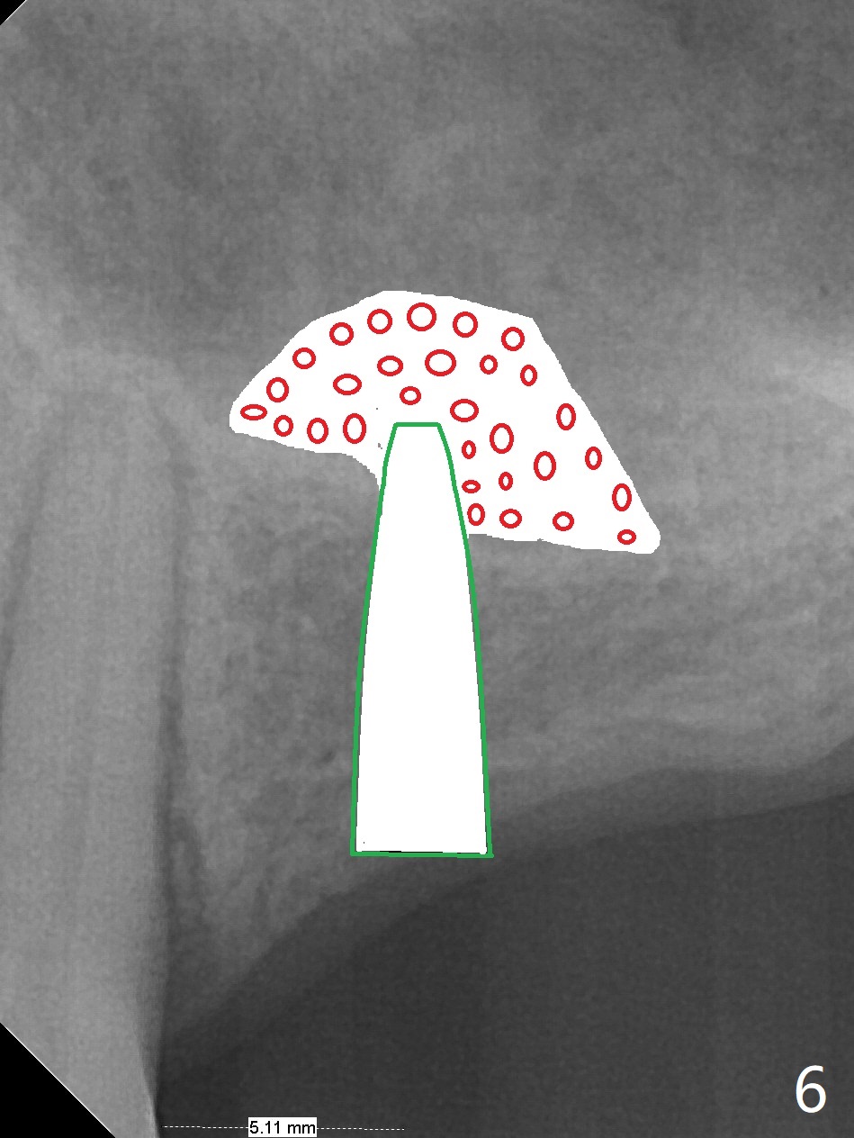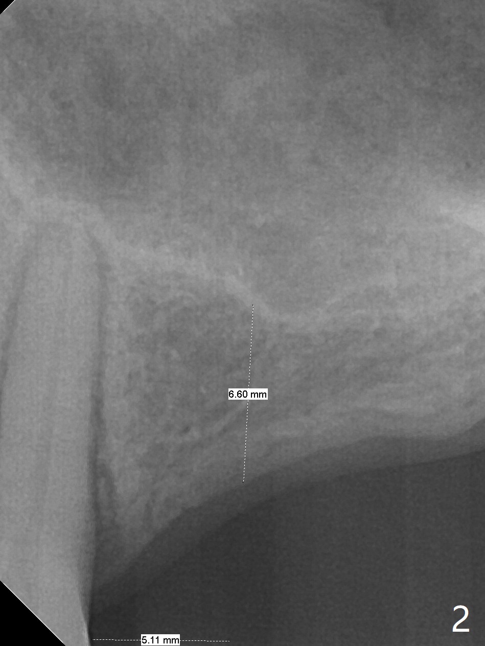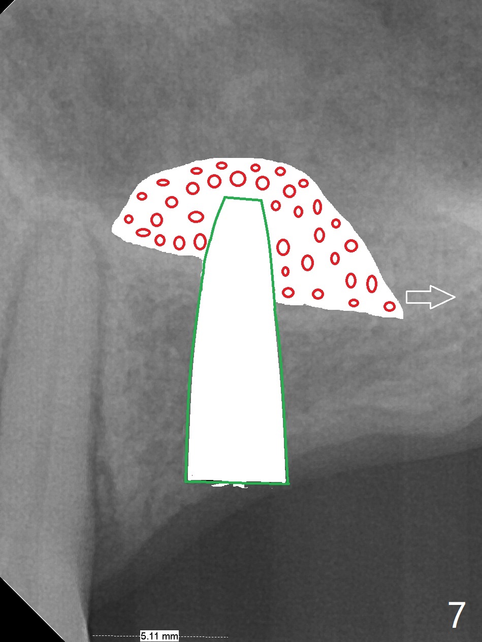 A 57-year-old woman has lost #14,15 and 18 for a while (Fig.1). Because of fear, an implant will be placed at #14 first (Fig.2). After use of Magic Drill for 5 mm (Fig.3), Magic Lifter will be used for lift (Fig.4). Following placement of PRF membrane (Fig.5 blue) and Vanilla Graft (red circles), a dummy implant is placed for additional lift (Fig.6 green). With placement of a larger and probably longer definitive implant, the graft may migrate distal due to gravity in sleep (Fig.7 arrow). In a few months, the bone height at #15 may increase to facilitate implant placement at #15.