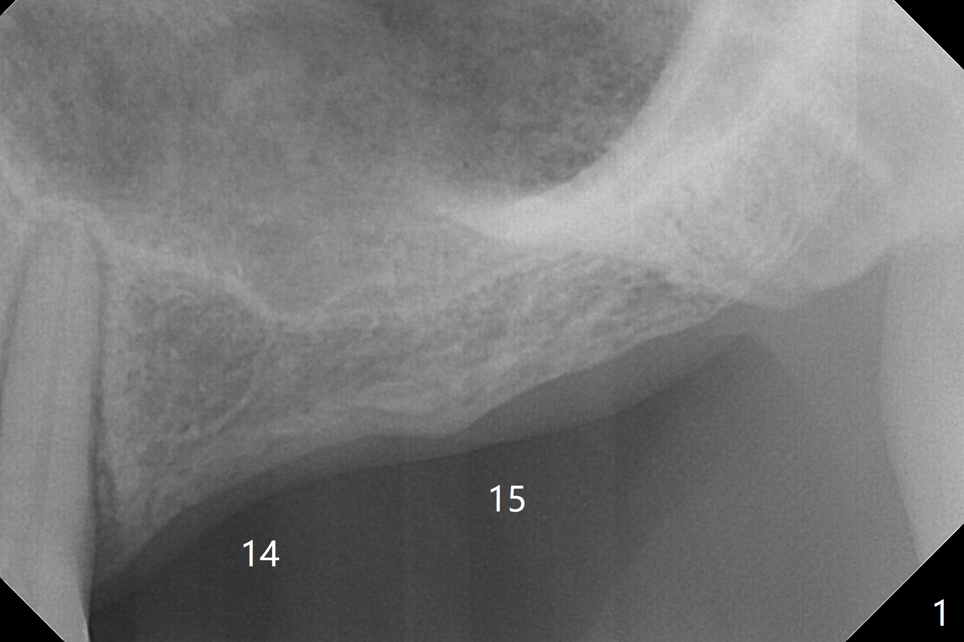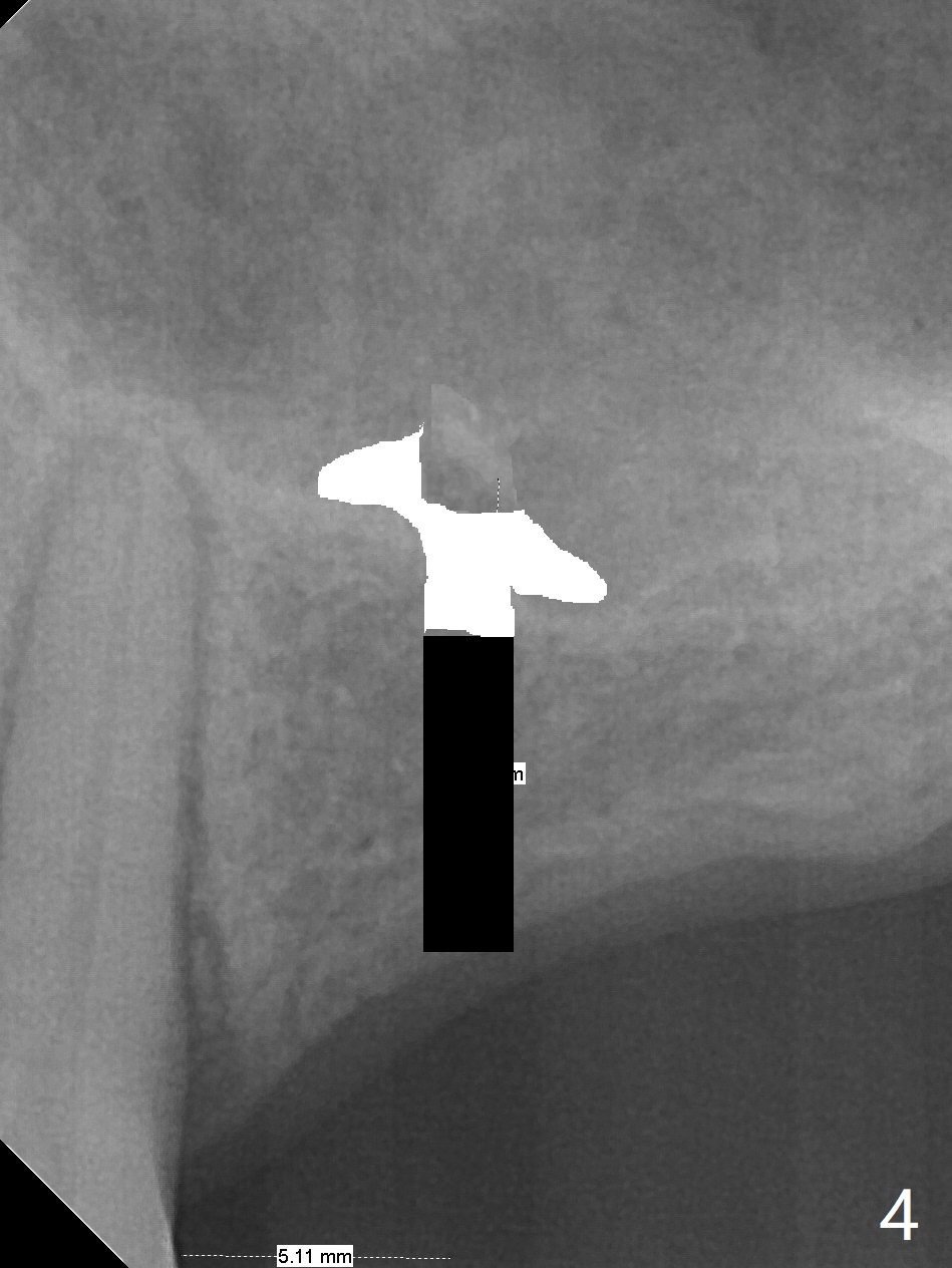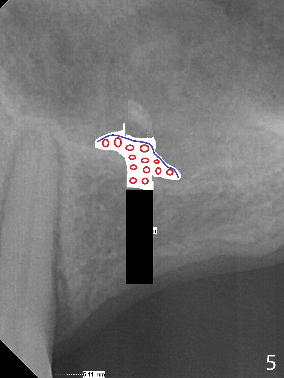 A 57-year-old woman has lost #14,15 and 18 for a while (Fig.1). Because of fear, an implant will be placed at #14 first (Fig.2). After use of Magic Drill for 5 mm (Fig.3), Magic Lifter will be used for lift (Fig.4). Following placement of PRF membrane (Fig.5 blue) and Vanilla Graft (red circles), a dummy implant is placed for additional lift (Fig.6 green). With placement of a larger and probably longer definitive implant, the graft may migrate distal due to gravity in sleep (Fig.7 arrow). In a few months, the bone height at #15 may increase to facilitate implant placement at #15.