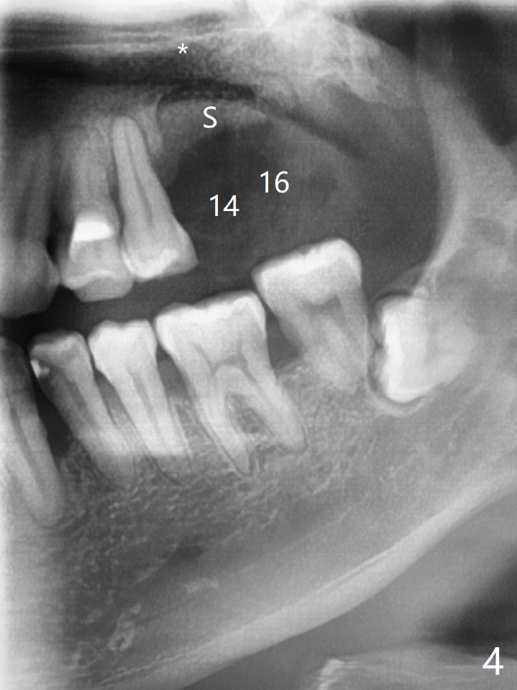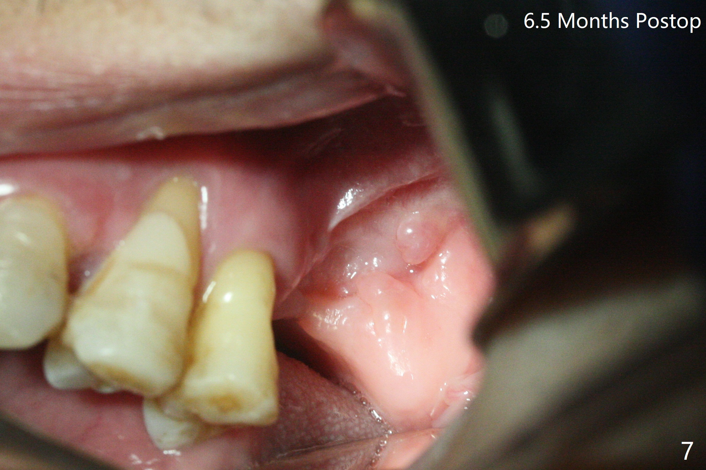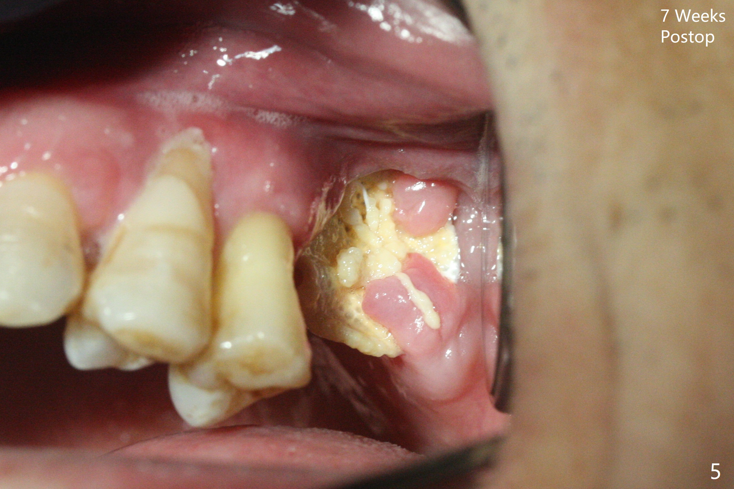 47岁男原本回诊所拔除近中左上智齿(16号牙),影响第一磨牙(14号牙)植牙周围炎治疗后卫生维护。事先制备PRF(图一,二)和骨块(图三 *),拔牙顺利,发现植牙螺纹依然暴露,决定取出植体,上颌窦底板缺失,但膜仿佛完整,放置一小块PRF于上颌窦底,促进上颌窦膜愈合,然后加入新的骨粉,与剩余上清液(图三 >)调袢,虽然不再形成粘性骨块,但是还有好处,放置于拔牙窝以及植牙窝(图四 *),浅部放置骨块(S),这样骨粉不容易丢失,表面再放置PRF膜和不可吸收膜(Cytoplast),使用PTFE缝线。术后7周Cytoplast几乎完全暴露(图五)。当它取出后,骨粉好像损失不少(图六)。二个月后再评价。术后6.5月第一磨牙区仍萎缩(图七),只好再植骨,在第三磨牙区安置一个tenting screw,也在第一磨牙区植入第二个钉子,但是不牢靠,因为仍处于纤维状,把它往上颌窦推作为上颌窦粘膜(图八:>),然后提升(*)。在第一,第三磨牙交界处打入第二个帐篷钉,在两个钉子周围放置粘性骨粉,覆盖PRF膜,缝合。估计植骨效果不佳,植牙时再植骨。