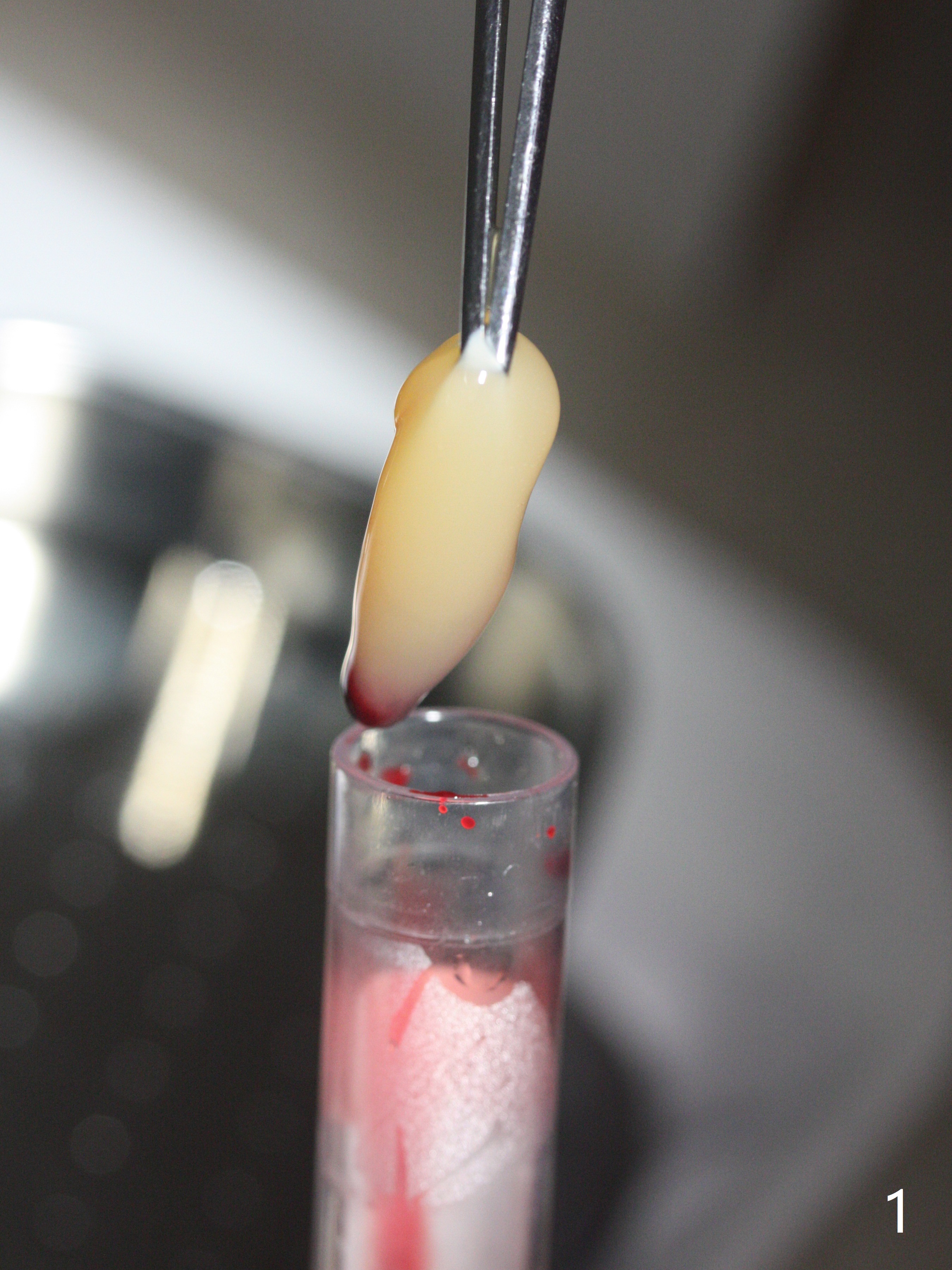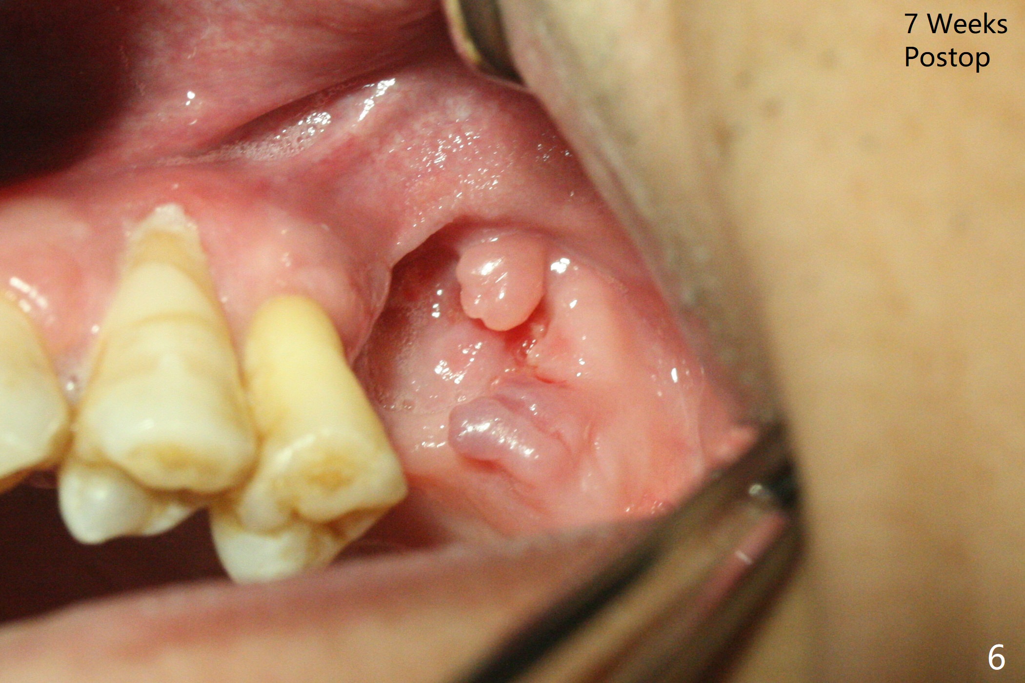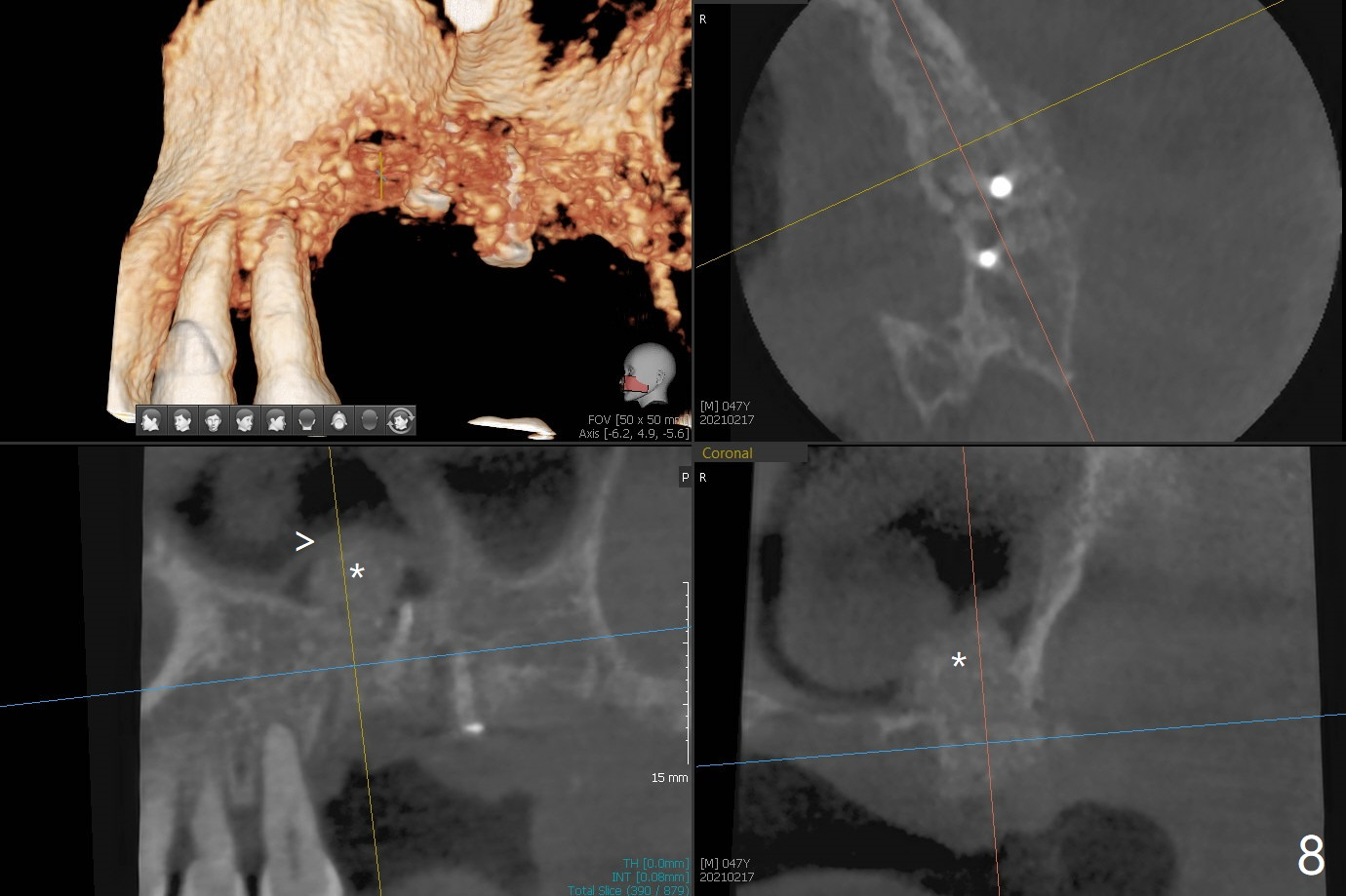 47岁男原本回诊所拔除近中左上智齿(16号牙),影响第一磨牙(14号牙)植牙周围炎治疗后卫生维护。事先制备PRF(图一,二)和骨块(图三 *),拔牙顺利,发现植牙螺纹依然暴露,决定取出植体,上颌窦底板缺失,但膜仿佛完整,放置一小块PRF于上颌窦底,促进上颌窦膜愈合,然后加入新的骨粉,与剩余上清液(图三 >)调袢,虽然不再形成粘性骨块,但是还有好处,放置于拔牙窝以及植牙窝(图四 *),浅部放置骨块(S),这样骨粉不容易丢失,表面再放置PRF膜和不可吸收膜(Cytoplast),使用PTFE缝线。术后7周Cytoplast几乎完全暴露(图五)。当它取出后,骨粉好像损失不少(图六)。二个月后再评价。术后6.5月第一磨牙区仍萎缩(图七),只好再植骨,在第三磨牙区安置一个tenting screw,也在第一磨牙区植入第二个钉子,但是不牢靠,因为仍处于纤维状,把它往上颌窦推作为上颌窦粘膜(图八:>),然后提升(*)。在第一,第三磨牙交界处打入第二个帐篷钉,在两个钉子周围放置粘性骨粉,覆盖PRF膜,缝合。估计植骨效果不佳,植牙时再植骨。