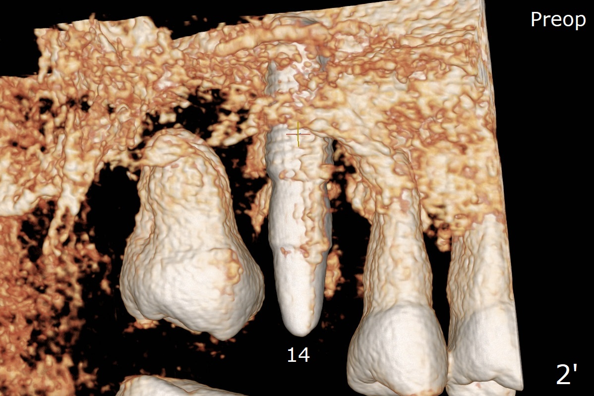 After debridement, use of Round Brush, buccal plate decortication and abutment retightening, sticky bone is placed around the exposure implant (I) threads and abutment (A) cuff amply (Fig.2 (3D image: lingual view) *, as compared to preop CT (Fig.2')).