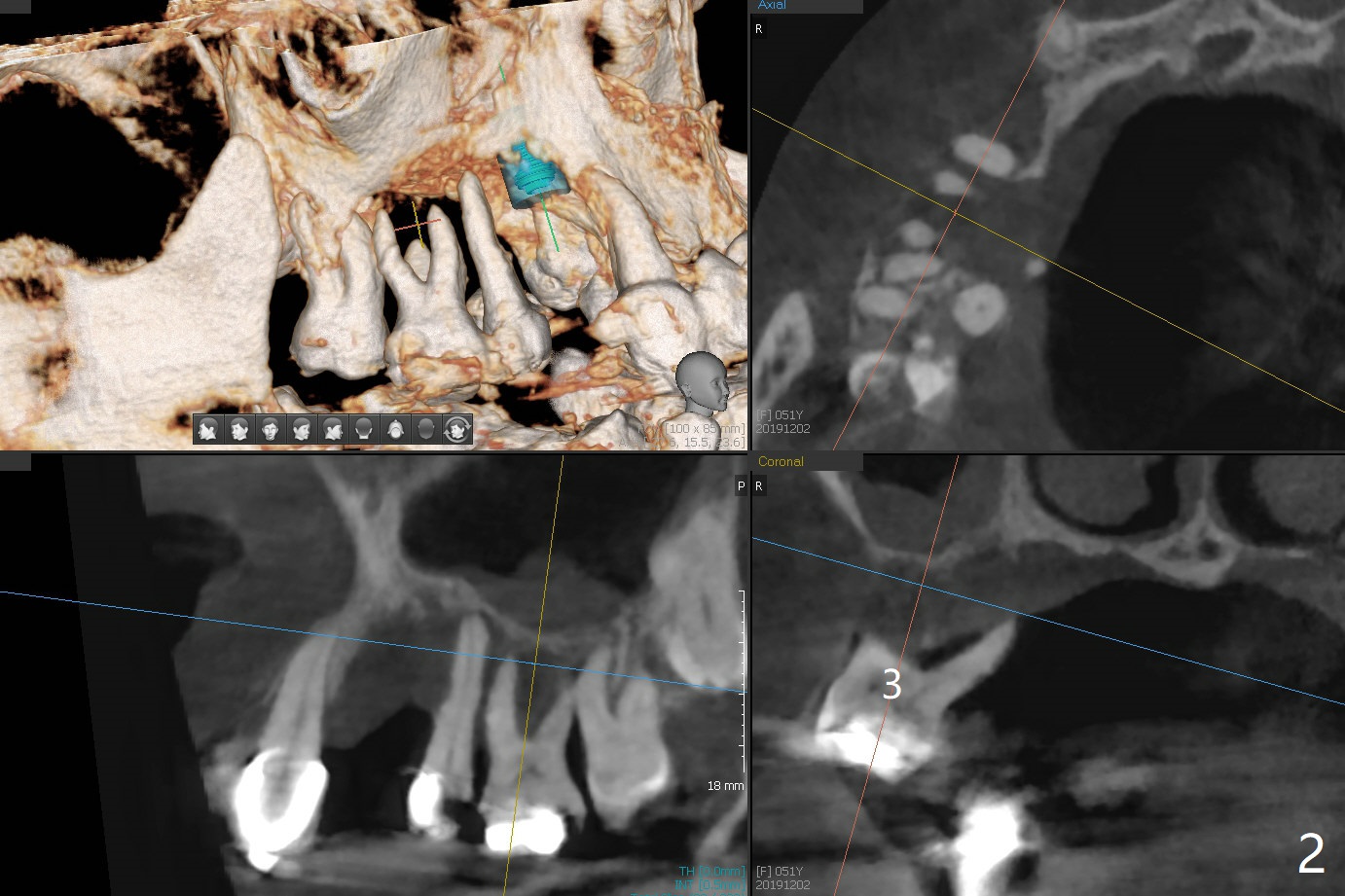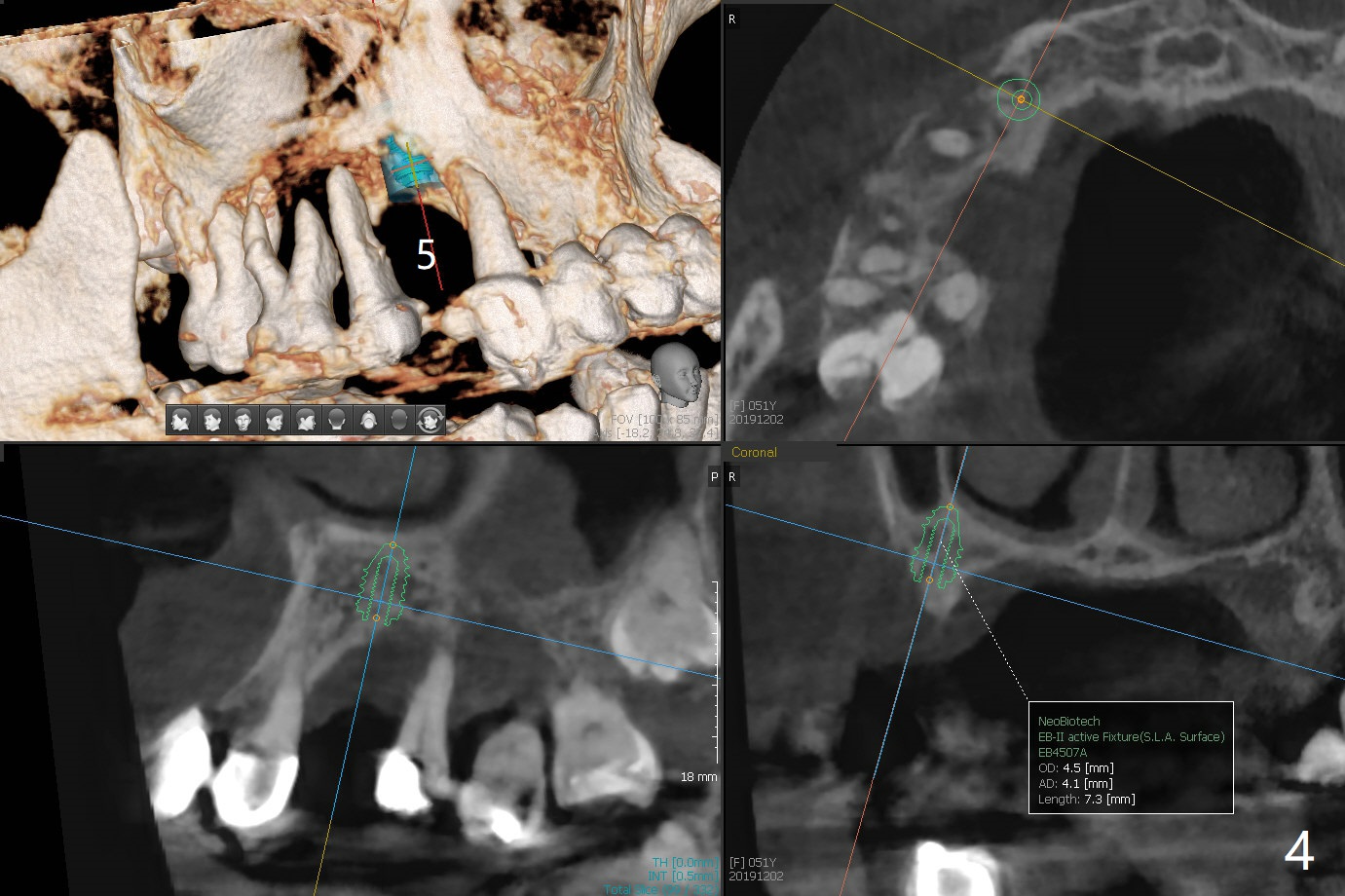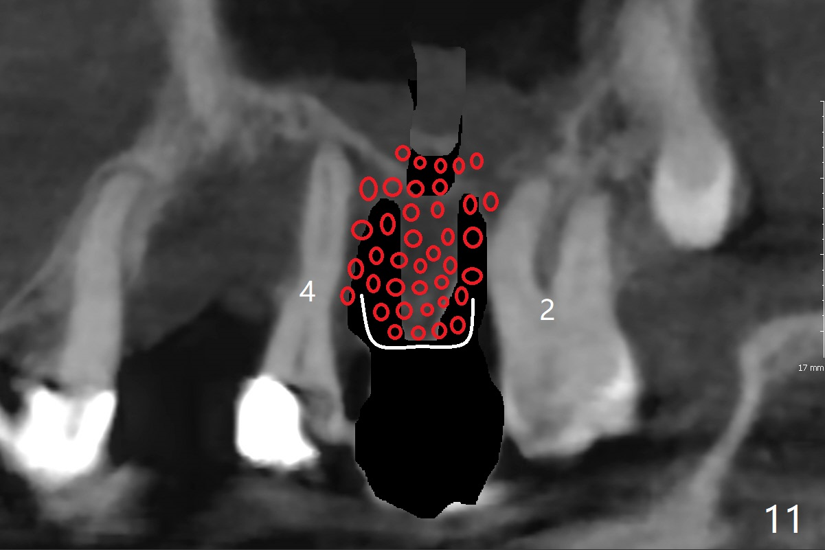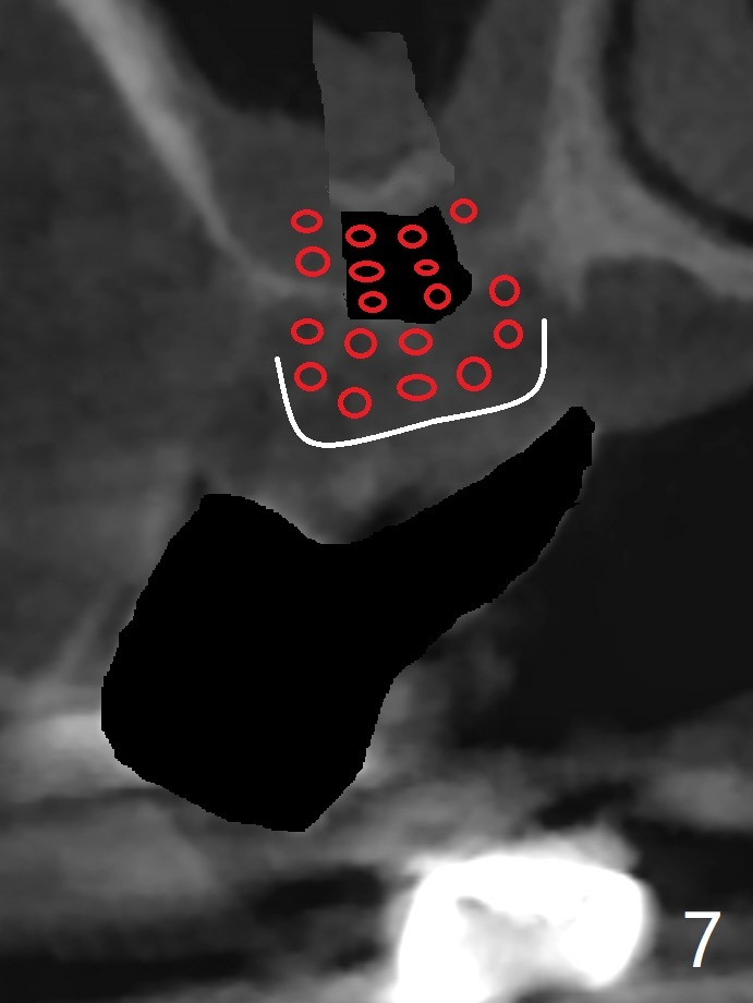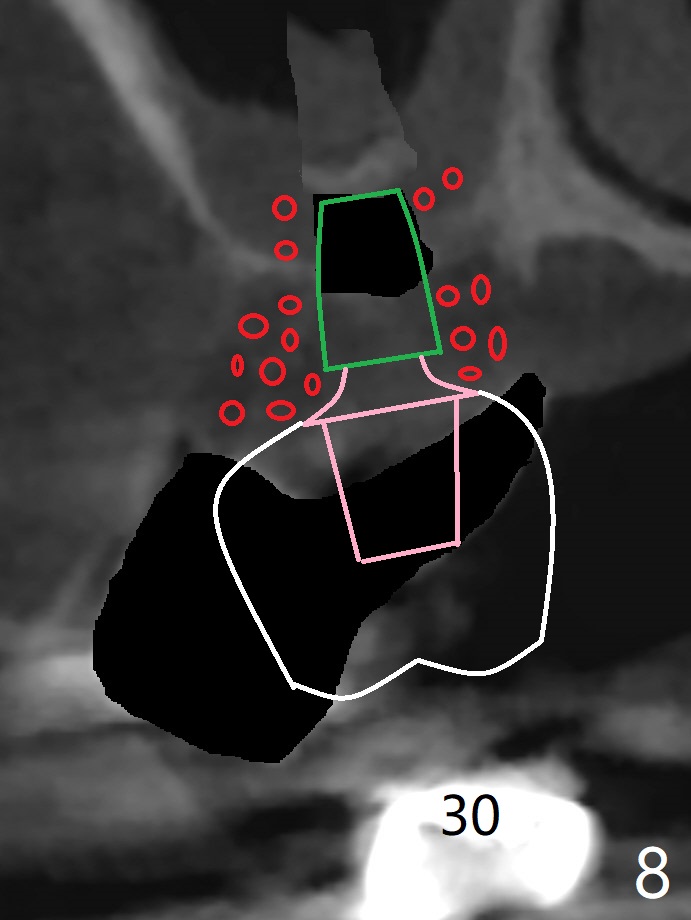 A 51-year-old woman has poor dentition with chronic periodontitis (Fig.1). She has financial constraint, but refuses RPD, insisting upon UR posterior implants first. After discussion of severe bone loss, she agrees with bone graft first (Fig.2-4). Since the bone atrophy is the most severe at #3 (Fig.5 coronal section; L: lingual), sinus lift (Fig.6 arrow) is conducted after extraction (black). Use sticky bone (Fig.7 red circles) and Titanium-reinforced Cytoplast (white) for socket preservation. Or if Magicore is able to achieve primary stability (Fig.8 green), an abutment (pink) will be placed for an immediate provisional (white). The latter are capable of holding bone graft in place. Since bone loss at #2 and 4 is less severe (Fig.9 sagittal section), their roots will act as walls to keep bone graft (Fig.11) in place after #3 extraction (Fig.10).