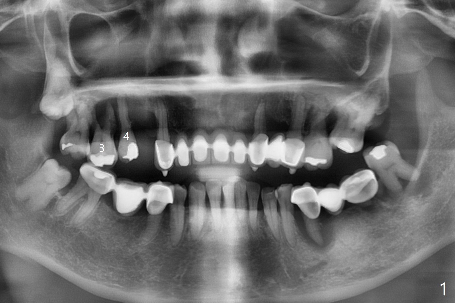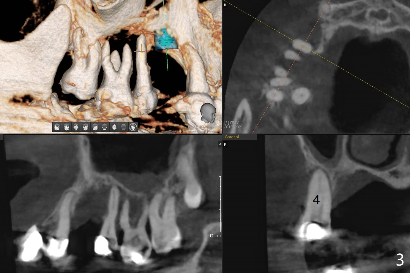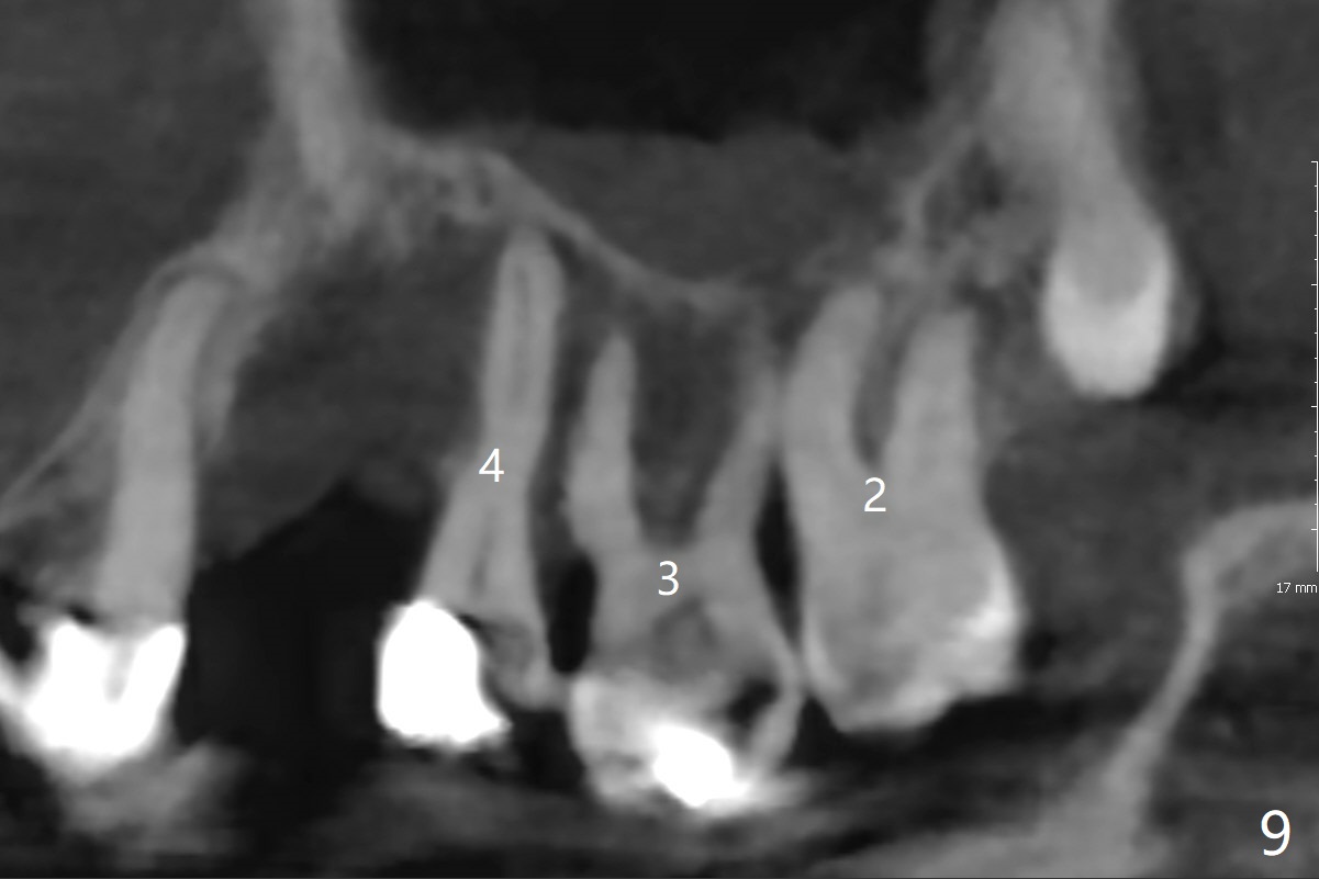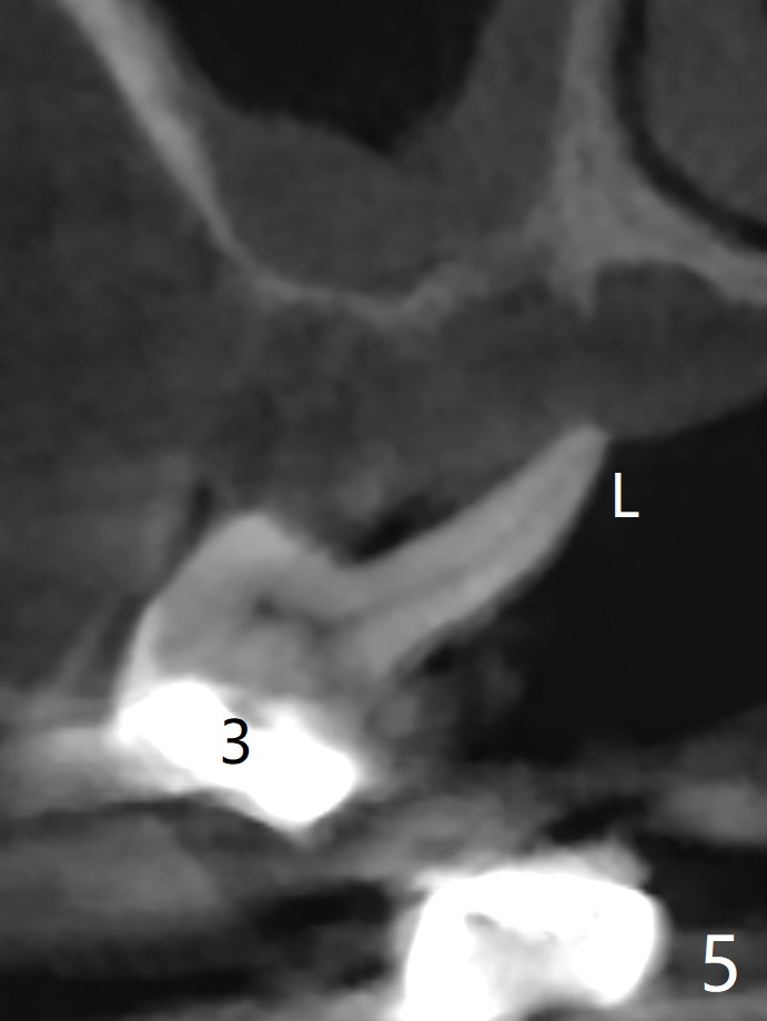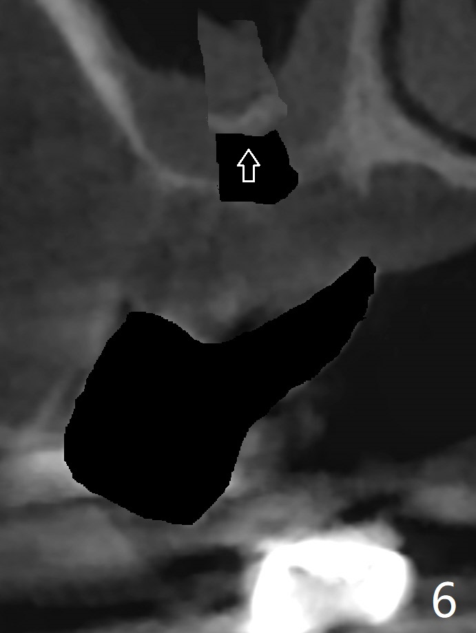 A 51-year-old woman has poor dentition with chronic periodontitis (Fig.1). She has financial constraint, but refuses RPD, insisting upon UR posterior implants first. After discussion of severe bone loss, she agrees with bone graft first (Fig.2-4). Since the bone atrophy is the most severe at #3 (Fig.5 coronal section; L: lingual), sinus lift (Fig.6 arrow) is conducted after extraction (black). Use sticky bone (Fig.7 red circles) and Titanium-reinforced Cytoplast (white) for socket preservation. Or if Magicore is able to achieve primary stability (Fig.8 green), an abutment (pink) will be placed for an immediate provisional (white). The latter are capable of holding bone graft in place. Since bone loss at #2 and 4 is less severe (Fig.9 sagittal section), their roots will act as walls to keep bone graft (Fig.11) in place after #3 extraction (Fig.10).
