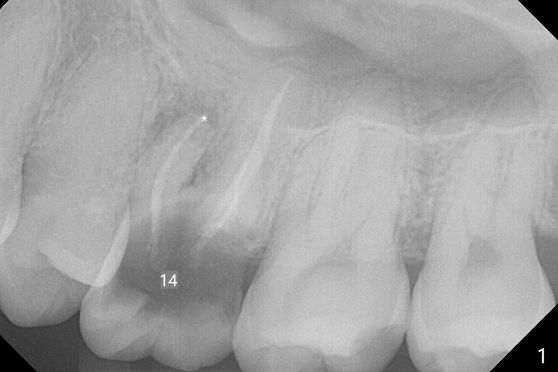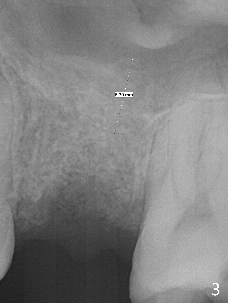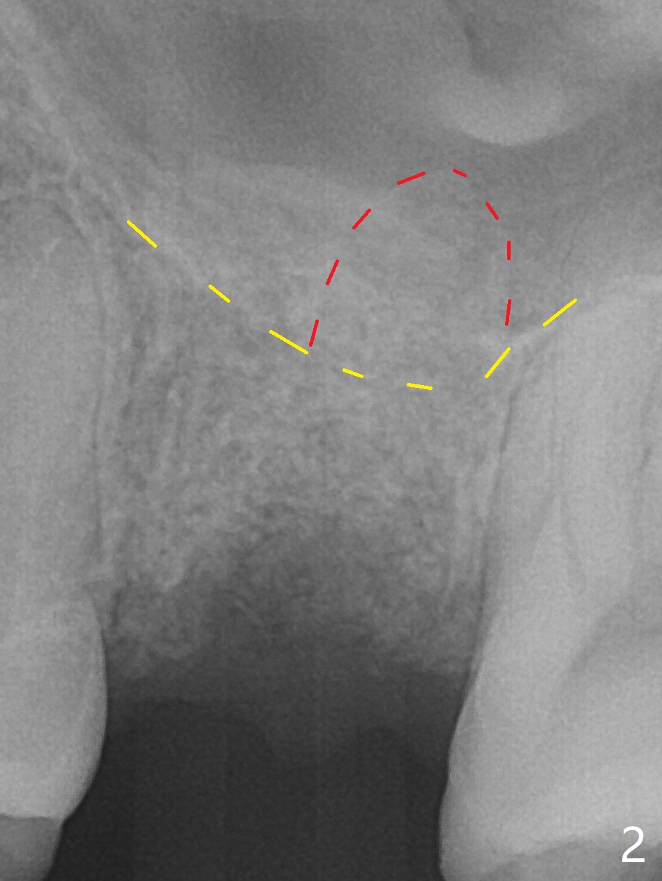 A 38-year-old woman requests extraction of the tooth #14 with mesiobuccal fistula (Fig.1). After extraction, the buccal plate is found to be defective. Bone graft enters the apex of the palatal root (Fig.2 red dashed line) so that the bone height increases by 6 mm (Fig.3). Following placement of collagen plug and suturing, acrylic dressing is applied to the undercuts of the neighboring teeth for retention.