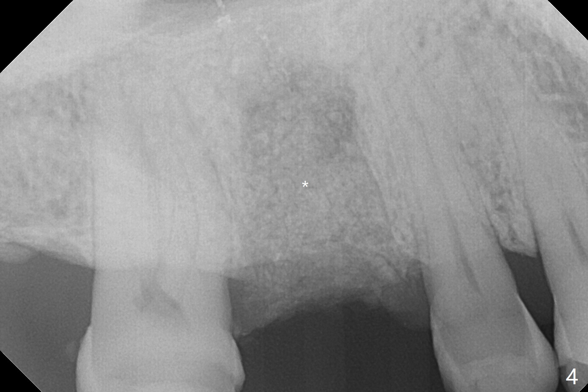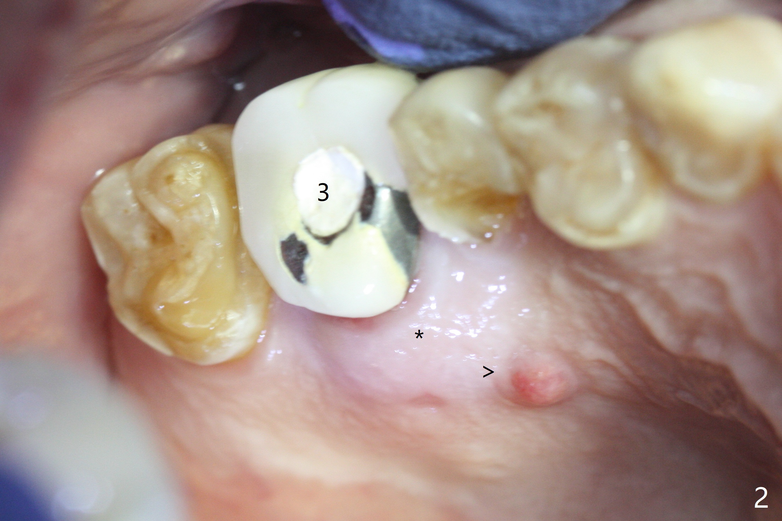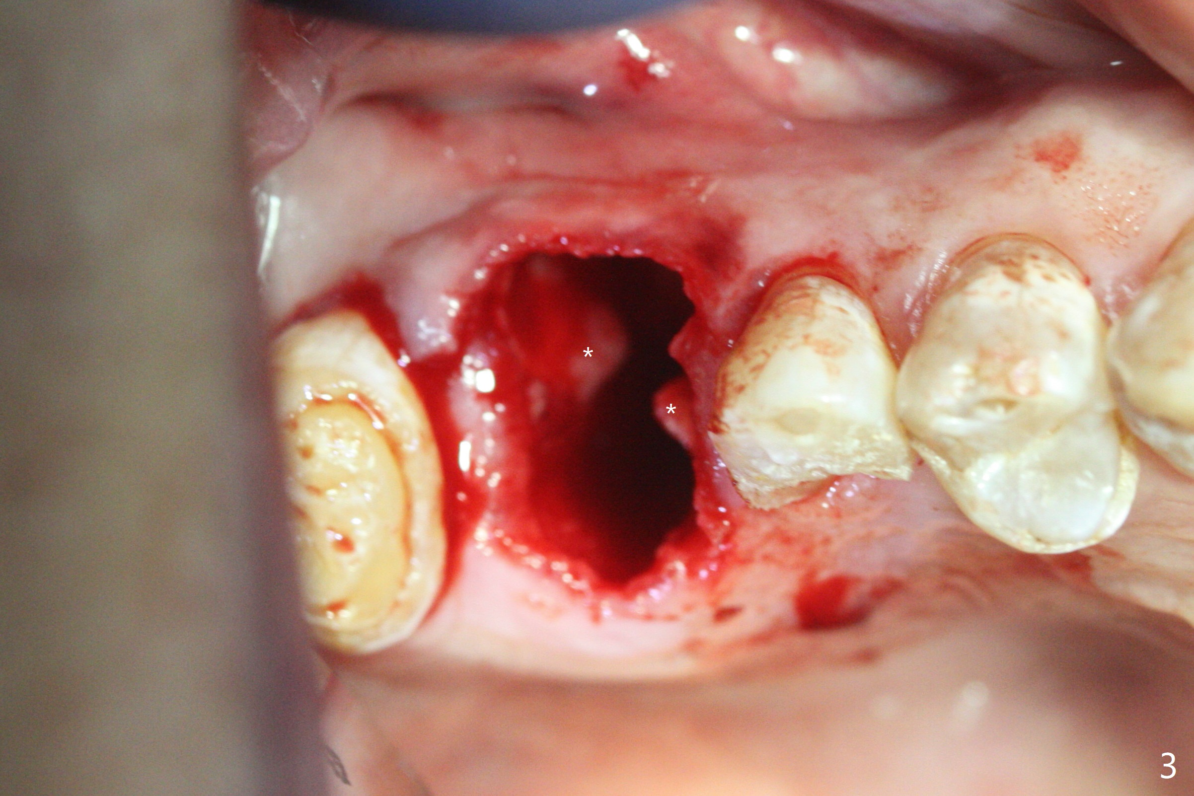 A 56-year-old man with signs of bruxism (multiple occlusal wear and tear, Fig.1) returns from an endodontist office because of failed RCT retreatment at #3 (Fig.2 (* palatal swelling; > fistula)). After difficult extraction, the socket is large without much septal bone (Fig.3 *). Because of lack of the apical native bone, immediate implant is not placed. If it has to be done, a large and long one is required. Instead socket preservation is finished (Fig.4 *). The socket is 20 mm deep, while the shank of surgical curettes is 20 mm. It appears that the most apical granulation tissue is hard to be removed. When 7-day oral Clindamycin is finished, the patient returns with chief complaint of recurrent pain and fistulae. In fact the palatal fistulae are flat without erythema. He returns asymptomatic 2 weeks postop; the fistulae are disappearing (Fig.5 ^) and the socket is healing (Fig.6).