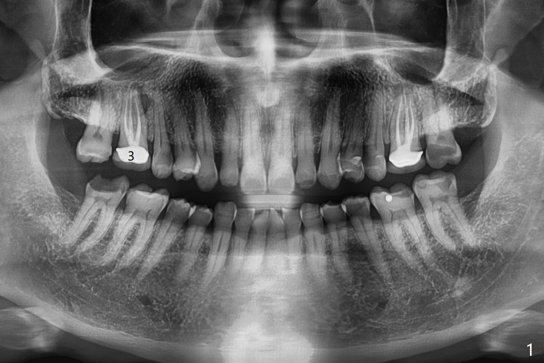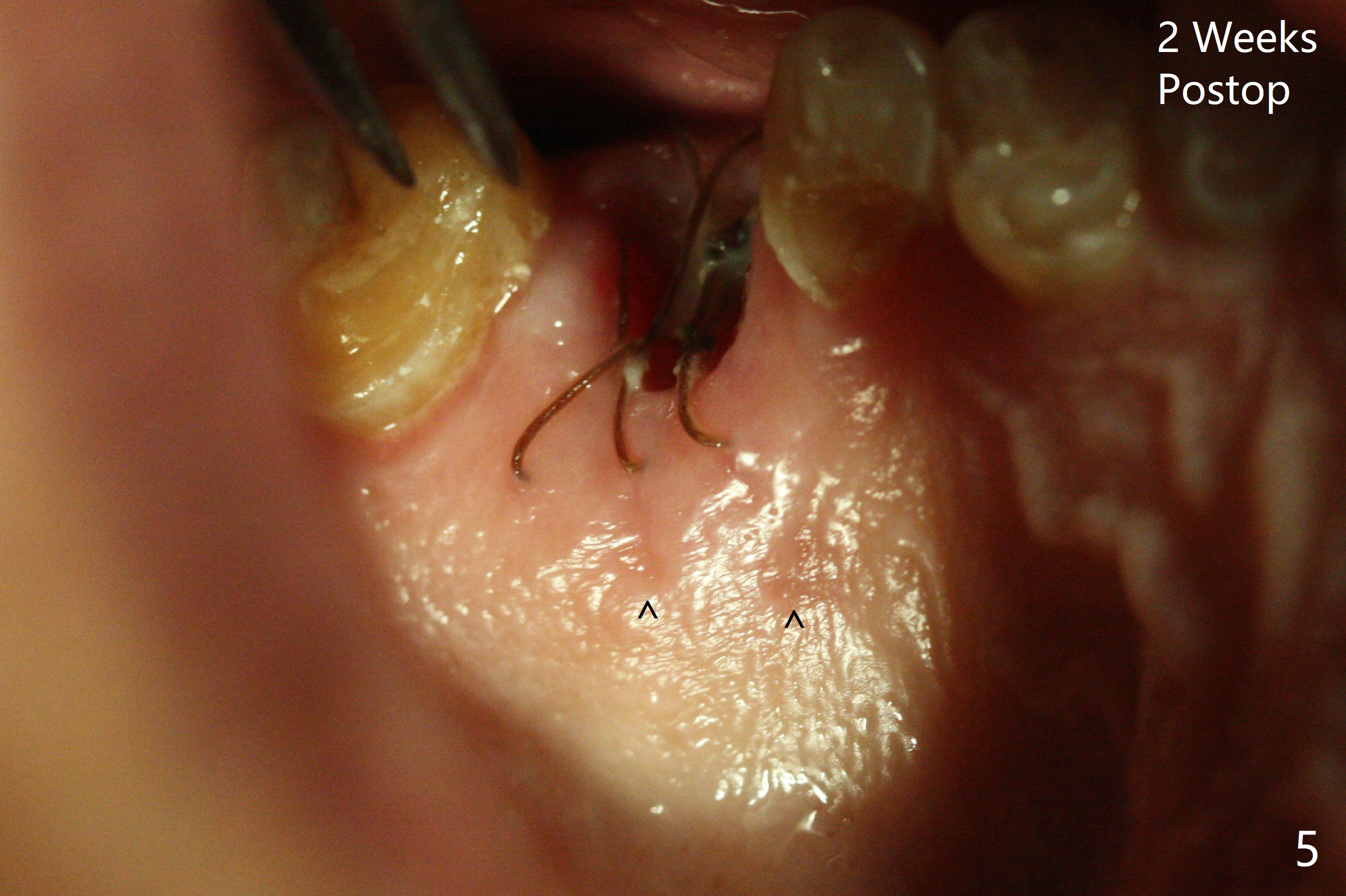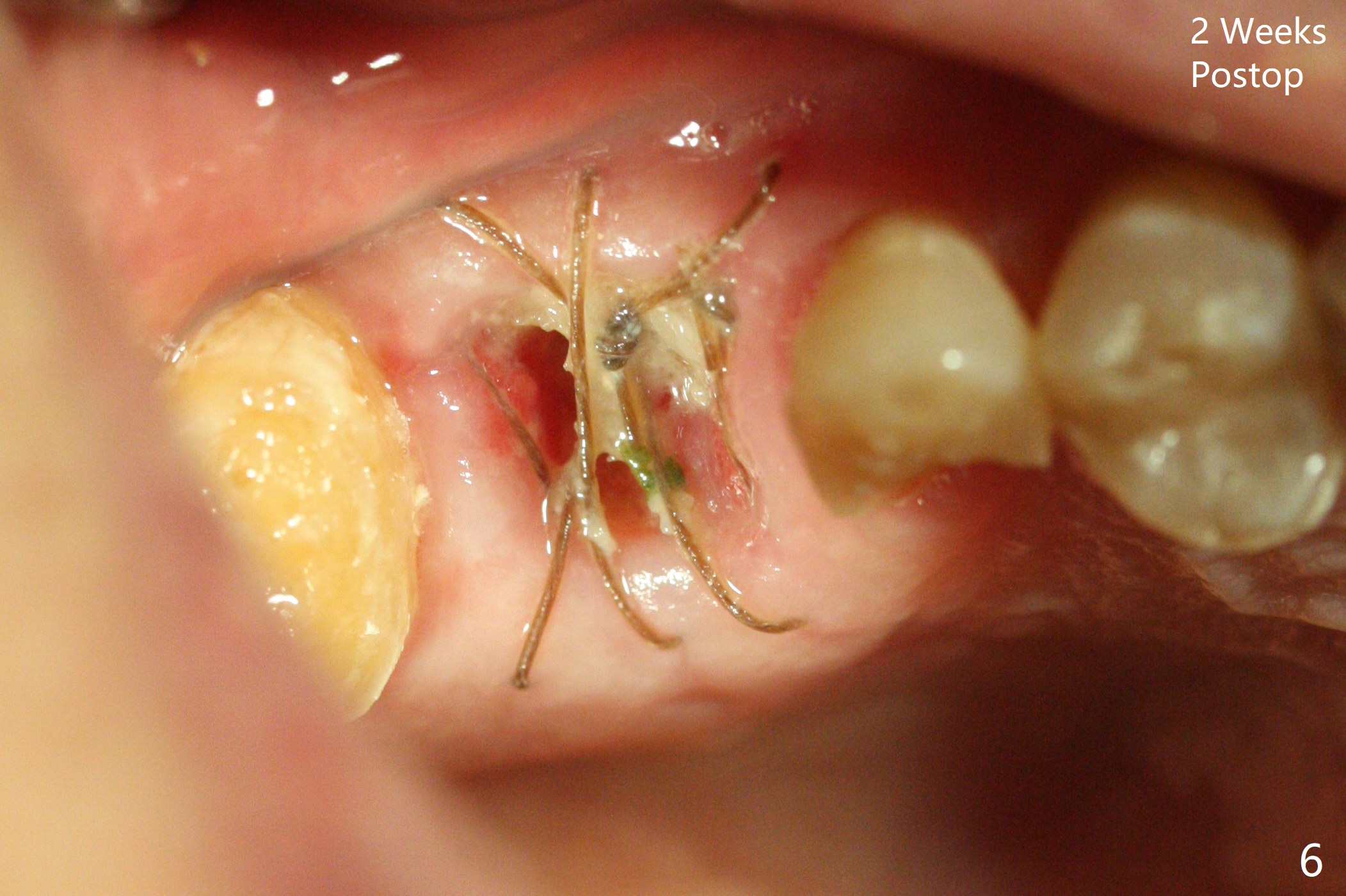 A 56-year-old man with signs of bruxism (multiple occlusal wear and tear, Fig.1) returns from an endodontist office because of failed RCT retreatment at #3 (Fig.2 (* palatal swelling; > fistula)). After difficult extraction, the socket is large without much septal bone (Fig.3 *). Because of lack of the apical native bone, immediate implant is not placed. If it has to be done, a large and long one is required. Instead socket preservation is finished (Fig.4 *). The socket is 20 mm deep, while the shank of surgical curettes is 20 mm. It appears that the most apical granulation tissue is hard to be removed. When 7-day oral Clindamycin is finished, the patient returns with chief complaint of recurrent pain and fistulae. In fact the palatal fistulae are flat without erythema. He returns asymptomatic 2 weeks postop; the fistulae are disappearing (Fig.5 ^) and the socket is healing (Fig.6).