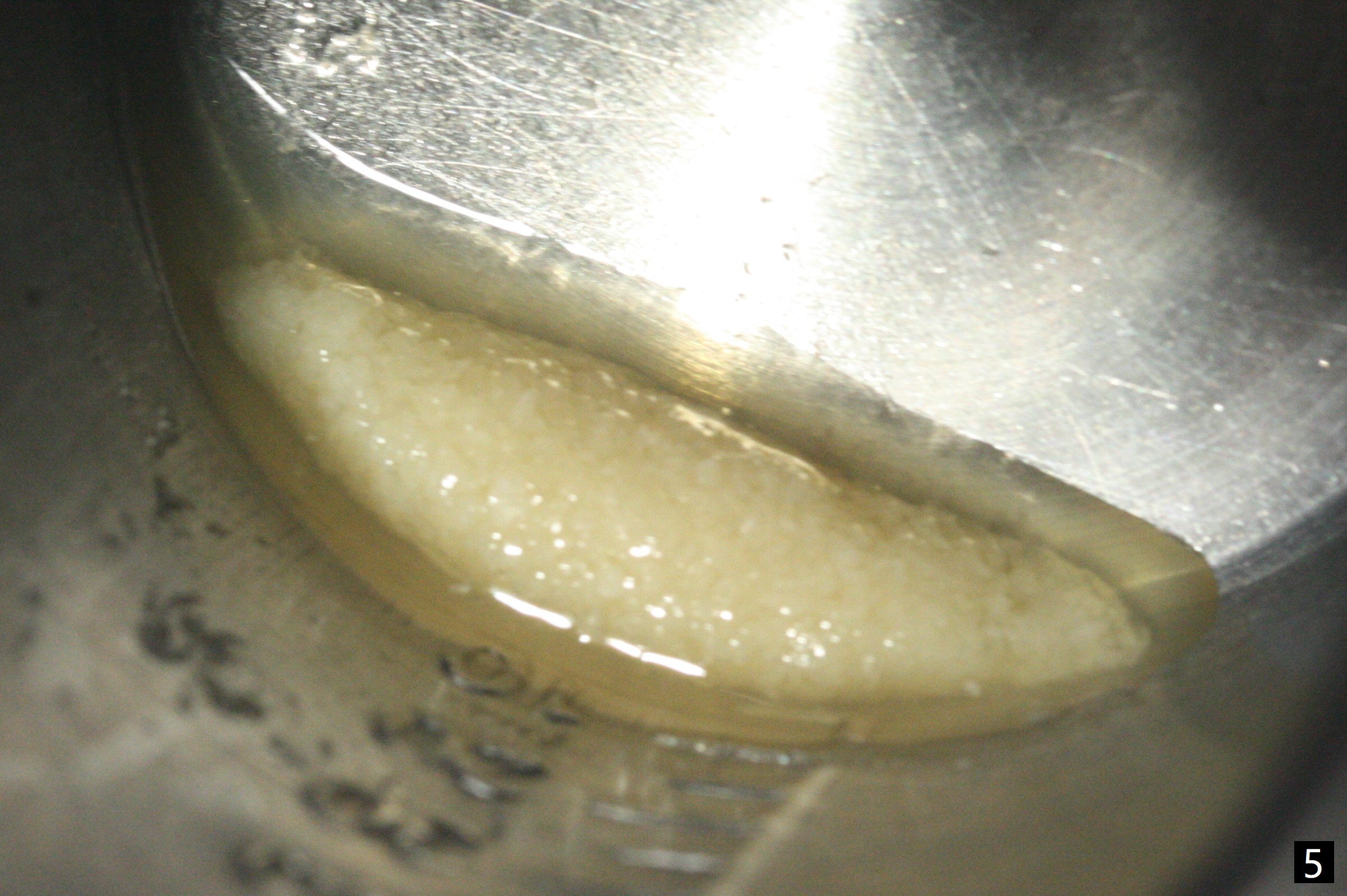 由于他特别害怕治疗,包括抽血,开始不想制作粘性骨块,但是考虑到我们最近用的皮质骨粉颗粒细,送到上颌磨牙牙槽窝困难,容易丢失,最后决定抽血提取上清液,制备骨块(图五)。
