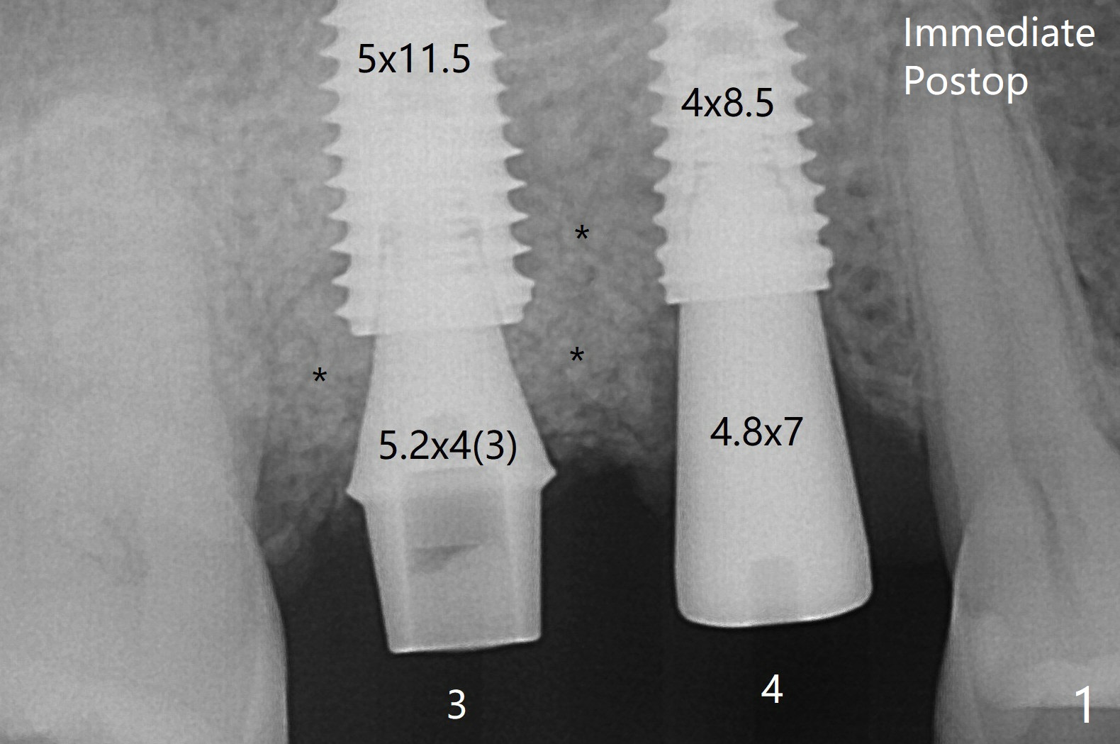 When the tooth #3 with severe buccal gingival recession is extracted and implants are placed at #3 and 4 with guide, sticky bone in 2 large pieces is packed between these implants with a previously large defect in a seemingly secure manner (Fig.1 *). Use of a longer implant at #3 (11.5 mm vs. 10 mm) will reduce the chance of abutment screw loosening in the future. The implant at #3 is placed in the palatal socket without apparently no sinus lift. Apparently new bone forms between the implants 4 months postop (Fig.5). The abutment at #3 may not be completely seated.