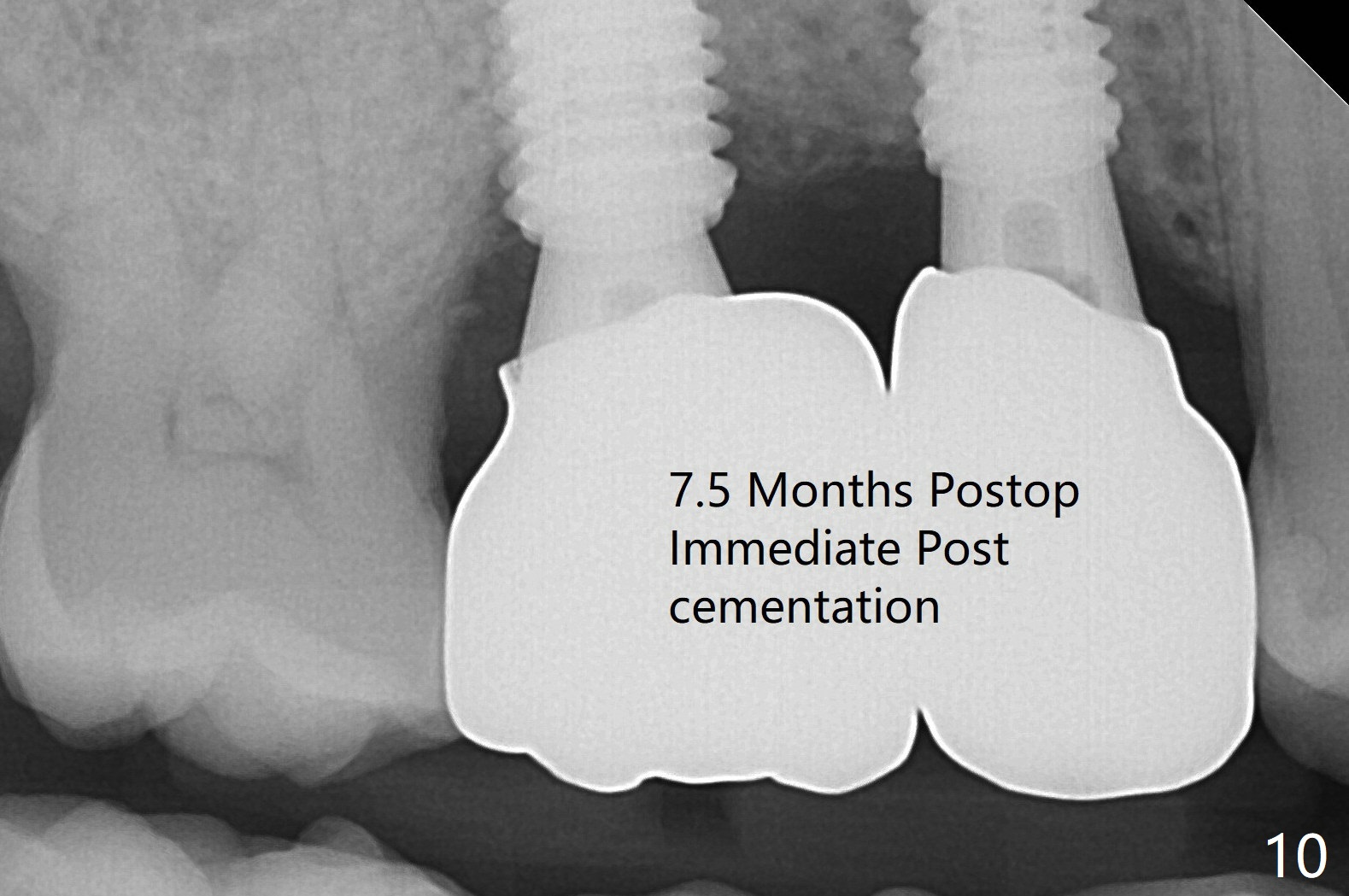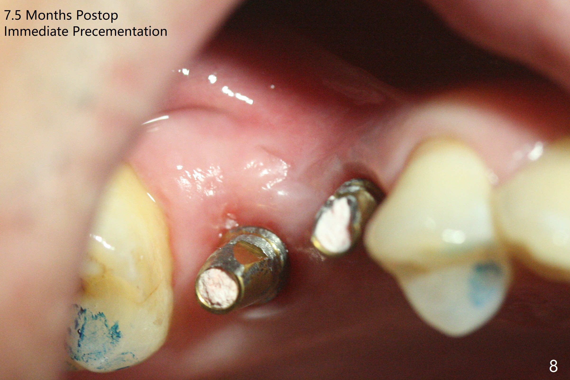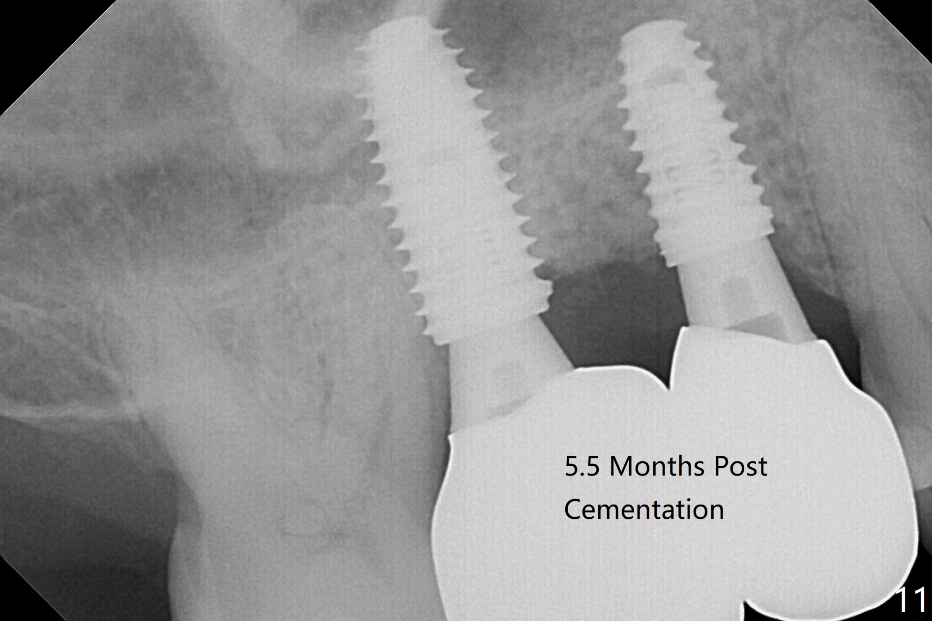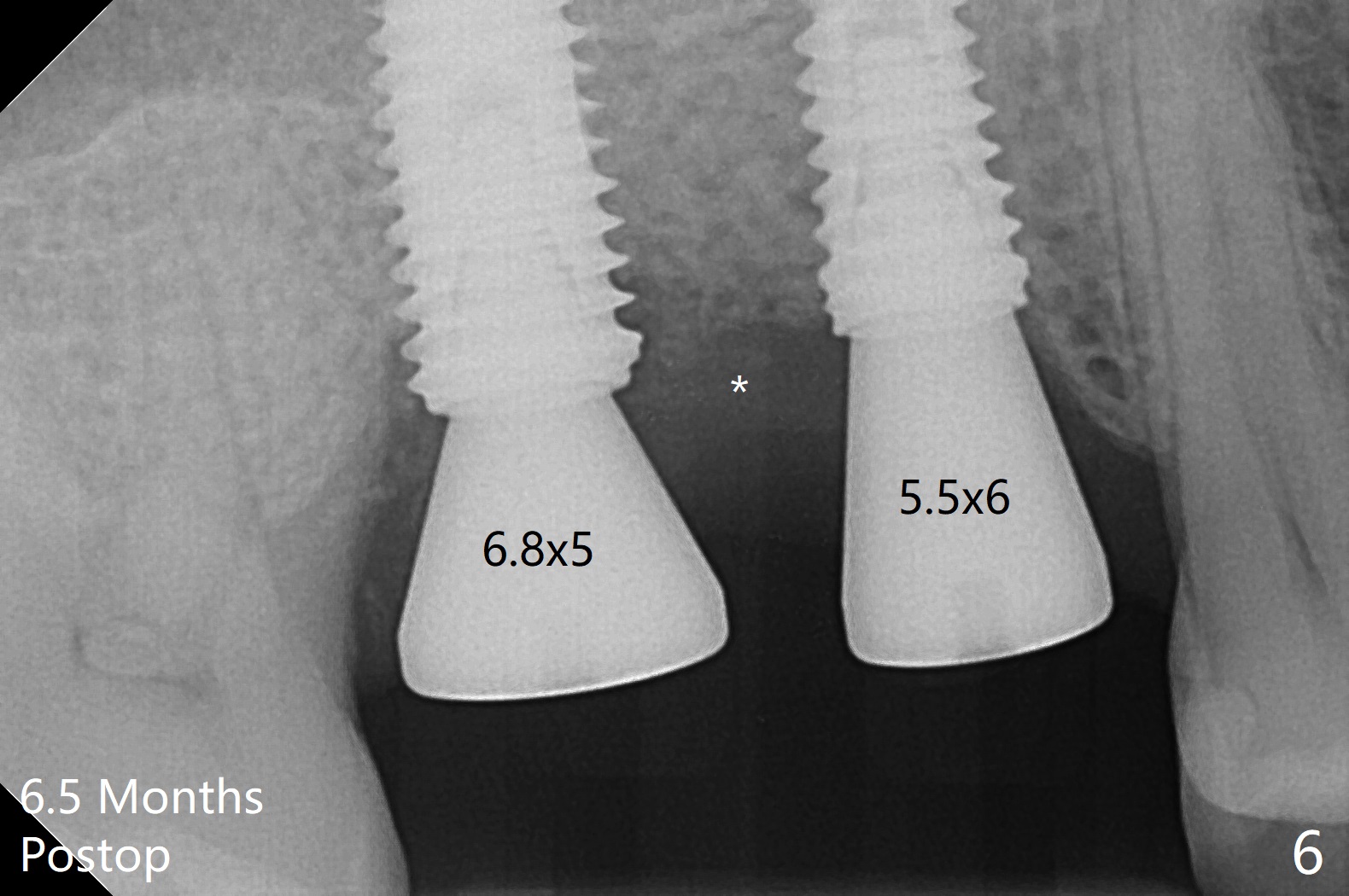 When the tooth #3 with severe buccal gingival recession is extracted and implants are placed at #3 and 4 with guide, sticky bone in 2 large pieces is packed between these implants with a previously large defect in a seemingly secure manner (Fig.1 *). Use of a longer implant at #3 (11.5 mm vs. 10 mm) will reduce the chance of abutment screw loosening in the future. With 2 pieces of PRF membrane coverage, an immediate provisional is fabricated for graft retention (Fig.2,3 P). To stabilize a buccal flap (Fig.2 *, used to be buccal furca gingiva), periodontal dressing is applied later. The buccal socket heals 12 days postop (Fig.4). Apparently new bone forms between the implants 4 months postop (Fig.5). The abutment at #3 may not be completely seated. In fact it is loose, probably related to buccal gingival and gingival cuff erythema 6.5 months postop (Fig.6). Large healing abutments are placed to form the interdental (interimplant) papilla without effect (*). Provisional crowns will be fabricated for the papilla formation. When cemented abutments are placed (Fig.7), papilla formation by manipulation of provisional crowns seems unlikely. Impression is taken. Although there is no implant thread exposure, the buccal plate is concave 7.5 months postop (Fig.8). With special crown design, food impaction should be minimal post cementation (Fig.9,10). There is no bone loss 5.5 months post cementation (Fig.11), while the soft tissue is healthy (data not shown).