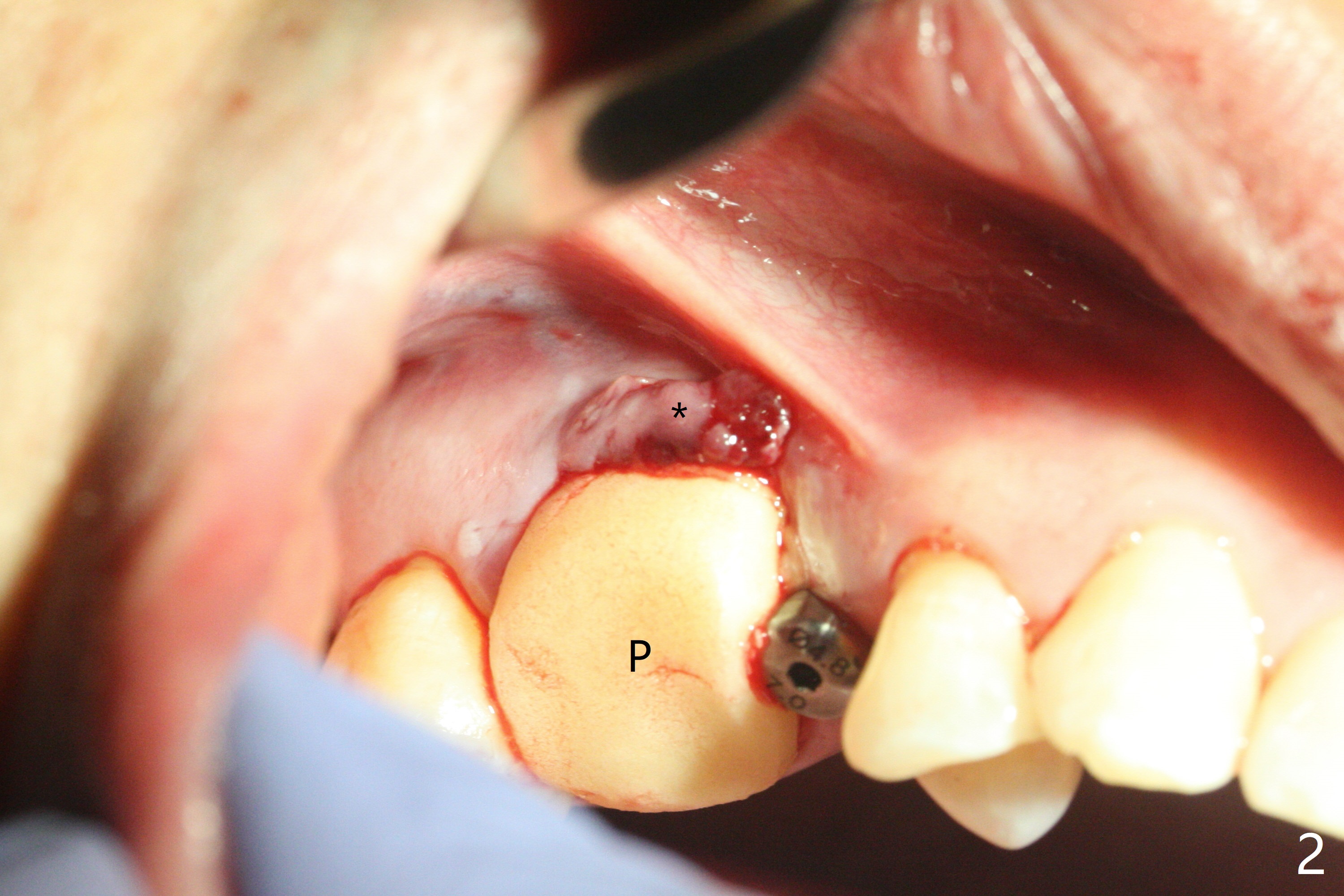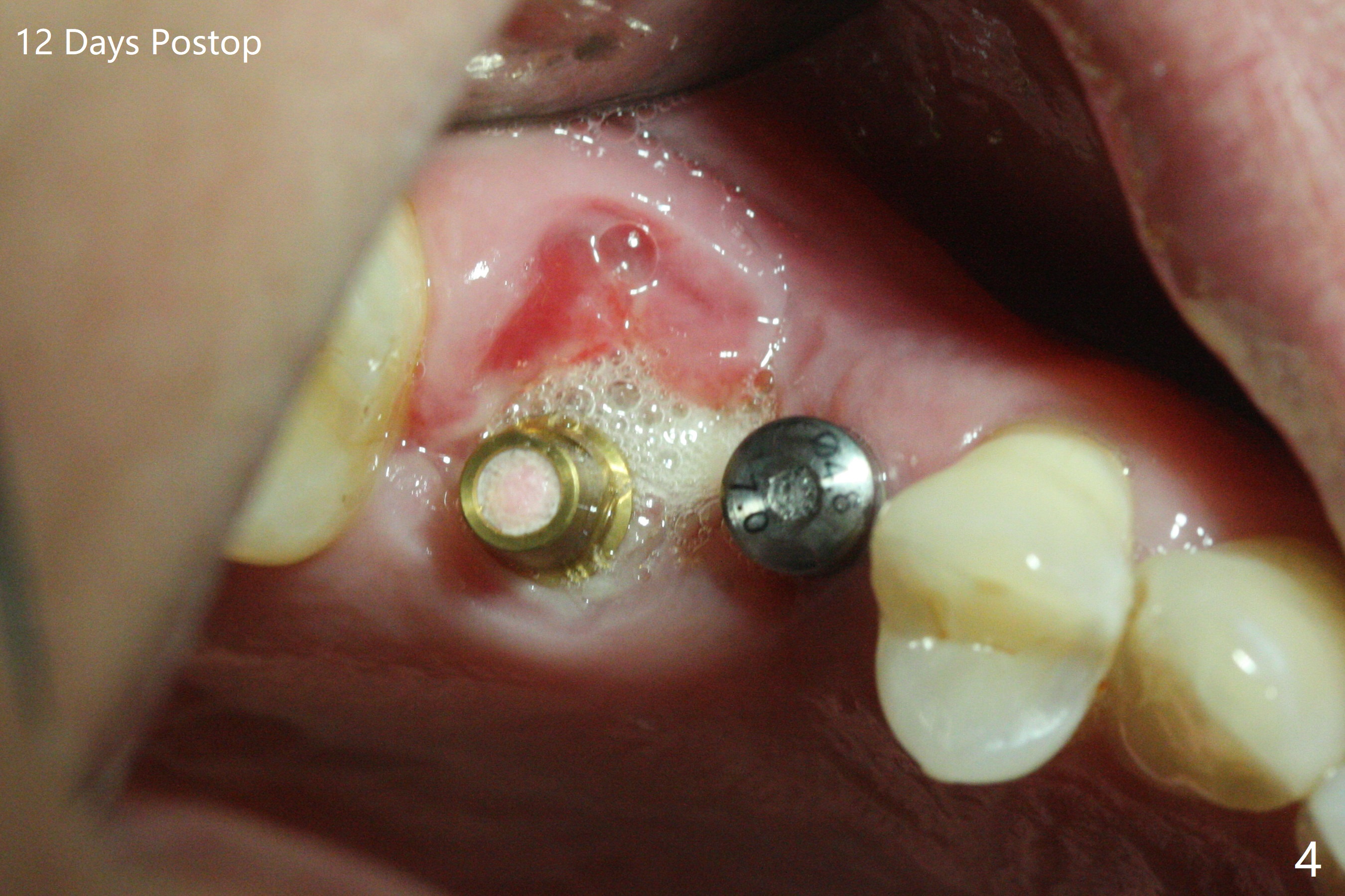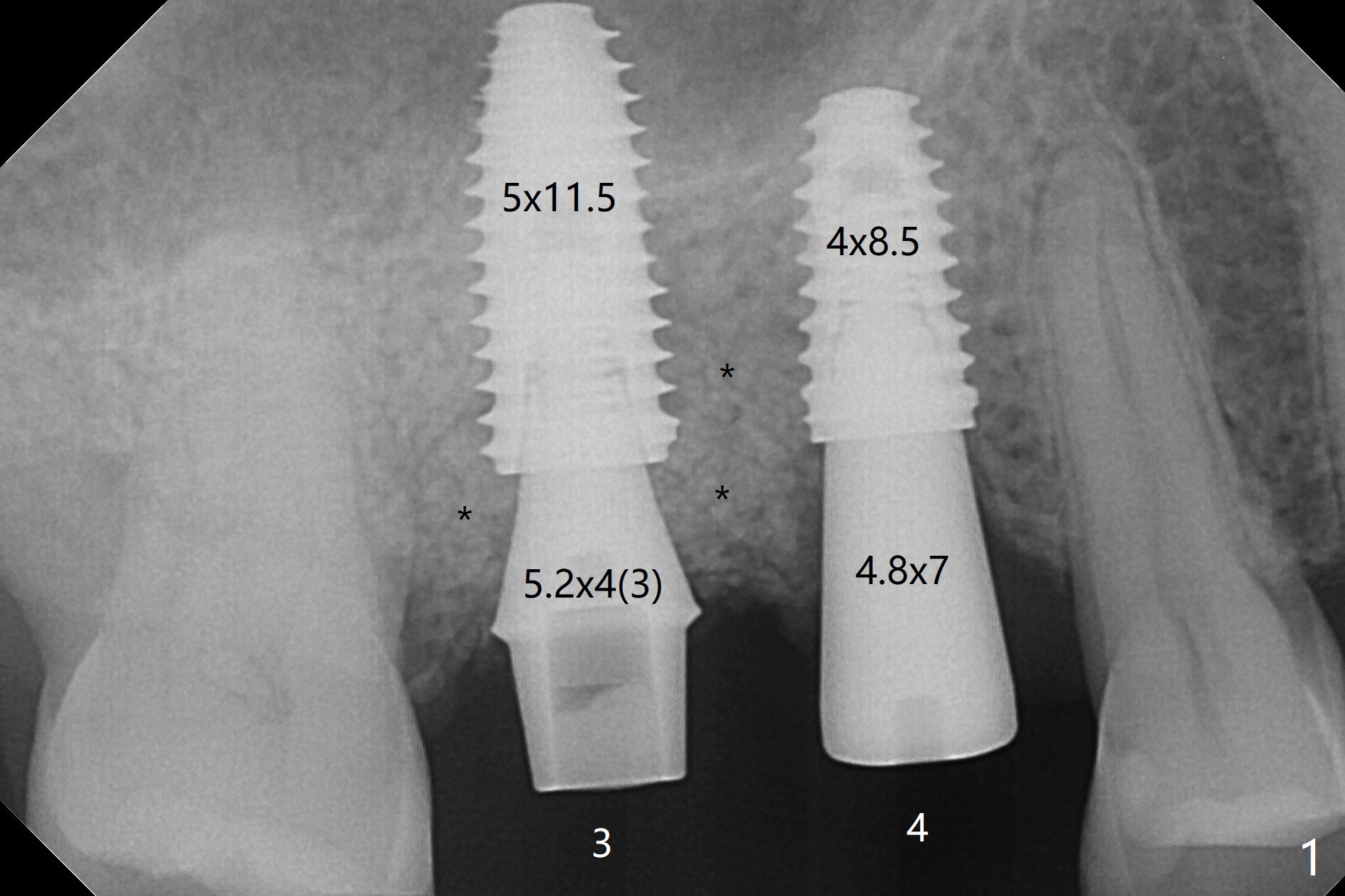 When the tooth #3 with severe buccal gingival recession is extracted and implants are placed at #3 and 4 with guide, sticky bone in 2 large pieces is packed between these implants with a previously large defect in a seemingly secure manner (Fig.1 *). Use of a longer implant at #3 (11.5 mm vs. 10 mm) will reduce the chance of abutment screw loosening in the future. With 2 pieces of PRF membrane coverage, an immediate provisional is fabricated for graft retention (Fig.2,3 P). To stabilize a buccal flap (Fig.2 *, used to be buccal furca gingiva), periodontal dressing is applied later. The buccal socket heals 12 days postop (Fig.4). Apparently new bone forms between the implants 4 months postop (Fig.5). The abutment at #3 may not be completely seated. In fact it is loose, probably related to buccal gingival and gingival cuff erythema 6.5 months postop (Fig.6). Large healing abutments are placed to form the interdental (interimplant) papilla without effect (*). Provisional crowns will be fabricated for the papilla formation. When cemented abutments are placed (Fig.7), papilla formation by manipulation of provisional crowns seems unlikely. Impression is taken. Although there is no implant thread exposure, the buccal plate is concave 7.5 months postop (Fig.8). With special crown design, food impaction should be minimal post cementation (Fig.9,10). There is no bone loss 5.5 months post cementation (Fig.11), while the soft tissue is healthy (data not shown).