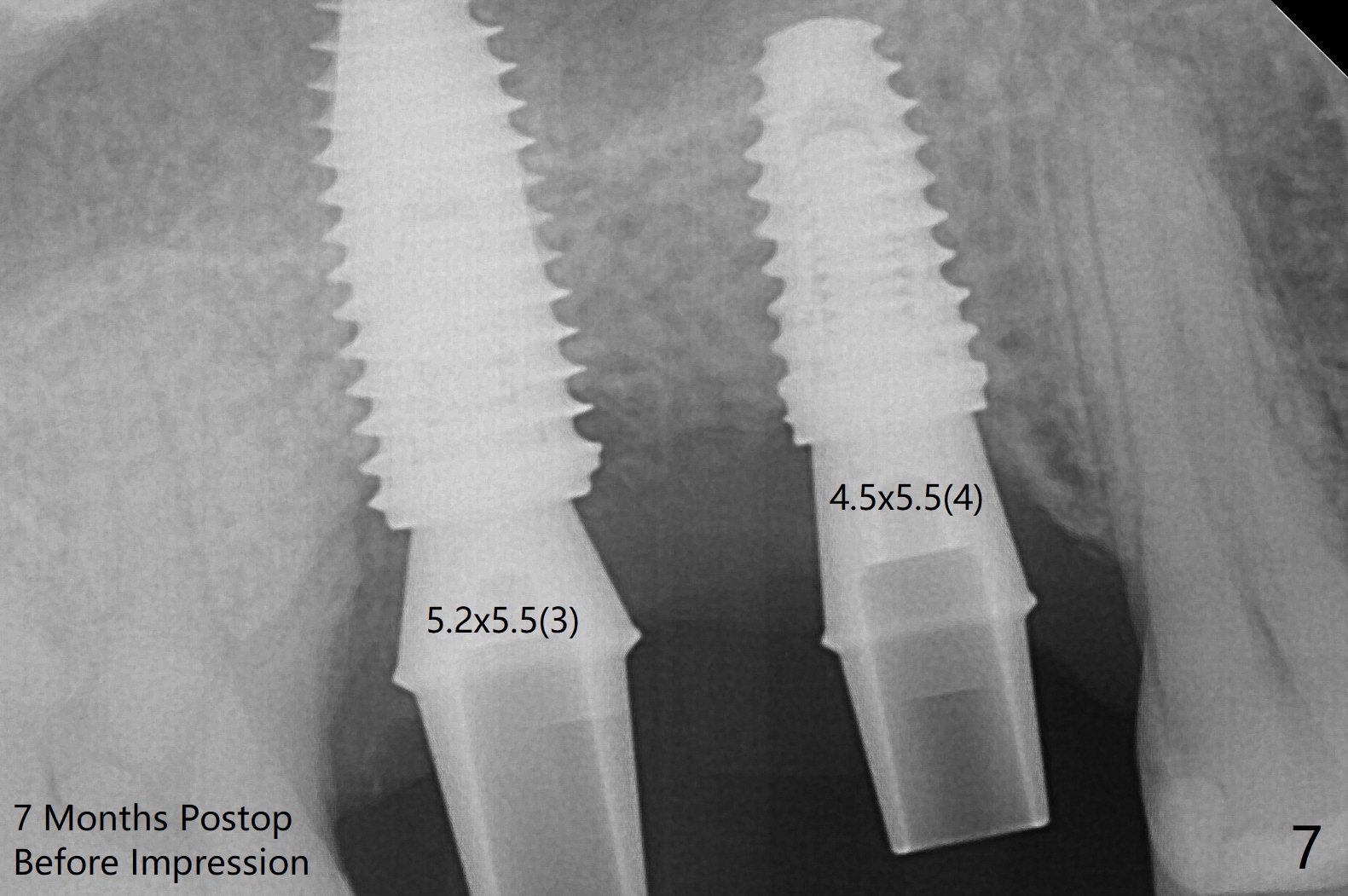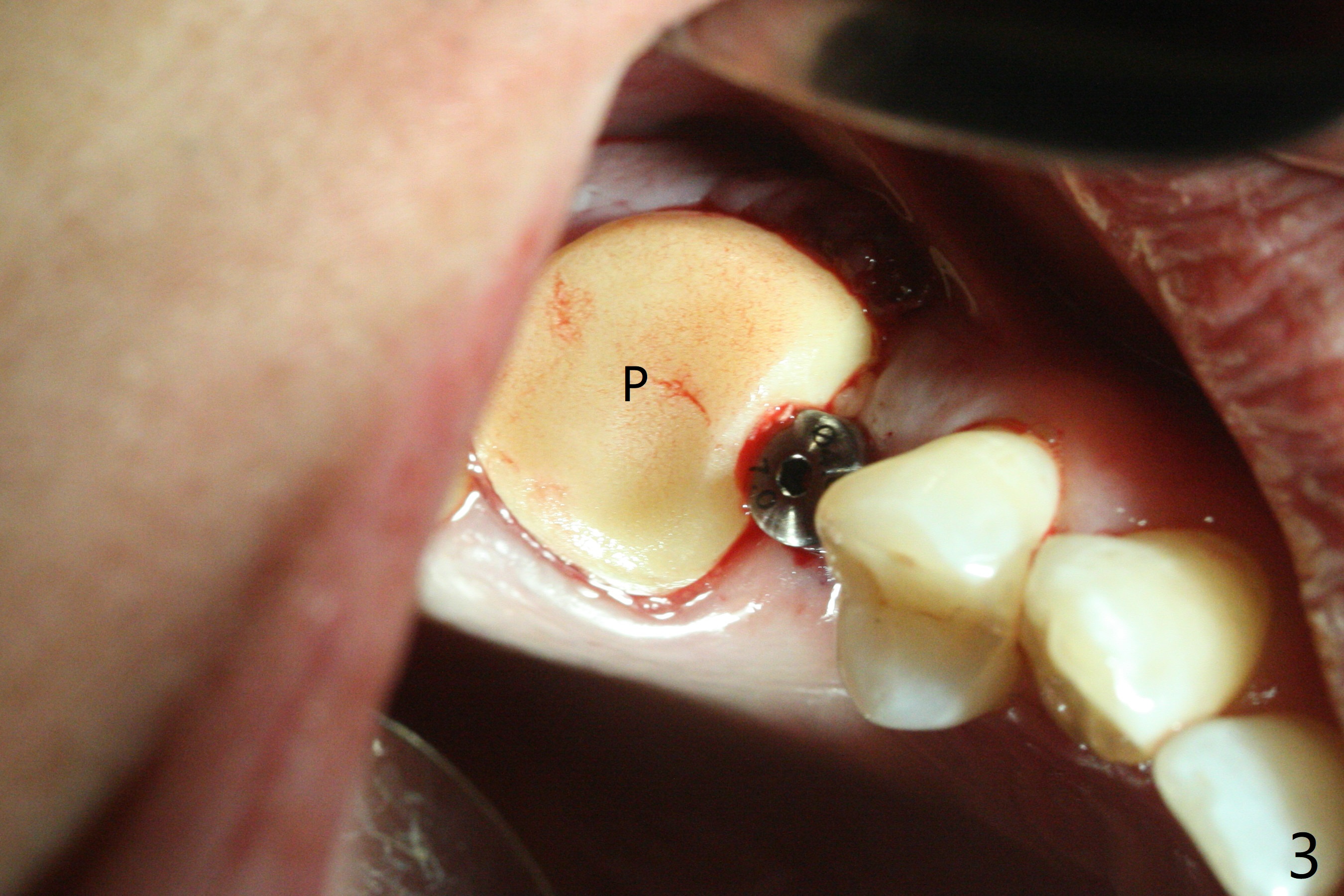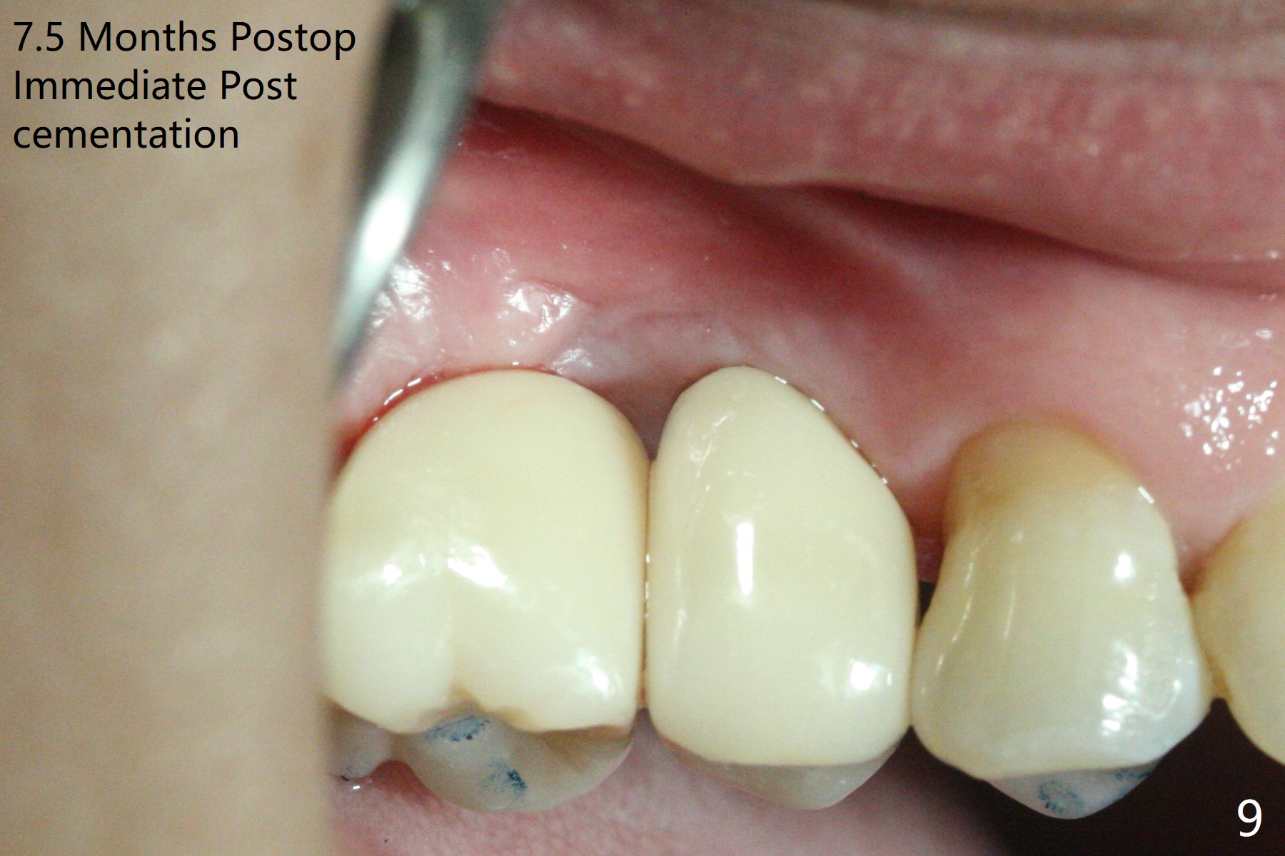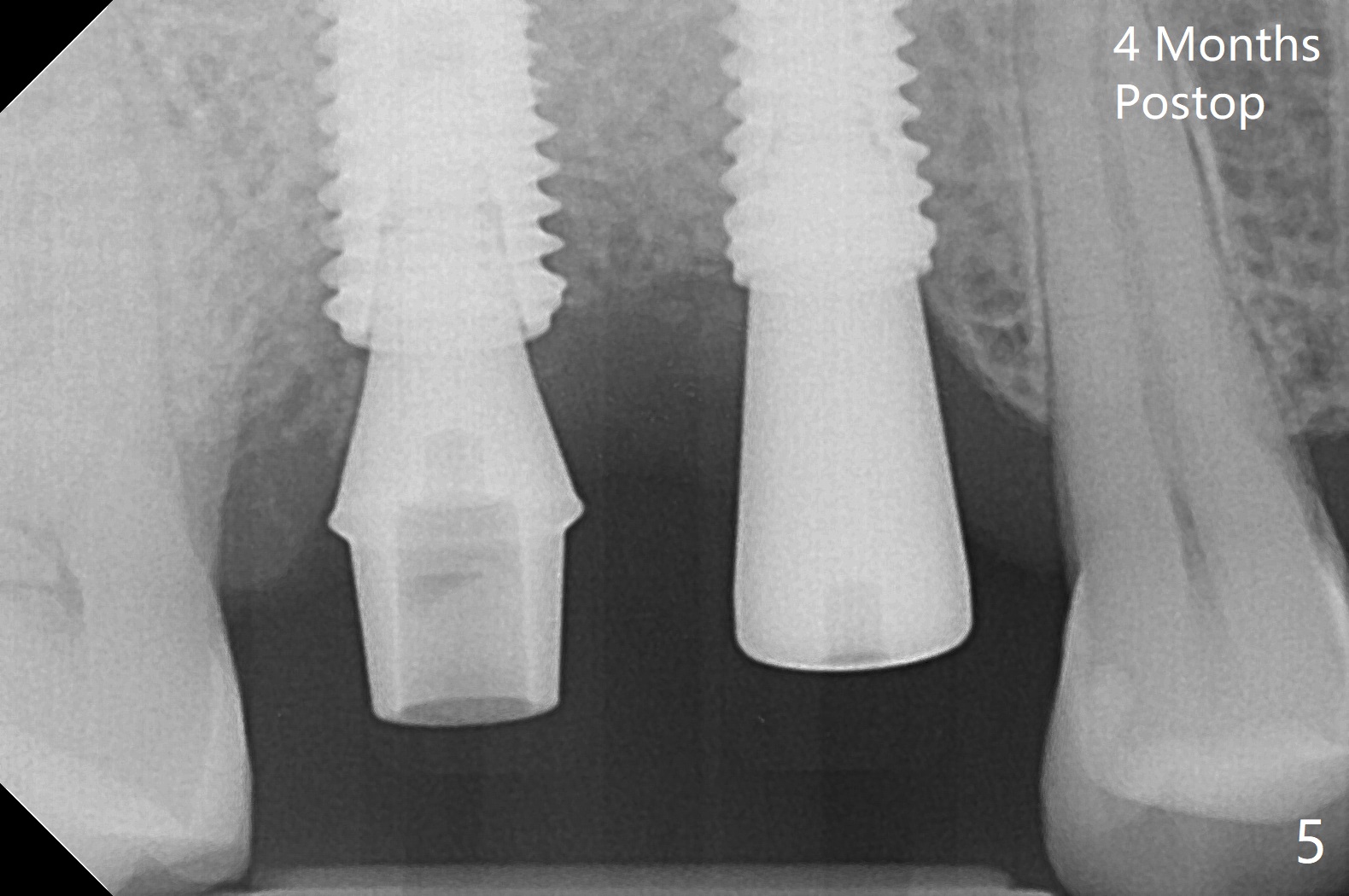 When the tooth #3 with severe buccal gingival recession is extracted and implants are placed at #3 and 4 with guide, sticky bone in 2 large pieces is packed between these implants with a previously large defect in a seemingly secure manner (Fig.1 *). Use of a longer implant at #3 (11.5 mm vs. 10 mm) will reduce the chance of abutment screw loosening in the future. With 2 pieces of PRF membrane coverage, an immediate provisional is fabricated for graft retention (Fig.2,3 P). To stabilize a buccal flap (Fig.2 *, used to be buccal furca gingiva), periodontal dressing is applied later. The buccal socket heals 12 days postop (Fig.4). Apparently new bone forms between the implants 4 months postop (Fig.5). The abutment at #3 may not be completely seated. In fact it is loose, probably related to buccal gingival and gingival cuff erythema 6.5 months postop (Fig.6). Large healing abutments are placed to form the interdental (interimplant) papilla without effect (*). Provisional crowns will be fabricated for the papilla formation. When cemented abutments are placed (Fig.7), papilla formation by manipulation of provisional crowns seems unlikely. Impression is taken. Although there is no implant thread exposure, the buccal plate is concave 7.5 months postop (Fig.8). With special crown design, food impaction should be minimal post cementation (Fig.9,10). There is no bone loss 5.5 months post cementation (Fig.11), while the soft tissue is healthy (data not shown).