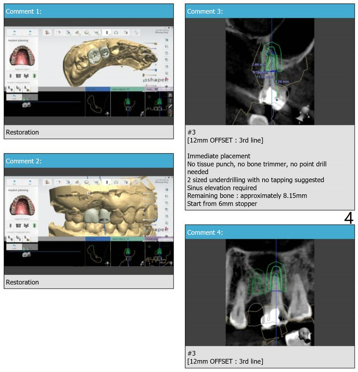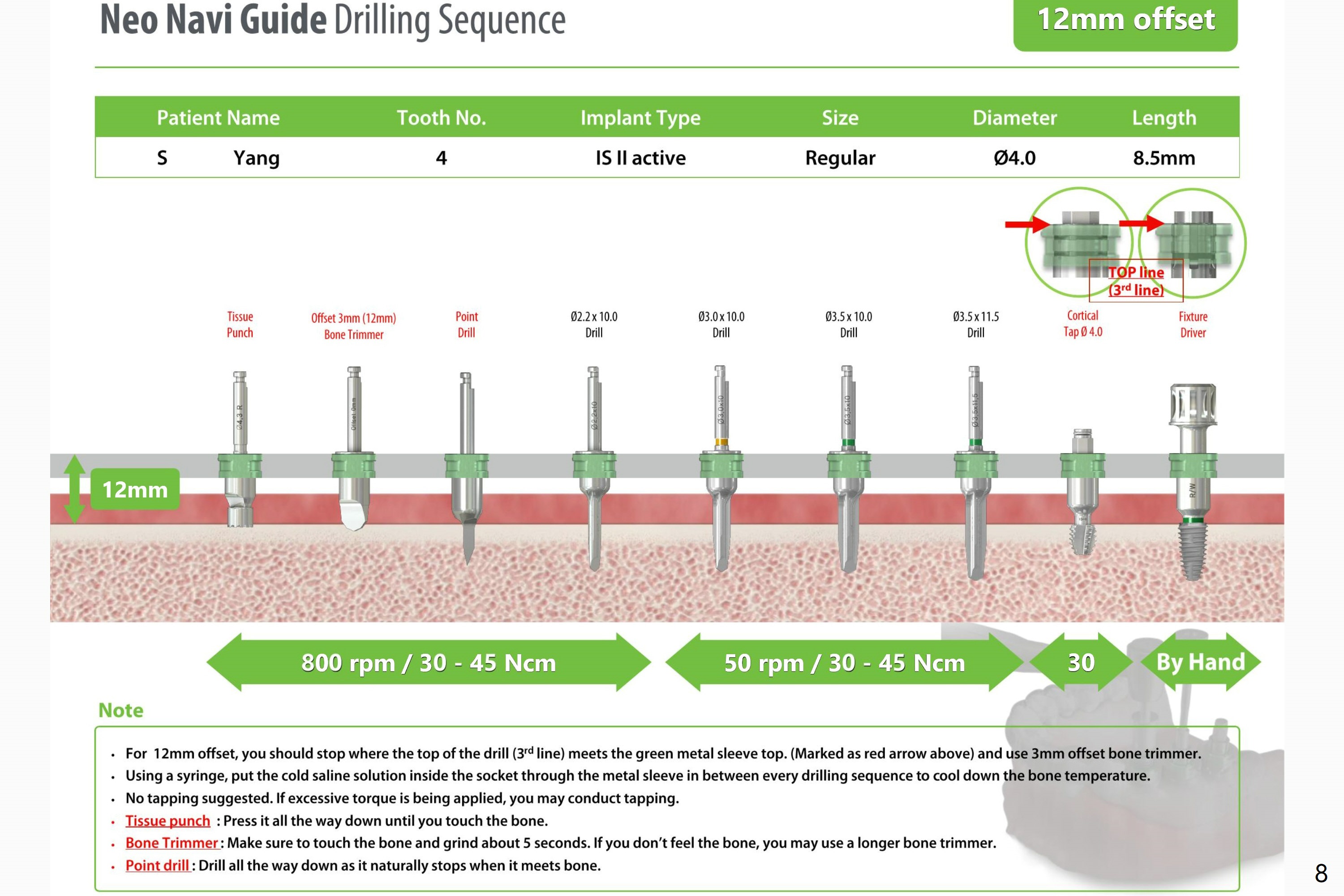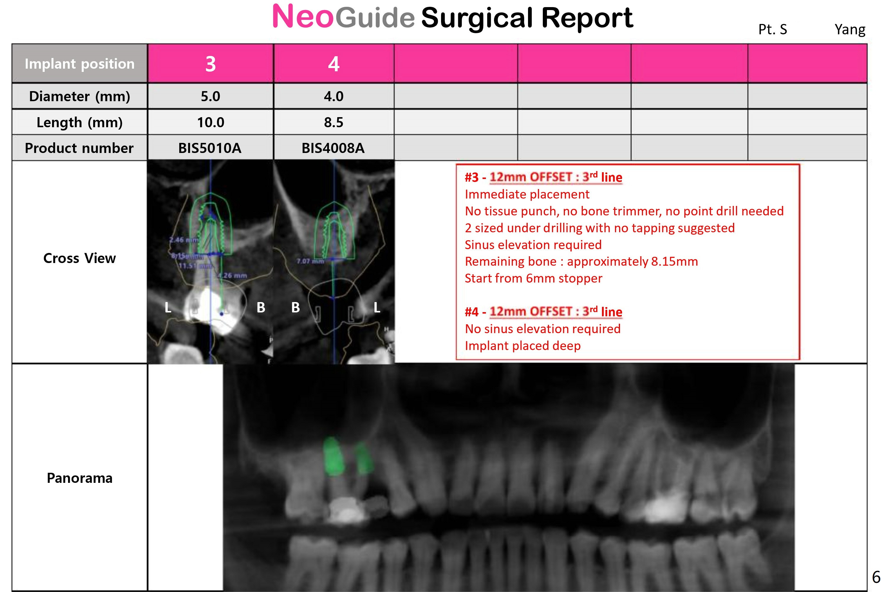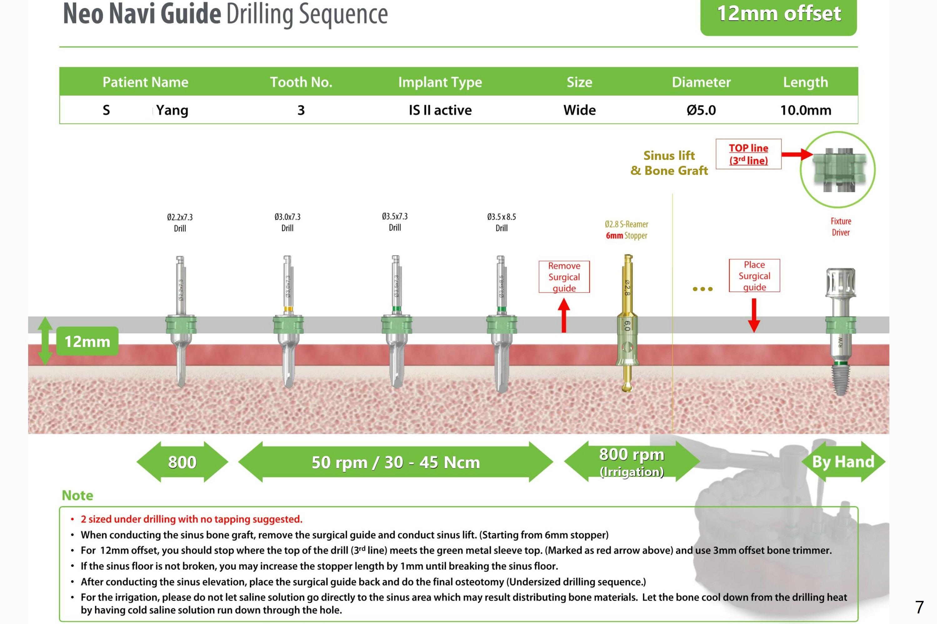 Due to loss of the buccal plate, a 5x10 mm implant will be placed in the palatal socket.