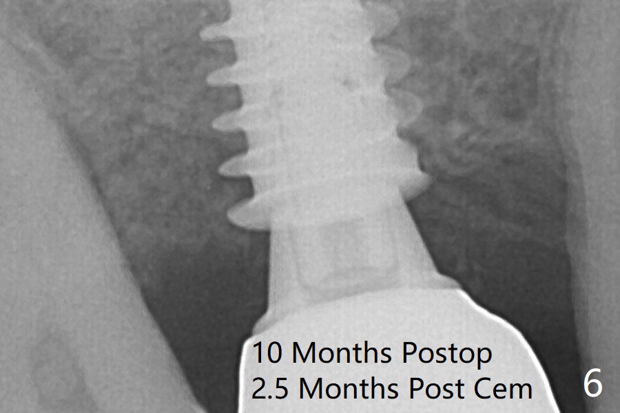 The bone graft (Fig.3 *) appears to have attached to the root of the neighboring tooth and the implant threads 7 months post op (COVID 19, Fig.5 arrowheads)). The bone graft appears to continue to merge with the neighboring root, bone and implant 10 months postop (2.5 months post cementation, Fig.6).