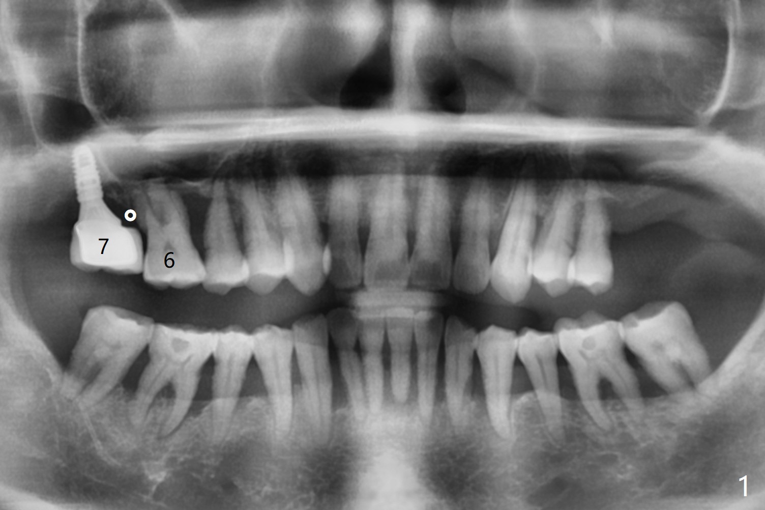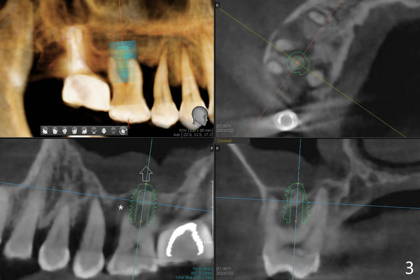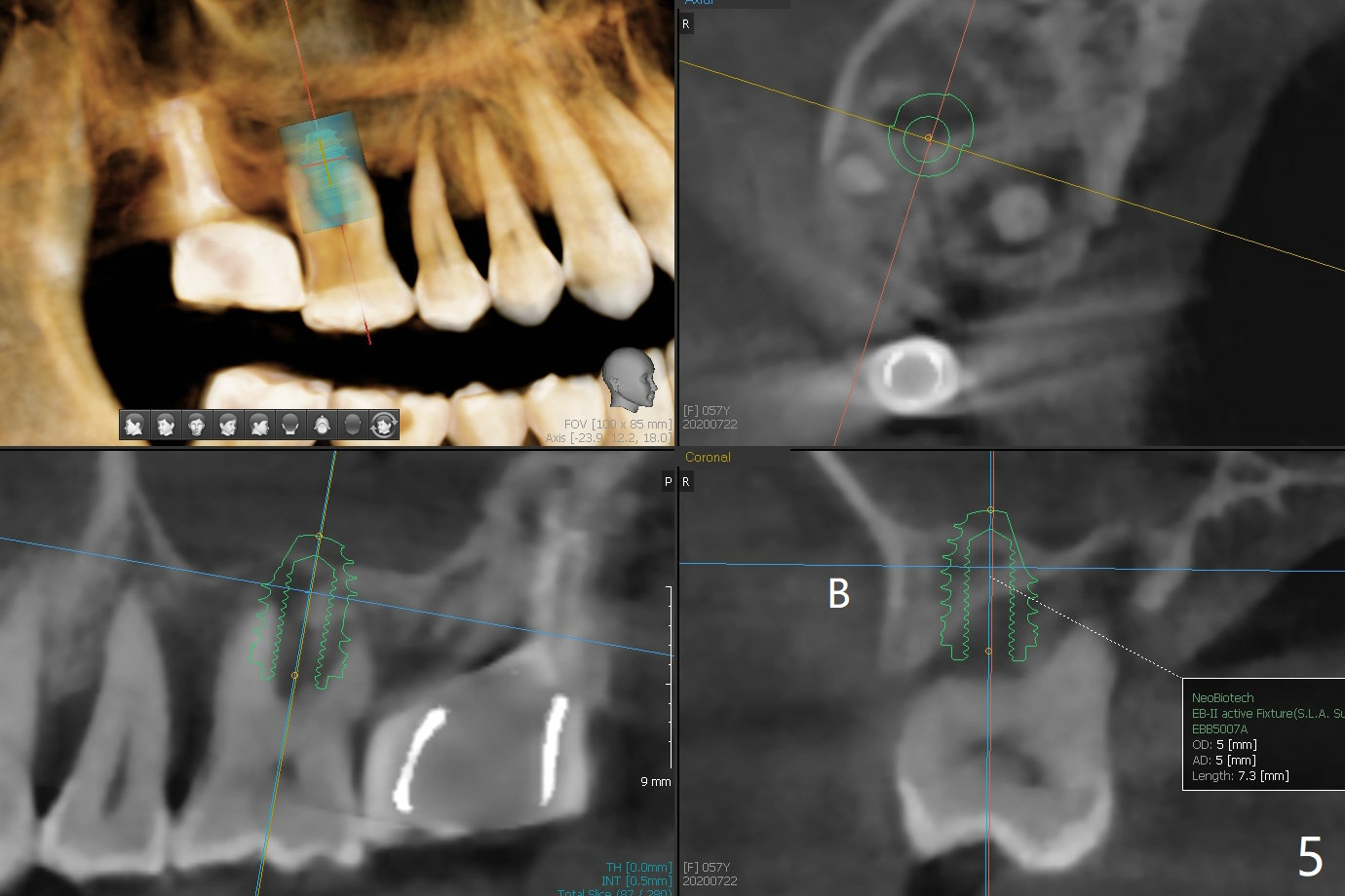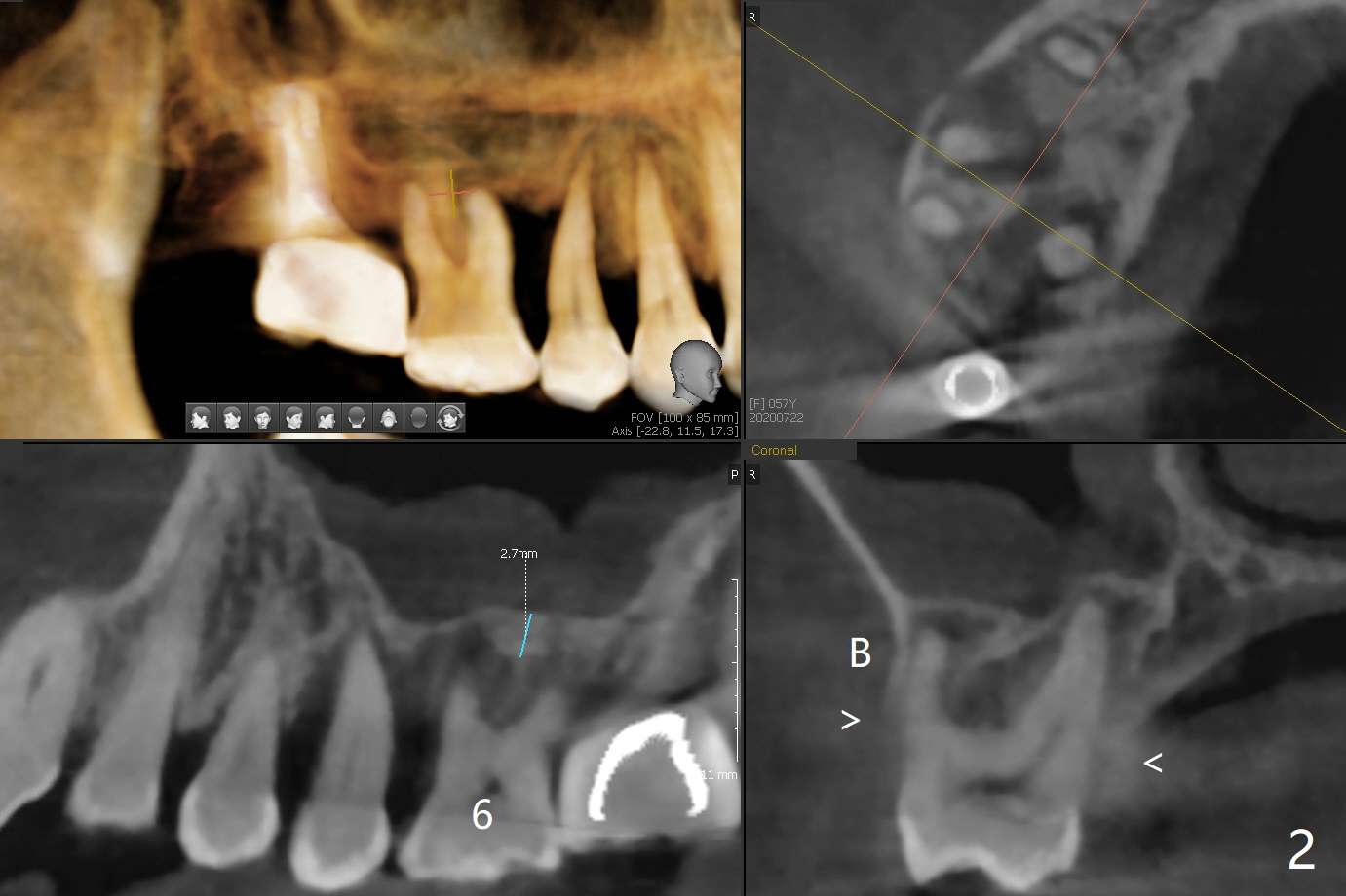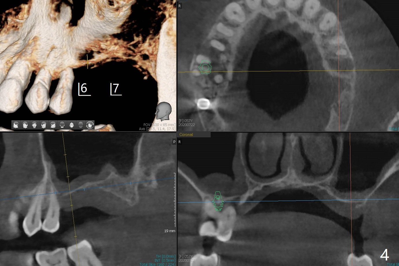 57岁女严重牙周炎,主诉右上磨牙食物堵塞(图一:圆圈)。第一磨牙骨质吸收,松动,需要拔除,尽管骨壁2-3毫米(图二),使用导航应该能取得5乘7.3毫米植体(图三绿色)初步稳定性。上颌窦膜厚,提升术不容易破裂,使用PRF膜预防及修补。由于近中骨质缺损严重(图三 *),植体可以再提高些(箭头),利用粘性骨做提升以及骨质缺损充填,似乎颊侧骨质多些(图五),植体可以小些,万一不行,就做提升和植骨。左上磨牙区骨壁更薄(图四,约1毫米),外提升术之后再种植。