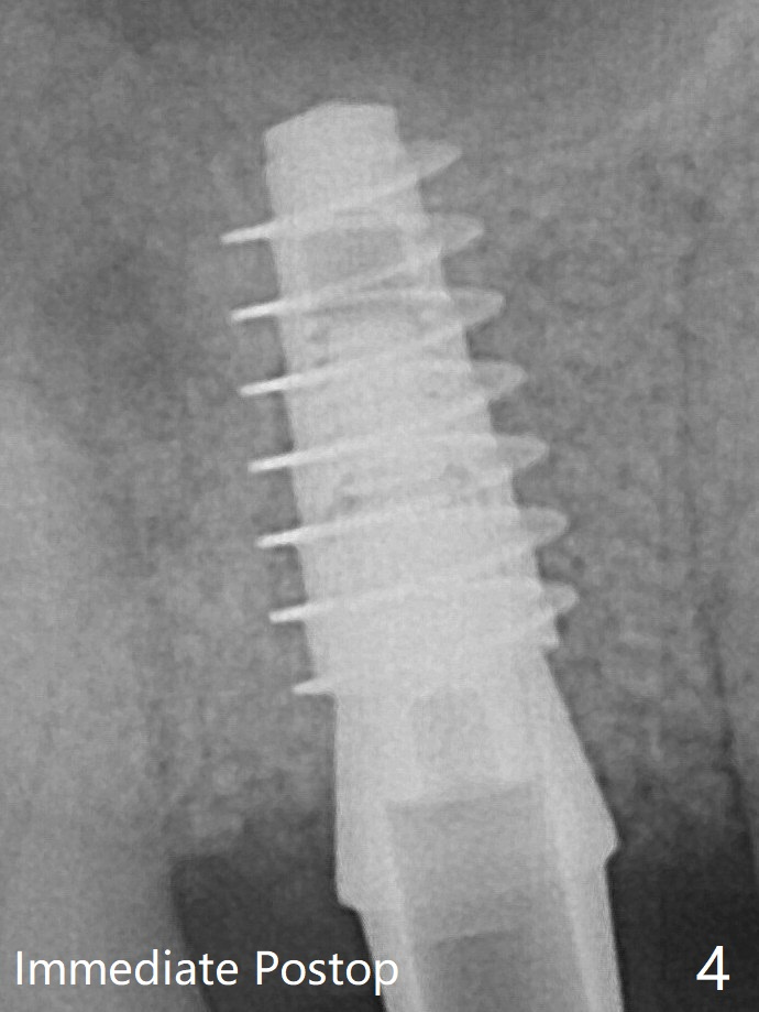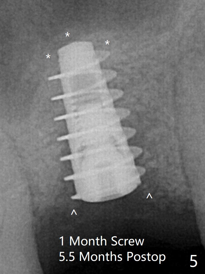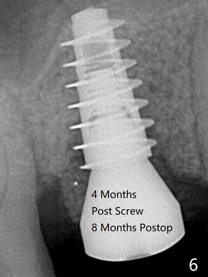 愈合帽放置4个月,伤口还没有完全愈合,翻瓣后发现远中螺纹表面肉芽组织覆盖,去除后者,第一螺纹暴露。放置愈合基台后,从颊侧往远中缺陷填入骨粉(图六:*),缝合,覆盖树脂敷料。