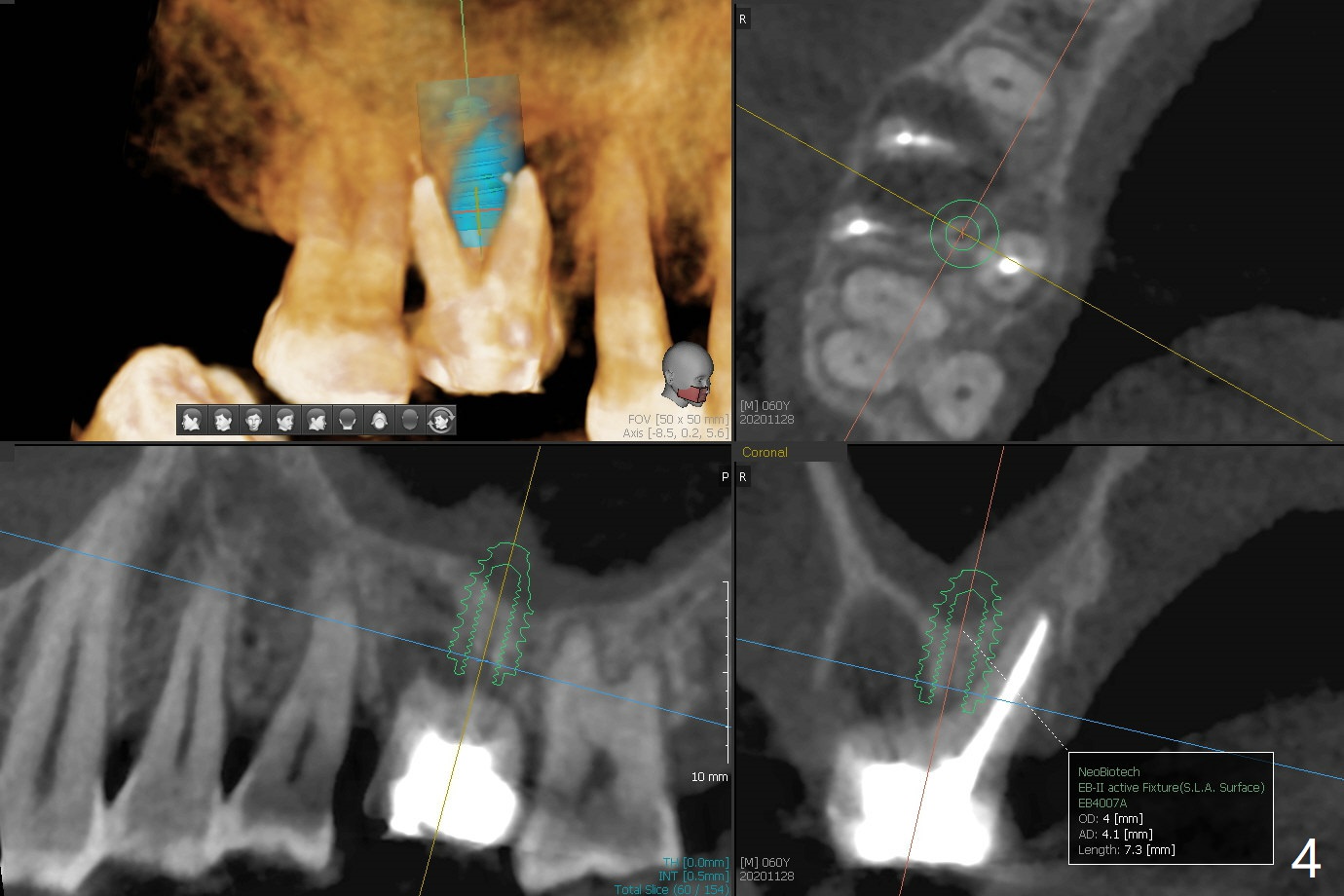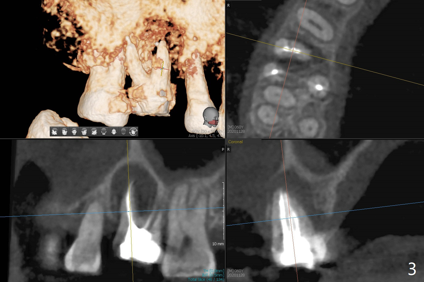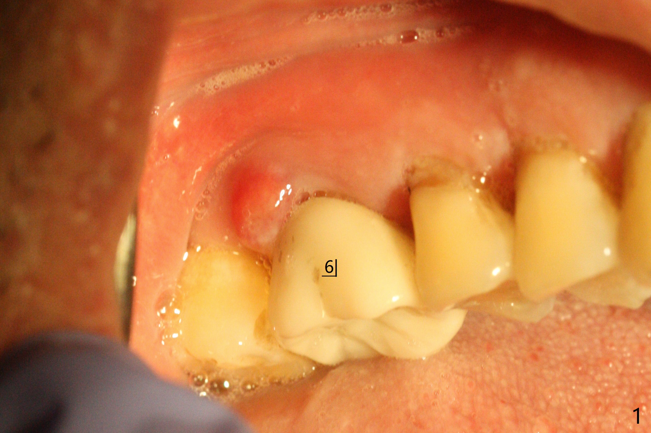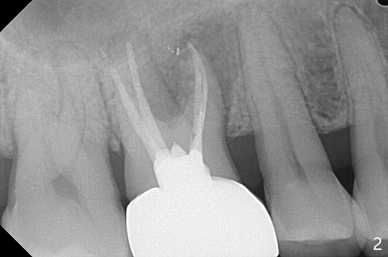 60岁男右上6出现脓包(图一),颊侧牙周袋深9毫米,指向近中颊侧根尖,根尖片(图二)和CT(图三(去除牙冠后))显示巨大近中颊侧根周骨质吸收,但是松动度低,一度想做根切。最佳植牙位点偏远中腭侧(图四),植体偏小,稳定性差,使用临时基台制作牙合面低的临时牙冠,目的包括固定粘性骨粉和防止邻牙移位。半张PRF膜用于上颌窦提升,另外半张用于覆盖牙槽窝开口的骨粉。局部使用抗菌素(Arestin),十九天后瘘道消失,根切,植骨可能成功。