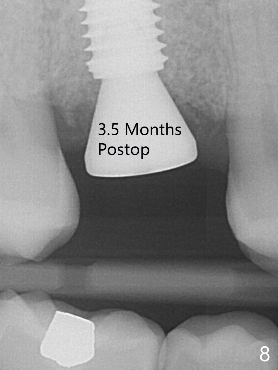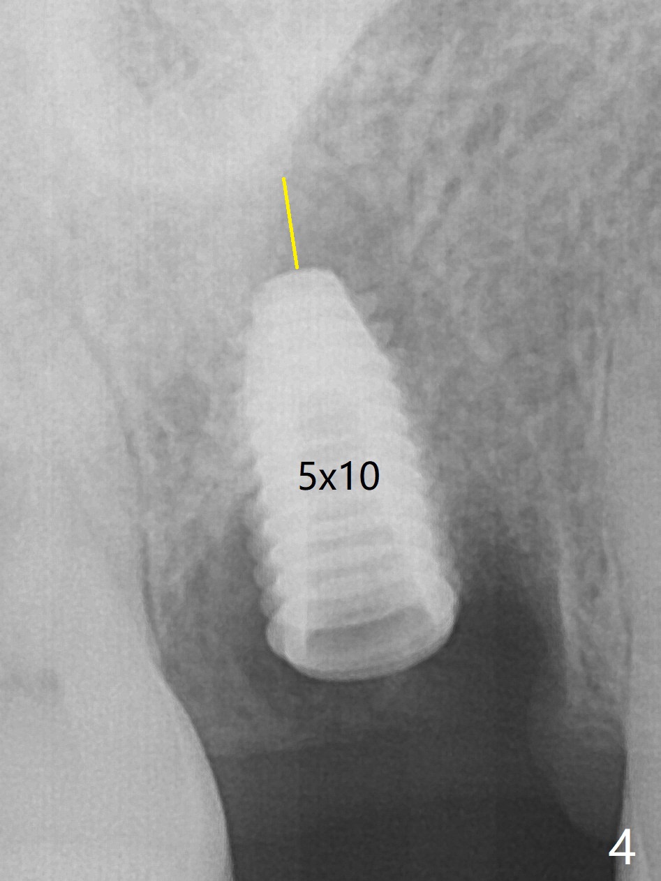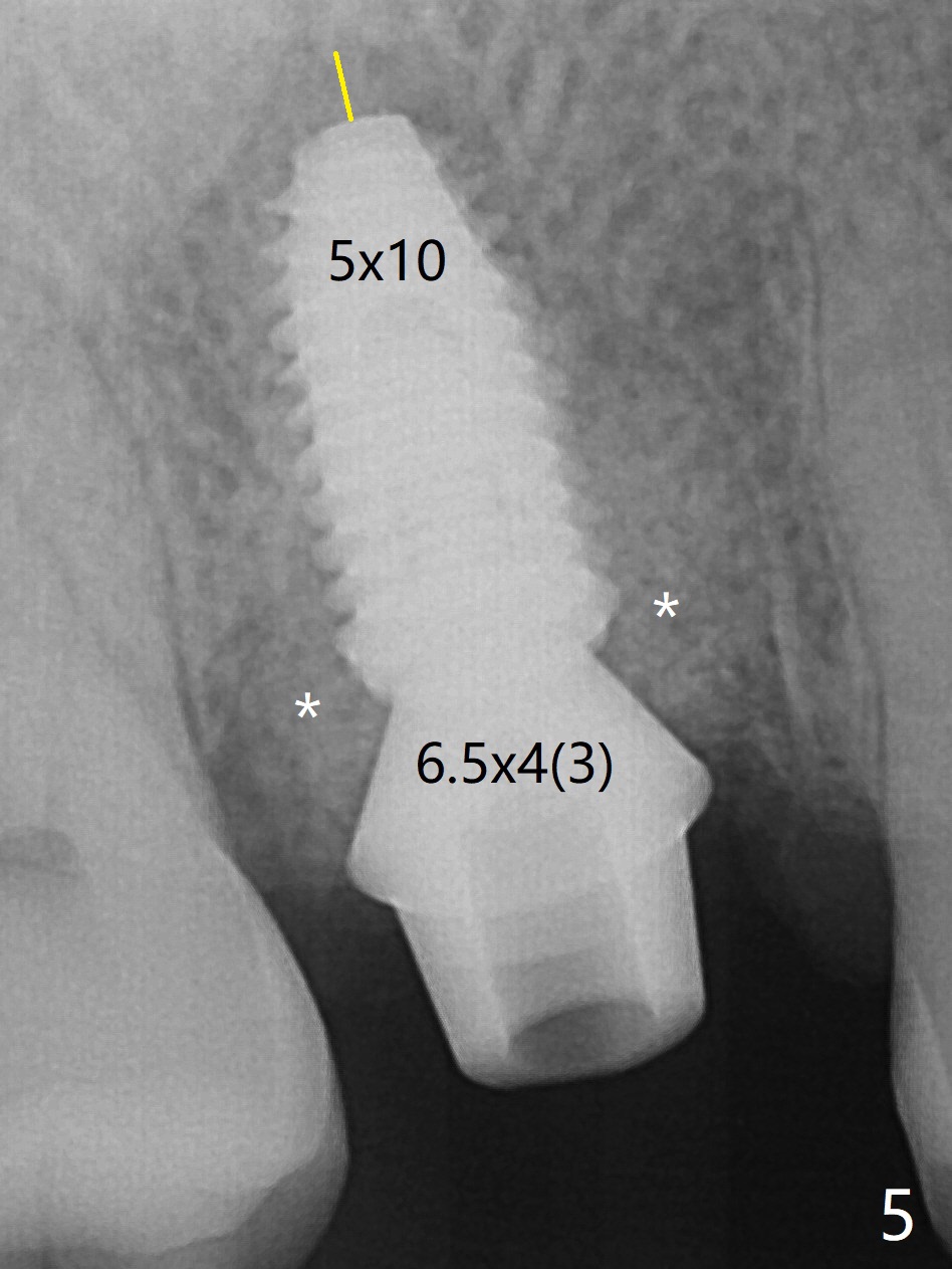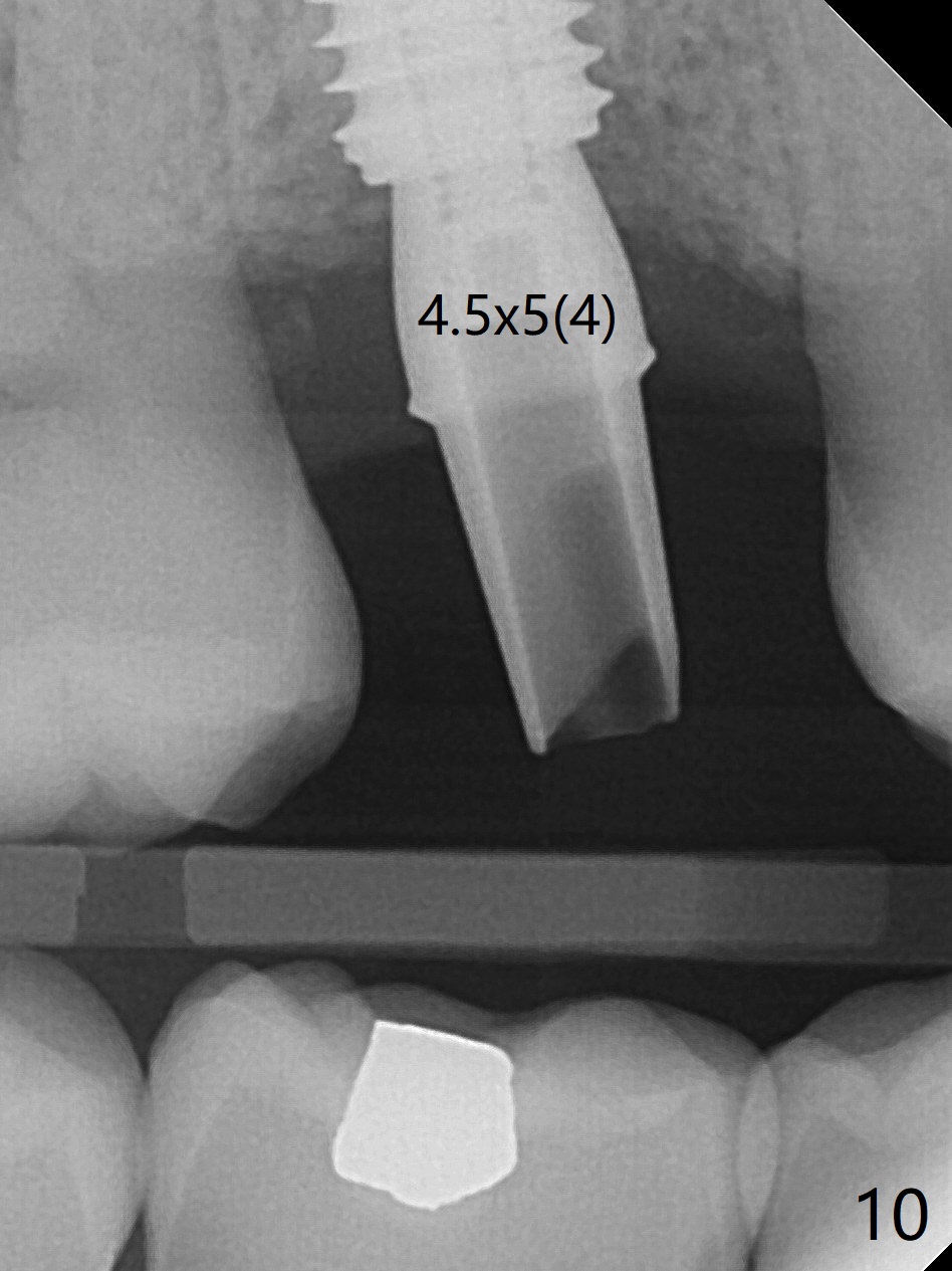 While the tooth #3 has a mesiodistal crack line, etiology may be due to chronic periodontitis with bruxism. After extraction, there is granulation tissue attached to the distobuccal (DB) root. The DB socket is larger than the mesiobuccal one (Fig.1). Osteotomy is initiated in the DB slope of the septum for 10 mm (Fig.2,3). Since there is ample apical bone, the depth of the osteotomy increases to 11.5 mm. When a 5x10 mm dummy implant is placed, primary stability is satisfactory (Fig.4 (yellow line: apical space)). The definitive implant remains the same dimension with deeper placement (Fig.5,6 (~ 20 Ncm)); with placement of a 6.5x4(3) mm abutment and Vanilla/Osteogen Graft (*), an immediate provisional is fabricated in place (without taking out for trimming) with sufficient clearance with the opposing dentition. It appears that the moderately long implant (10 mm) is able to achieve primary stability for immediate placement. When the provisional is removed 2 months postop, bone graft seems to be adhered to the socket (Fig.7). To improve local hygiene, the provisional does not return. The implant seems to have osteointegrated 3.5 months postop (Fig.8). The crown/abutment is loose approximately 1 year post cementation. Due to her daughter's contracting COVID 19, she postpones returning for approximately 1 year. The access hole is opened, crown/abutment (6.5x4(4) mm) removed, proximal contacts reduced, crown/abutment reseated without certainty. BW shows incomplete seating probably due to bony interference (Fig.9). A 5.5x4(4) mm can not be seated (bouncing, probably due to soft tissue interference). When a 4.5x5(4) mm abutment (UF) is seated, hand tightening is smooth, confirmed by BW (Fig.10). Two weeks later, the new crown is cemented intraorally. The crown/abutment is removed for cleaning. The abutment screw is torqued at 20 NCM.