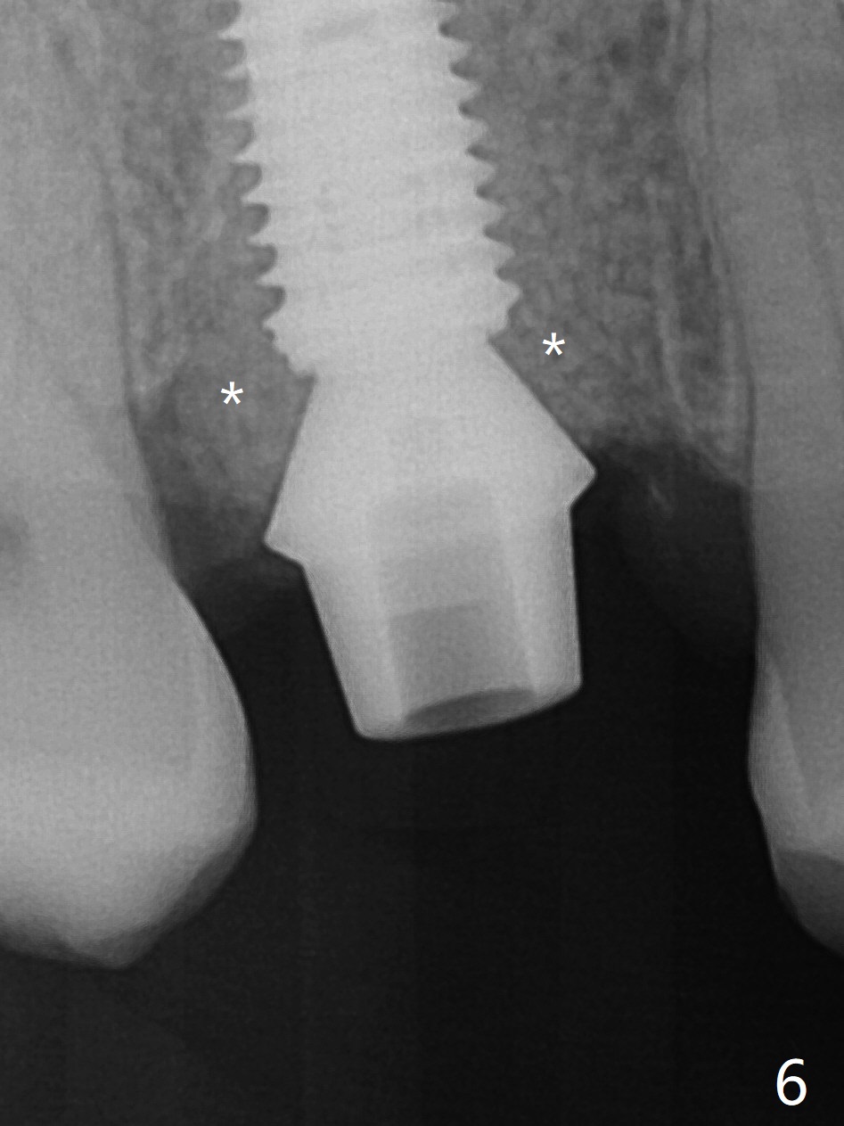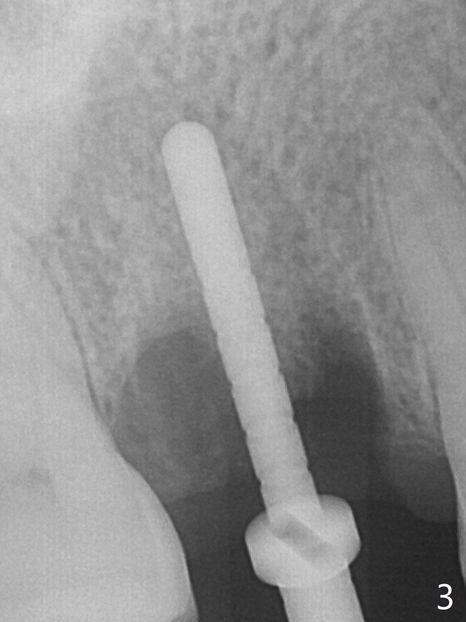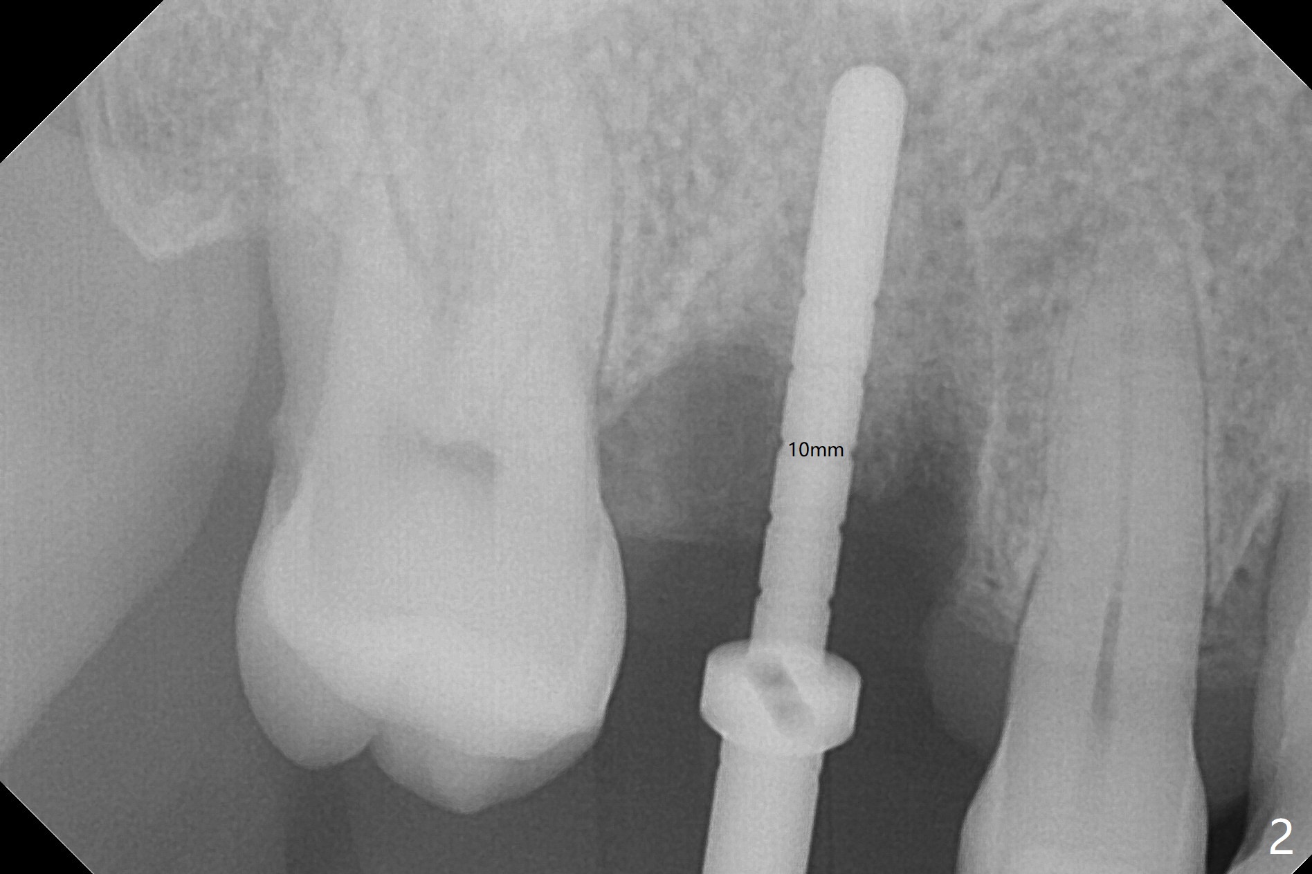 While the tooth #3 has a mesiodistal crack line, etiology may be due to chronic periodontitis with bruxism. After extraction, there is granulation tissue attached to the distobuccal (DB) root. The DB socket is larger than the mesiobuccal one (Fig.1). Osteotomy is initiated in the DB slope of the septum for 10 mm (Fig.2,3). Since there is ample apical bone, the depth of the osteotomy increases to 11.5 mm. When a 5x10 mm dummy implant is placed, primary stability is satisfactory (Fig.4 (yellow line: apical space)). The definitive implant remains the same dimension with deeper placement (Fig.5,6 (~ 20 Ncm)); with placement of a 6.5x4(3) mm abutment and Vanilla/Osteogen Graft (*), an immediate provisional is fabricated in place (without taking out for trimming) with sufficient clearance with the opposing dentition. It appears that the moderately long implant (10 mm) is able to achieve primary stability for immediate placement. When the provisional is removed 2 months postop, bone graft seems to be adhered to the socket (Fig.7). To improve local hygiene, the provisional does not return. The implant seems to have osteointegrated 3.5 months postop (Fig.8). The crown/abutment is loose approximately 1 year post cementation. Due to her daughter's contracting COVID 19, she postpones returning for approximately 1 year. The access hole is opened, crown/abutment (6.5x4(4) mm) removed, proximal contacts reduced, crown/abutment reseated without certainty. BW shows incomplete seating probably due to bony interference (Fig.9). A 5.5x4(4) mm can not be seated (bouncing, probably due to soft tissue interference). When a 4.5x5(4) mm abutment (UF) is seated, hand tightening is smooth, confirmed by BW (Fig.10). Two weeks later, the new crown is cemented intraorally. The crown/abutment is removed for cleaning. The abutment screw is torqued at 20 NCM.