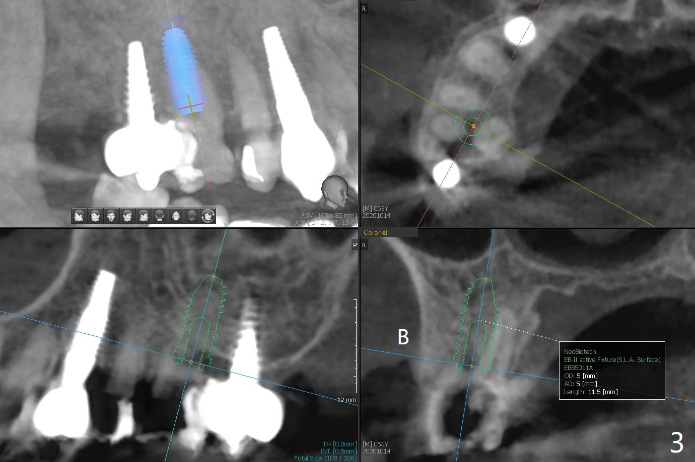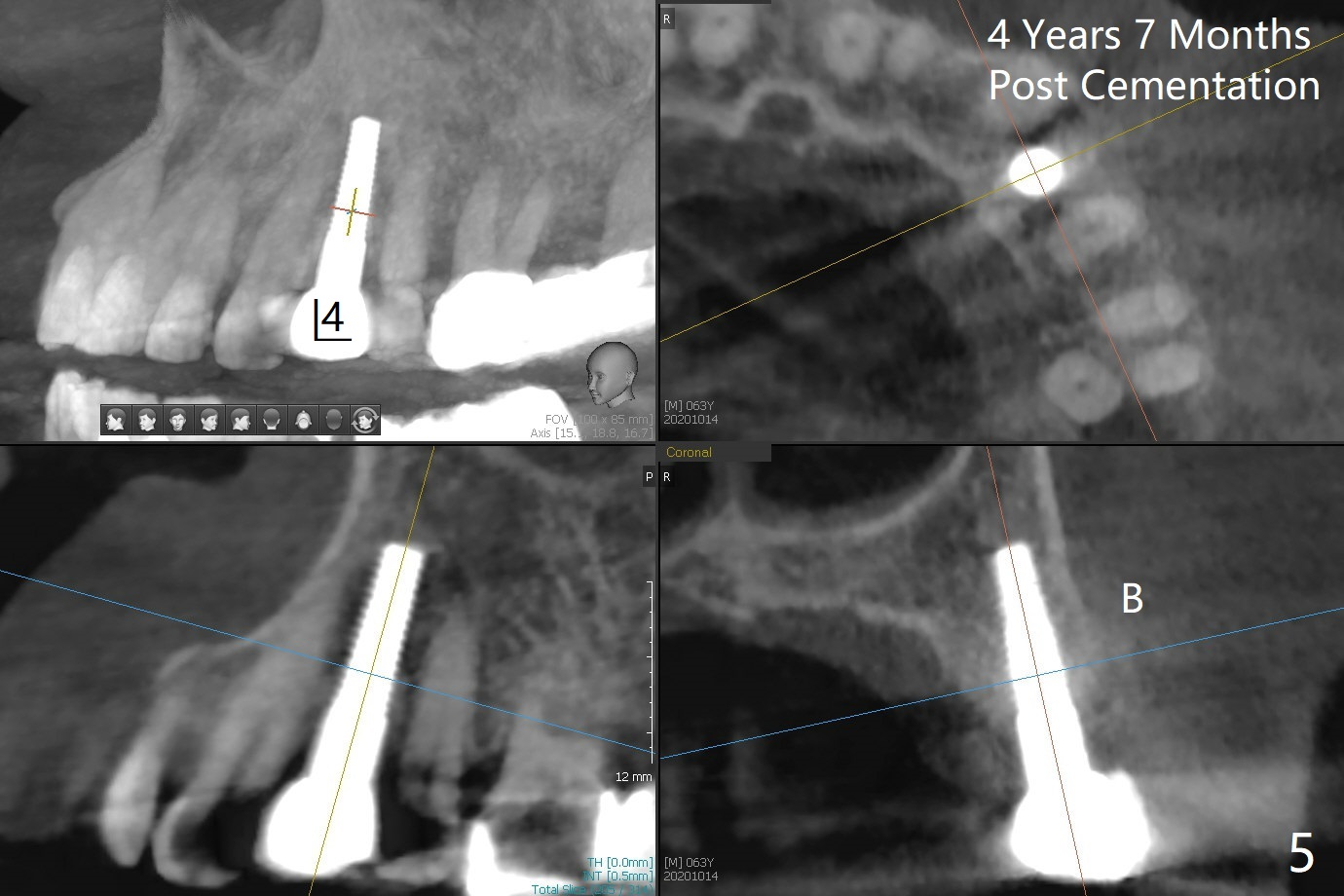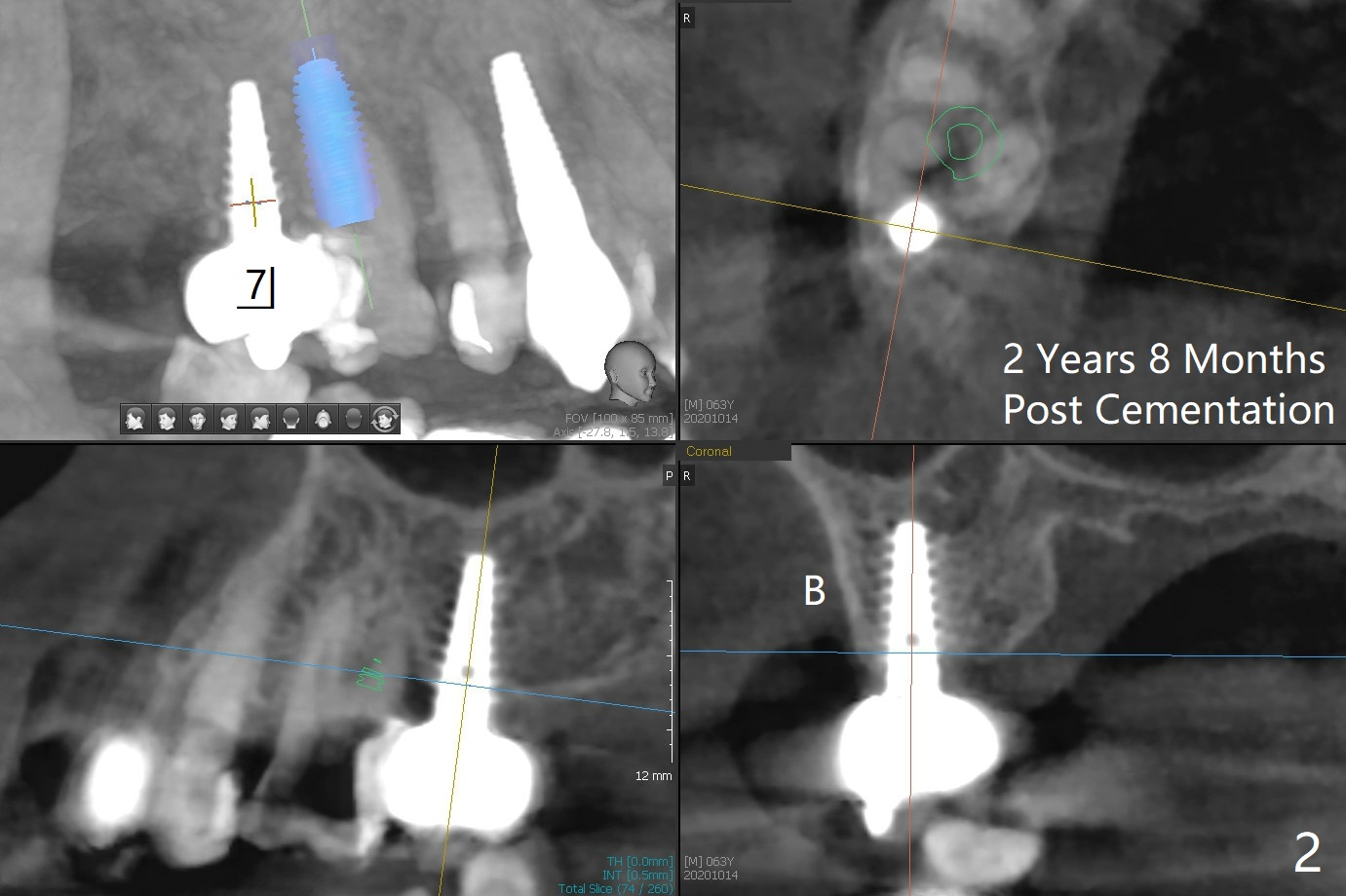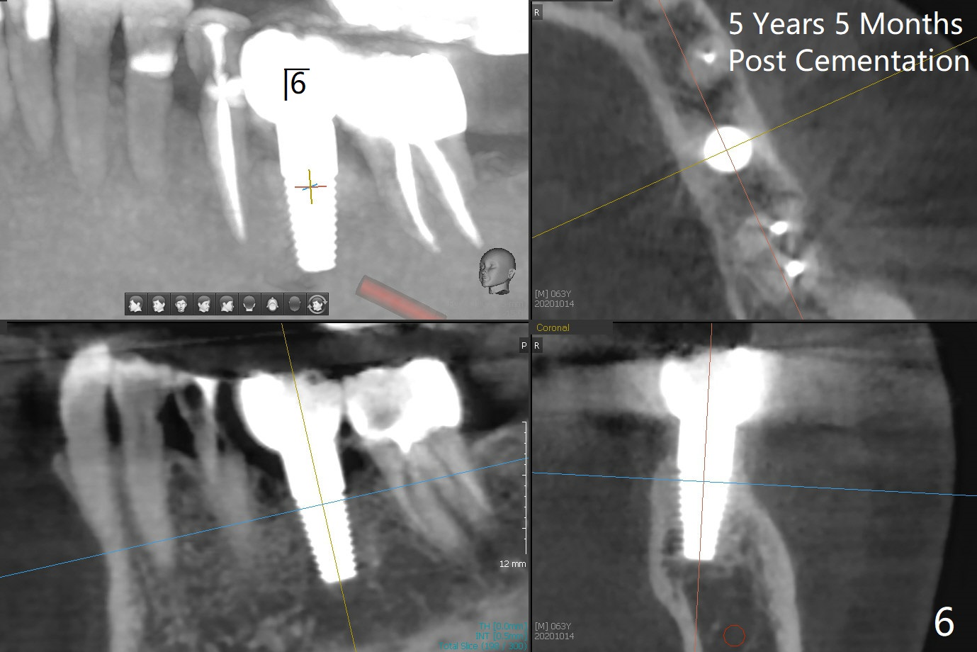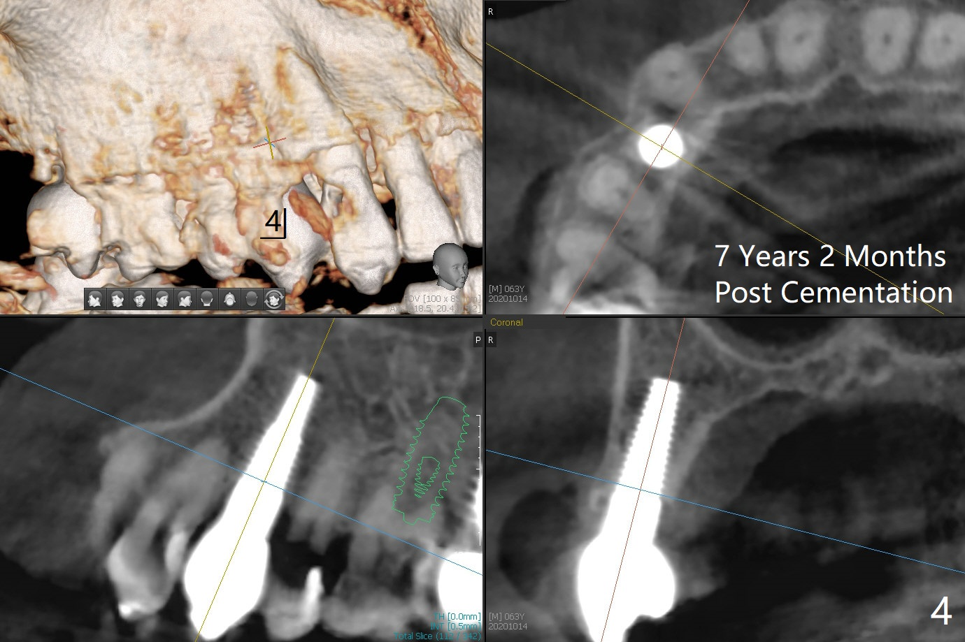 63岁女右上6远中龋齿在邻牙植牙牙冠粘固后2年8个月坏的严重(图一),病人决定拔除种植。之前嘱咐她回来修复,部分由于新冠病毒,她拖延治疗。今后需要建立一个植牙后完整随访和严密检查系统,减少继发龋。分析四个植牙(图二,四至六)表明骨质宽度优越,右上6即刻种植应该没问题(图三)。植体选择与邻近一致。Prevent Molar Periimplantitis (Protocols, Table) No Neighboring Caries Metronidazole Magicore Cases 手术 2 Xin Wei, DDS, PhD, MS 1st edition 10/14/2020, last revision 11/17/2020