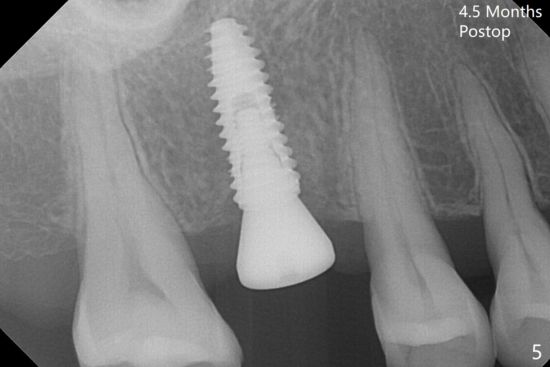 There is mild crestal bone loss 4.5 months postop (Fig.5).