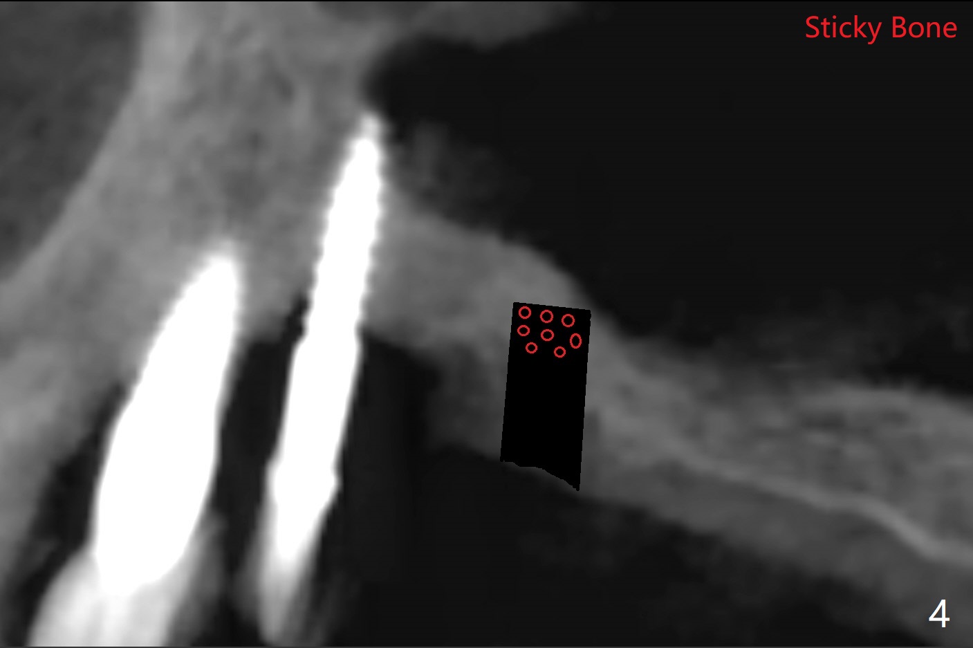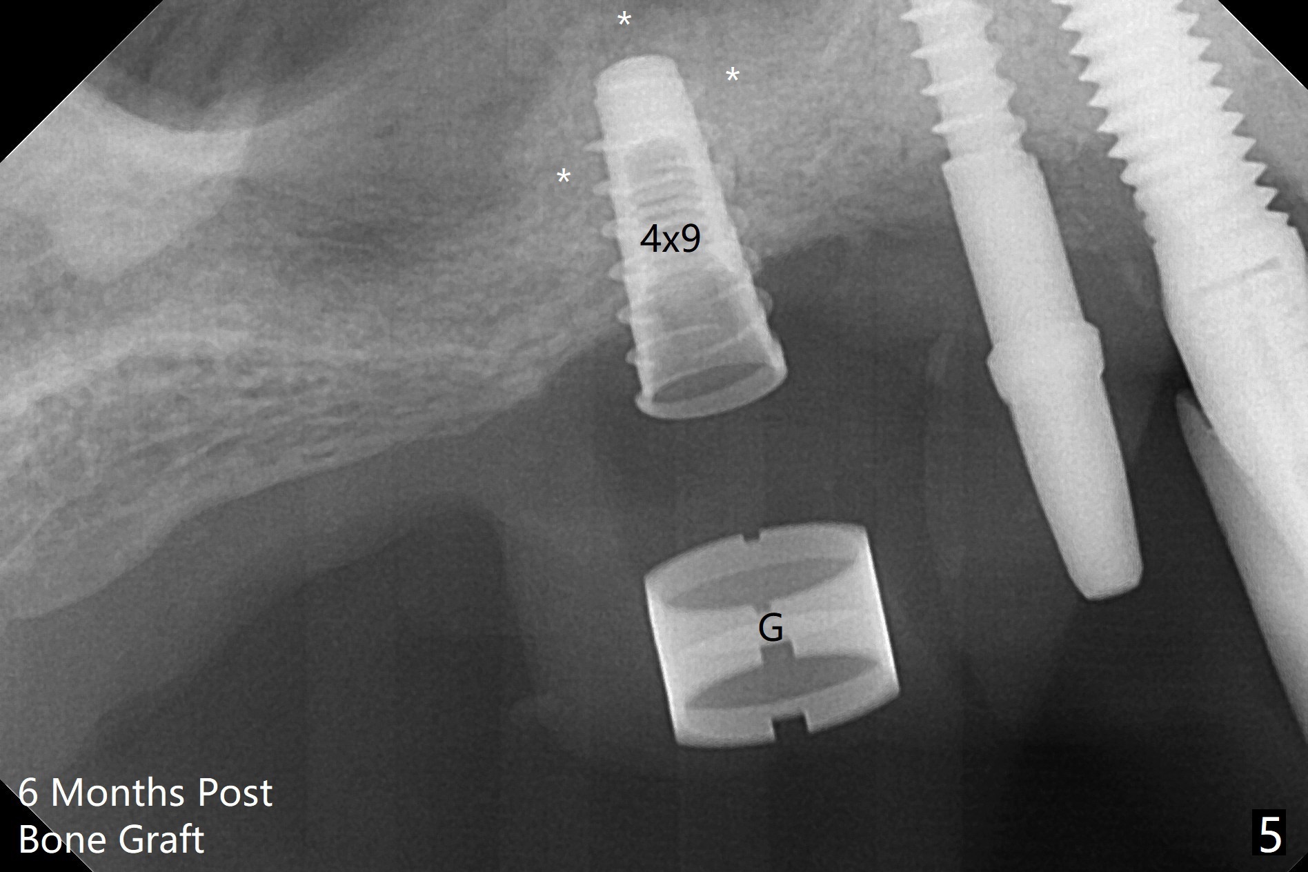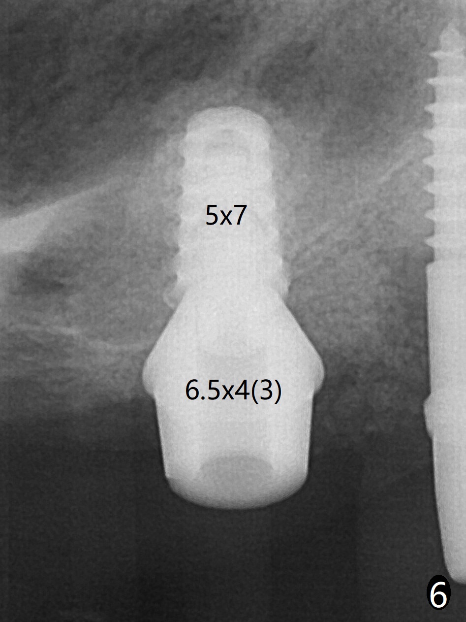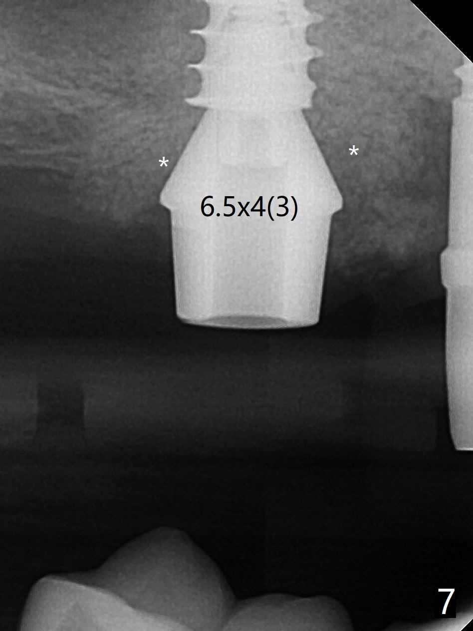 术前清晨复习3号牙窦底,中央是植骨(图一,二:*(皮质骨:密度高,质地可能软)),由于窦底斜坡,术前估计穿孔可能最先发生在远中,术中的确如此(图三:<(使用4毫米钻头后)),放置粘性骨粉(图四),利用导板(图五:G)和4x9毫米报废植体提升(*)。使用4.5毫米钻头,放置半张PRF膜,骨粉,5x7毫米植体以及修复基台,最后在后两者周围放置骨粉(图六,七:*(腭侧一个螺纹暴露)),覆盖1/2PRF膜,缝合,树脂敷料。
