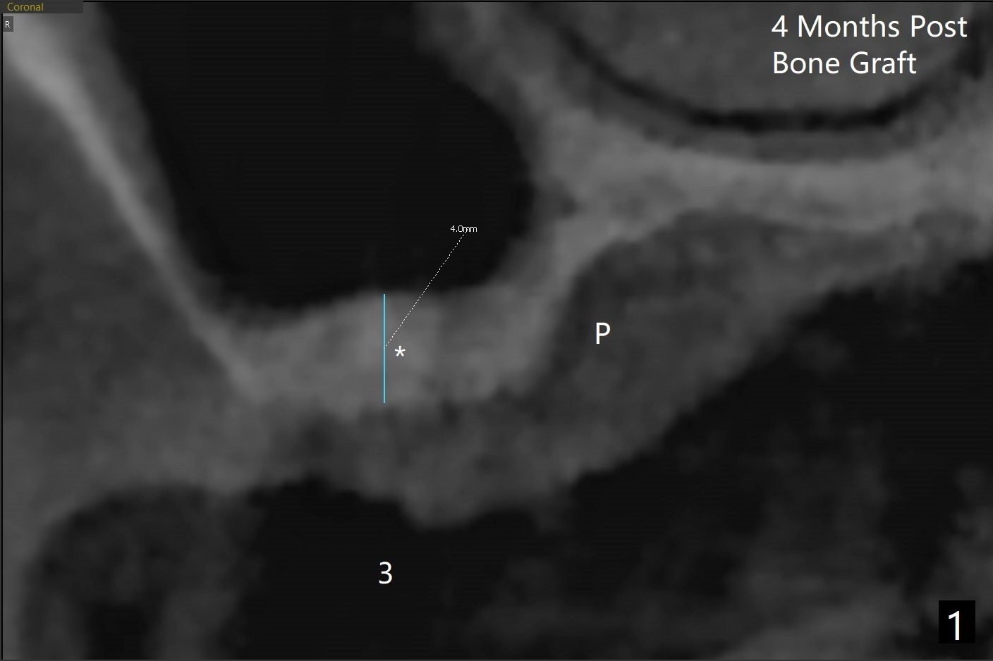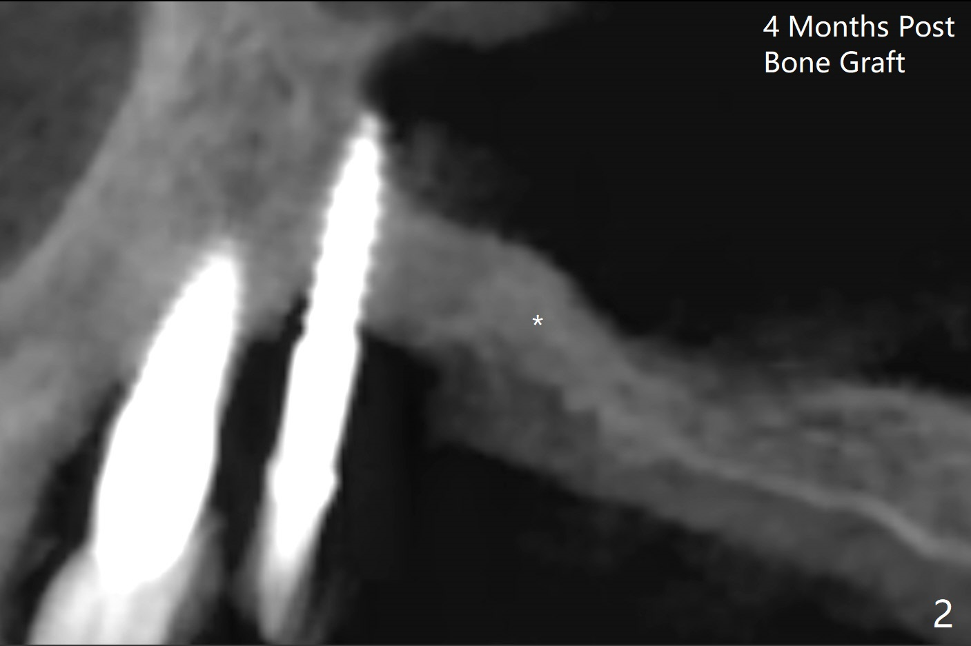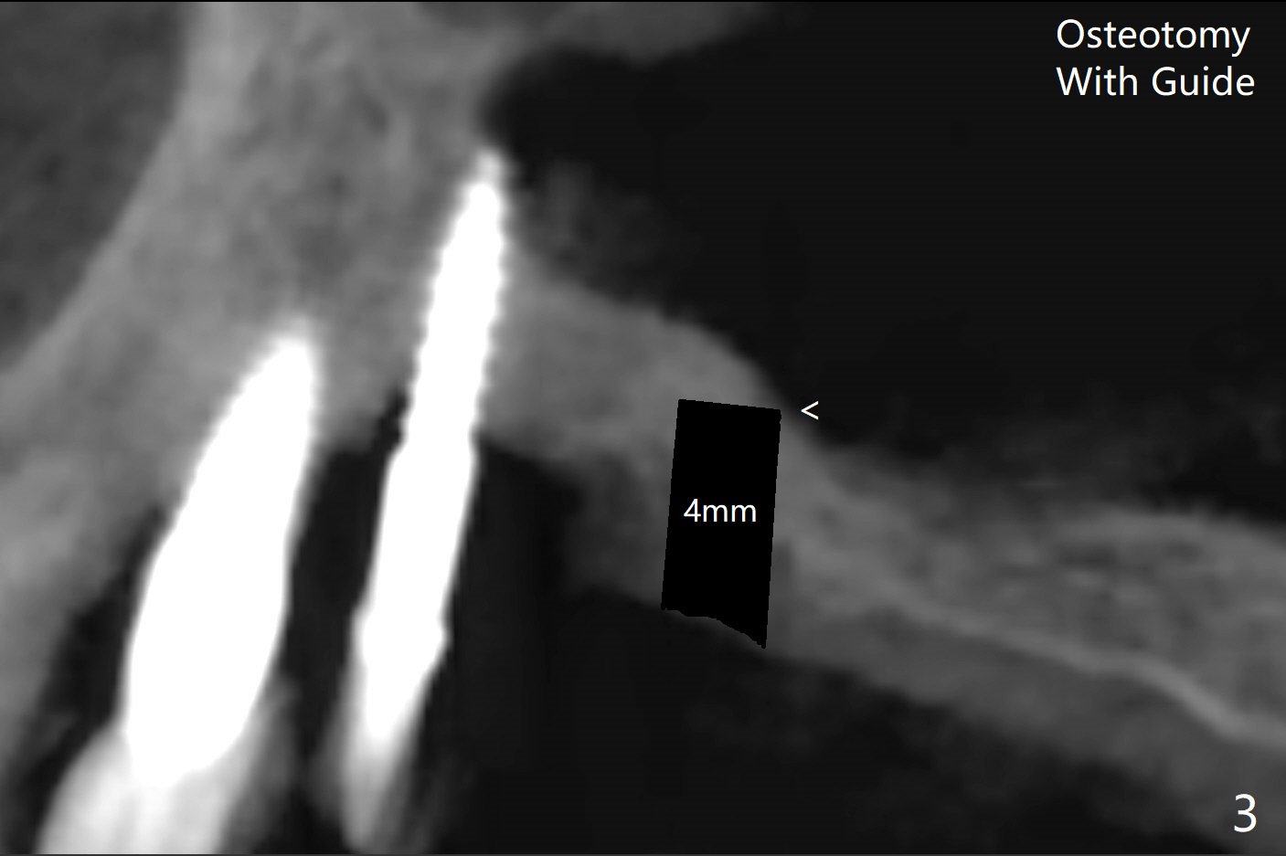 术前清晨复习3号牙窦底,中央是植骨(图一,二:*(皮质骨:密度高,质地可能软)),由于窦底斜坡,术前估计穿孔可能最先发生在远中,术中的确如此(图三:<(使用4毫米钻头后)),放置粘性骨粉(图四),利用导板(图五:G)和4x9毫米报废植体提升(*)。使用4.5毫米钻头,放置半张PRF膜,骨粉,5x7毫米植体以及修复基台,最后在后两者周围放置骨粉(图六,七:*(腭侧一个螺纹暴露)),覆盖1/2PRF膜,缝合,树脂敷料。