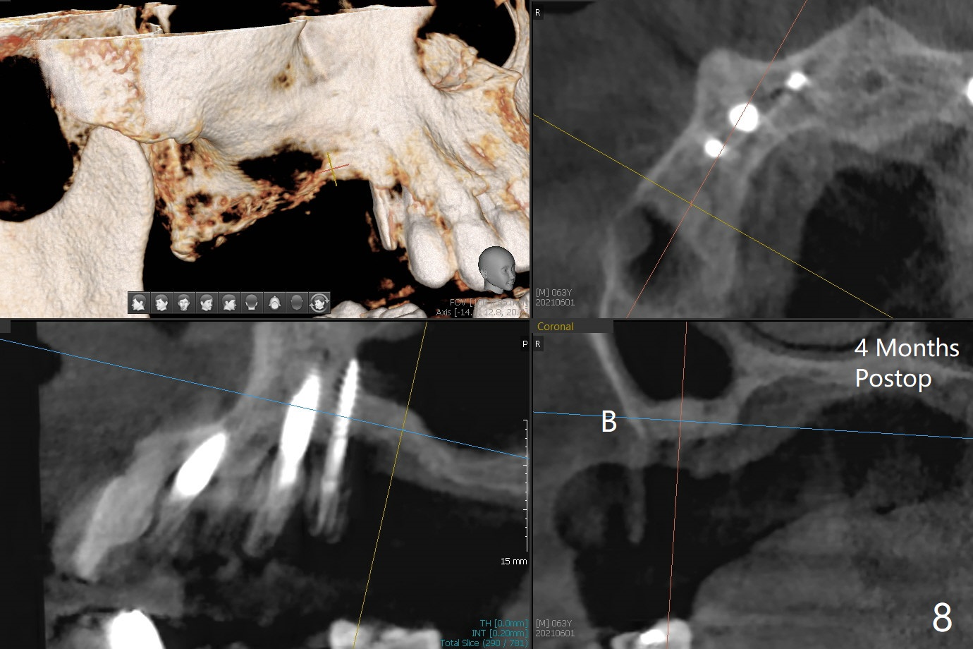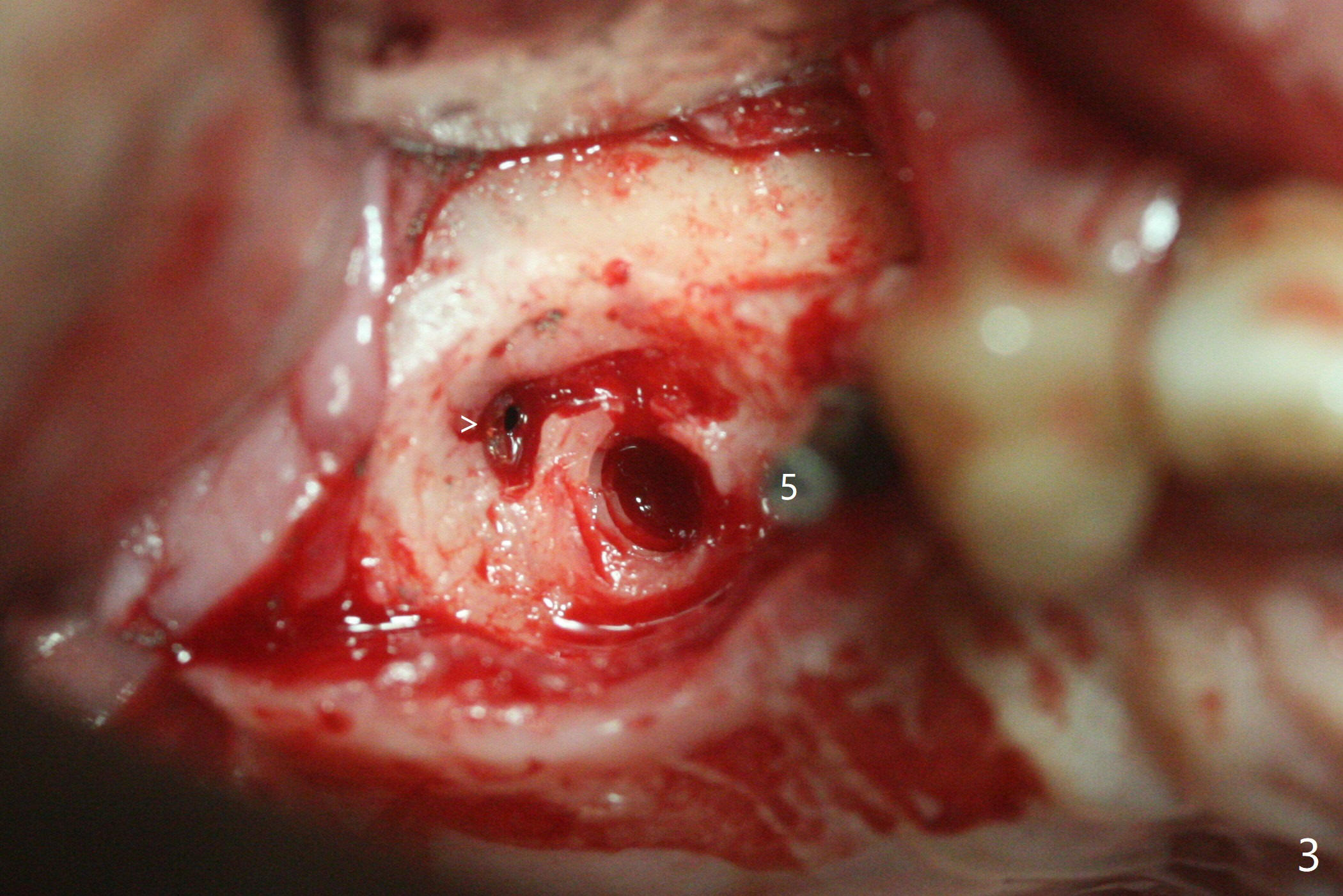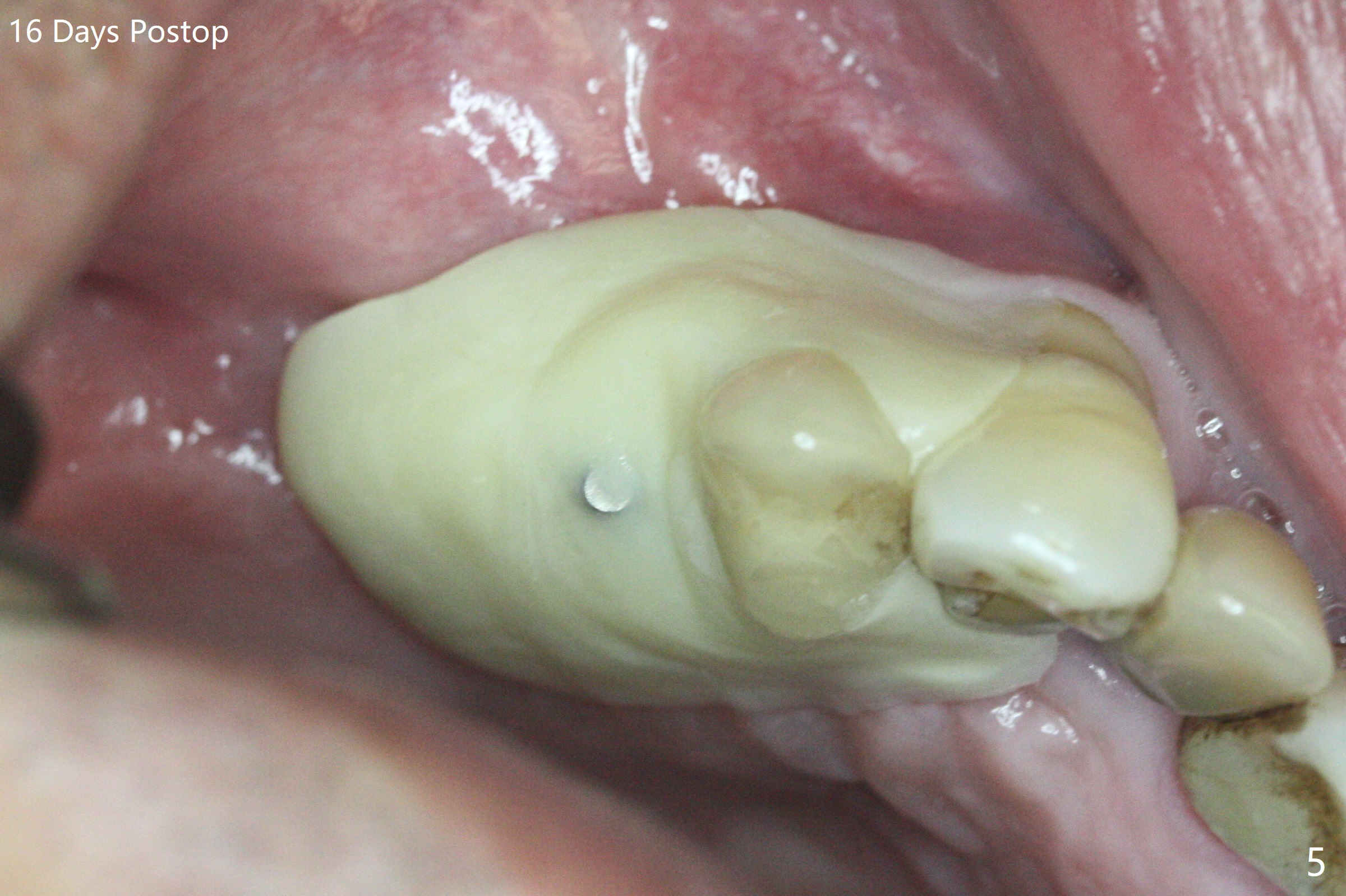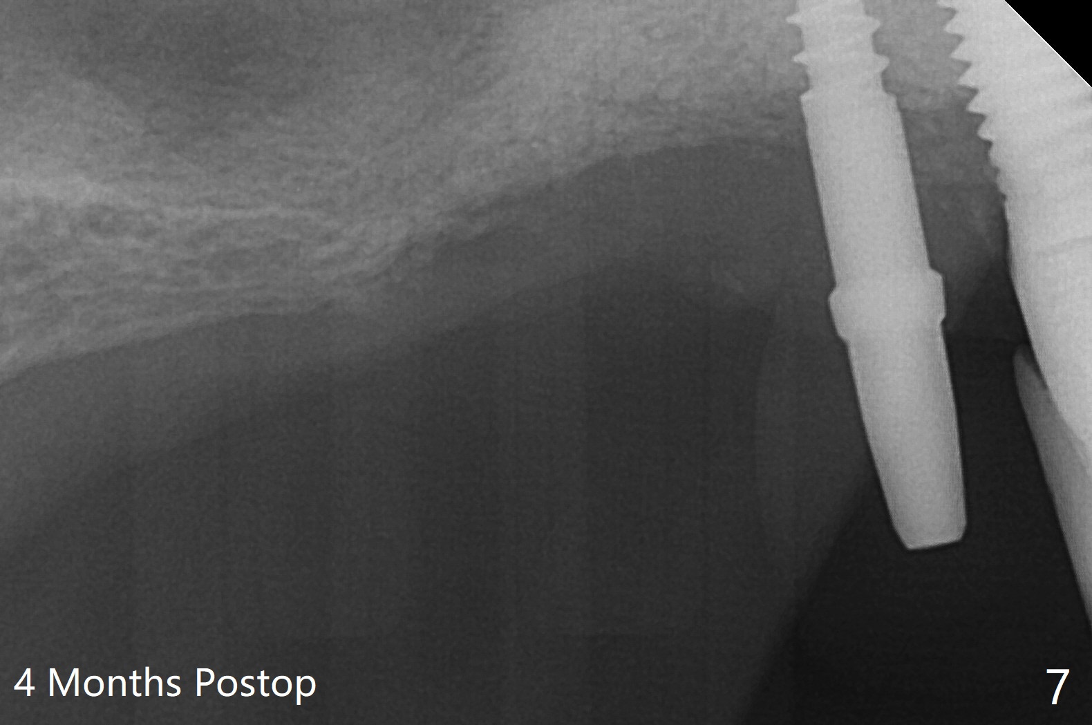 术前检查发现右上6颊侧牙龈沟有脓性分泌物(图一),翻瓣显示骨质吸收(图二),曾经植骨三次,只好去骨,取出植体,远中颊侧轻度上颌窦穿孔(图三:>),塞入小块PRF膜后,患处放置粘性骨粉,覆盖两块PRF膜和一片GEM Cap(9-12月吸收膜),三者近中一端有一个洞,挂在5基台上固定。术后即刻根尖片显示骨粉充填穿孔(图四:>),6缺失区以及5远中(*)。术后第二天牙周敷料脱落,术后16天病人回来,要求剪除缝线,伤口尚未关闭,下面黄色骨粉好像挺牢靠;为了减少继续骨粉丧失,使用树脂敷料(图五)。术后四周敷料稳定,牙龈健康,但是不放心下面伤口愈合,暂时没有撤去敷料。术后四个月骨质高度不足(图六至八),上颌窦膜薄,提升不容易,可放置5x7.3毫米植体(IBS),PRF。Return to No Caries 4 Placement 种植杂谈 Xin Wei, DDS, PhD, MS 1st edition 01/26/2021, last revision 07/30/2021