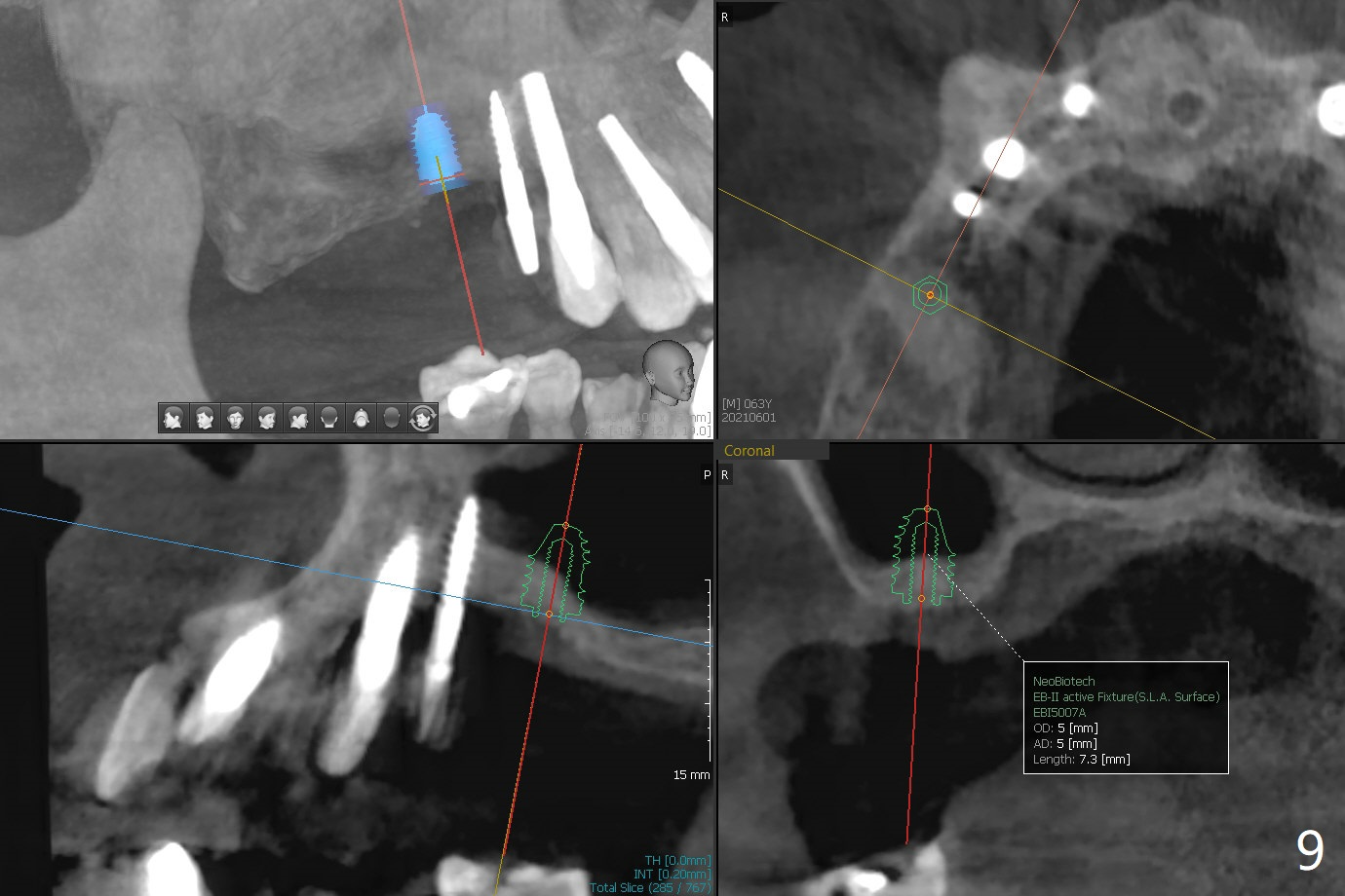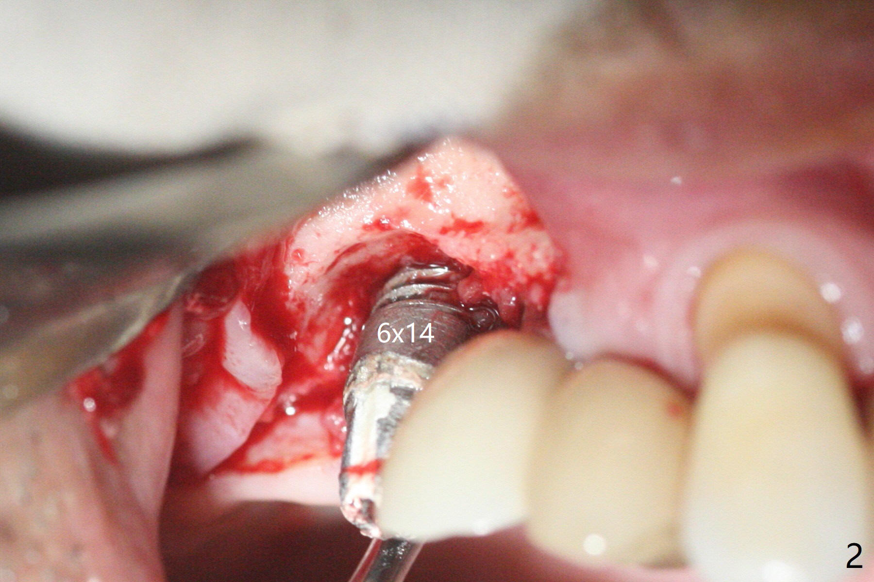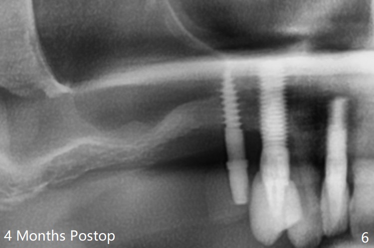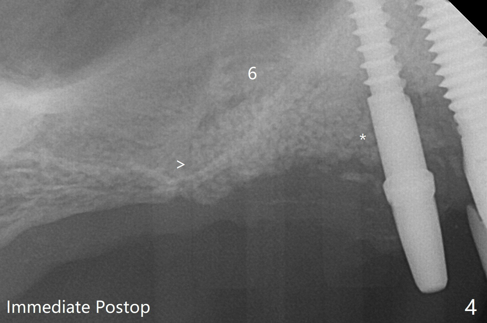 术前检查发现右上6颊侧牙龈沟有脓性分泌物(图一),翻瓣显示骨质吸收(图二),曾经植骨三次,只好去骨,取出植体,远中颊侧轻度上颌窦穿孔(图三:>),塞入小块PRF膜后,患处放置粘性骨粉,覆盖两块PRF膜和一片GEM Cap(9-12月吸收膜),三者近中一端有一个洞,挂在5基台上固定。术后即刻根尖片显示骨粉充填穿孔(图四:>),6缺失区以及5远中(*)。术后第二天牙周敷料脱落,术后16天病人回来,要求剪除缝线,伤口尚未关闭,下面黄色骨粉好像挺牢靠;为了减少继续骨粉丧失,使用树脂敷料(图五)。术后四周敷料稳定,牙龈健康,但是不放心下面伤口愈合,暂时没有撤去敷料。术后四个月骨质高度不足(图六至八),上颌窦膜薄,提升不容易,可放置5x7.3毫米植体(IBS),PRF。Return to No Caries 4 Placement 种植杂谈 Xin Wei, DDS, PhD, MS 1st edition 01/26/2021, last revision 07/30/2021