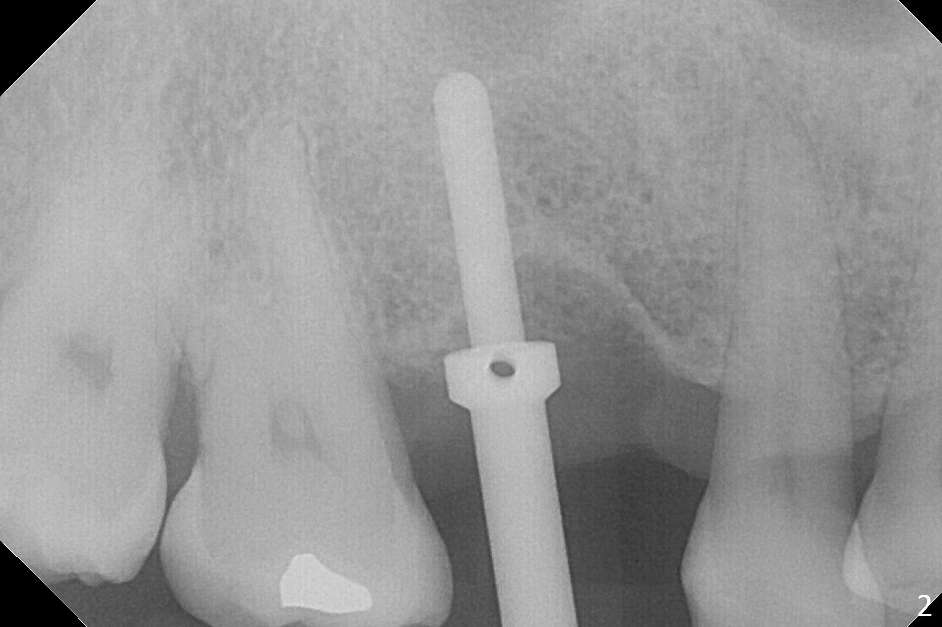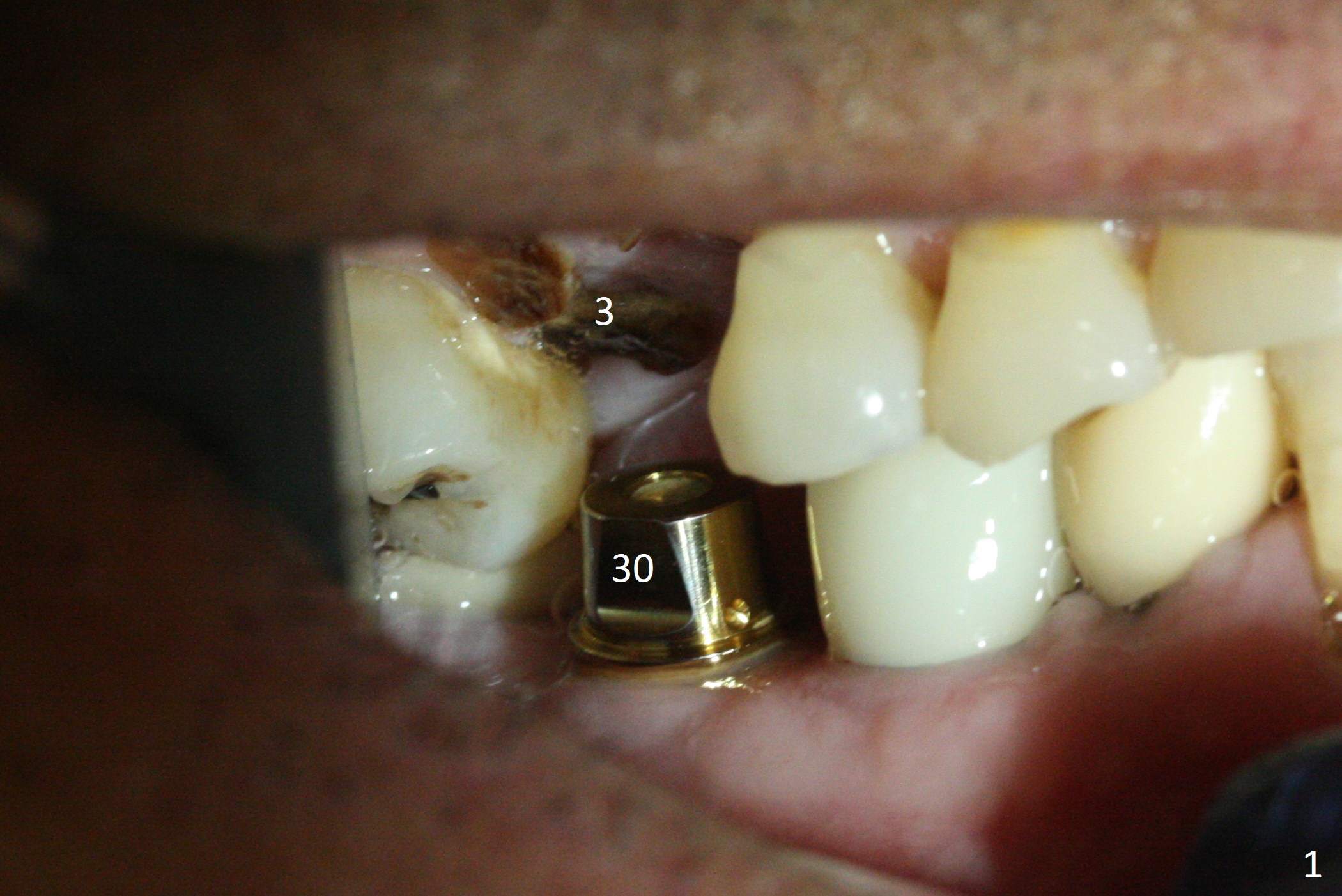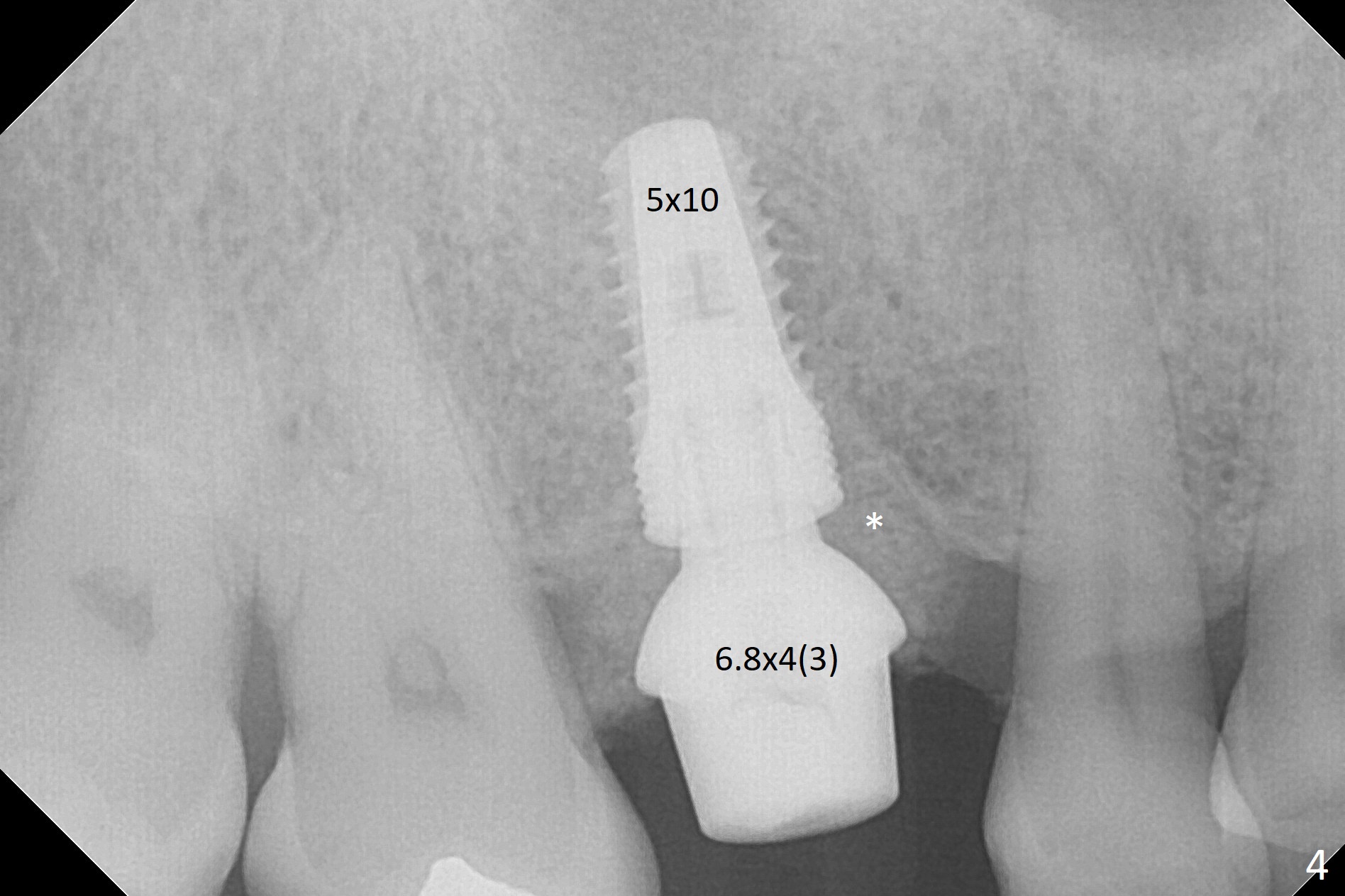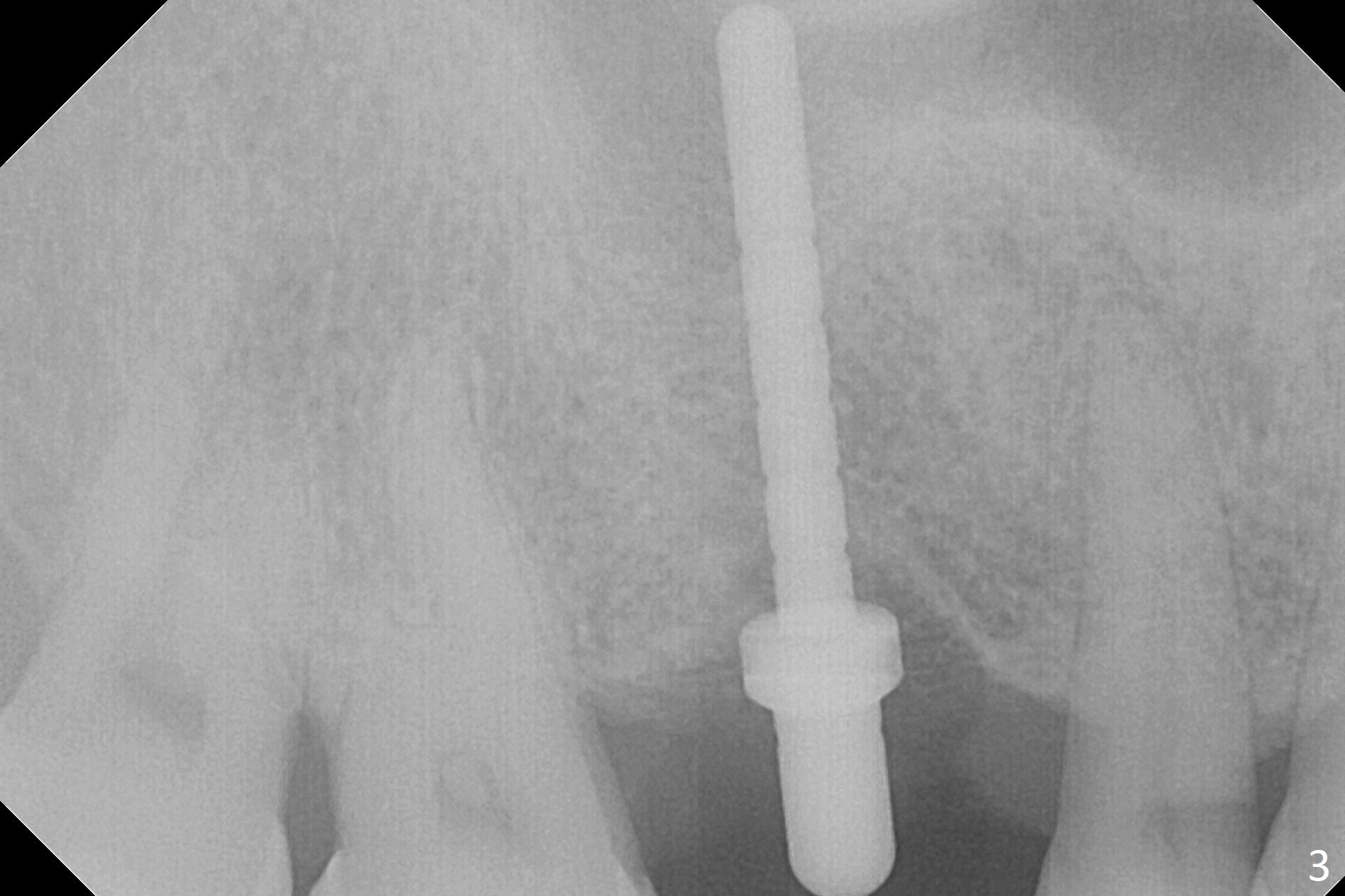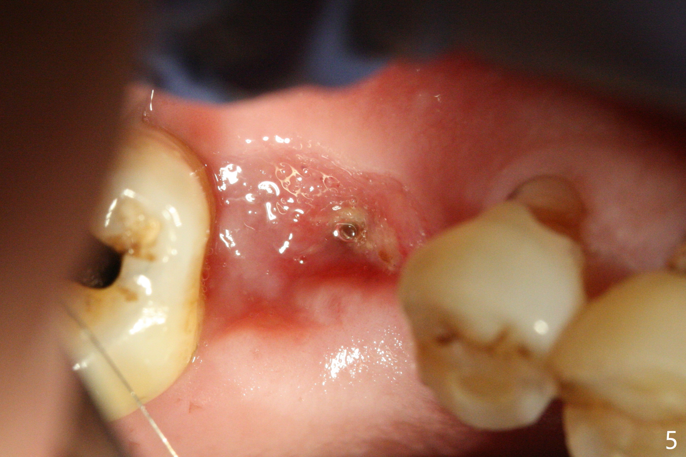 The clearance between the residual roots of the tooth #3 and the abutment at #30 seems to be somewhat limited (Fig.1). The initial osteotomy depth is 10 mm (Fig.2). After moving the osteotomy mesially, the depth increases to 12 mm; a parallel pin is inserted for 16 mm (Fig.3 with sinus membrane perforation). The depth of the rest of the osteotomy is 10 mm with placement of a 5x10 mm implant with >50 Ncm (Fig.4); with insertion of a 6.8x4(3) mm abutment and Vera Graft (*), an immediate provisional is fabricated. Collagen plug is used to seal the gap between the provisional and the gingiva. The abutment dislodges nearly 1 month postop; the wound has healed (Fig.5). A 8.2x5(4) mm healing abutment is placed to keep the soft tissue configurement.