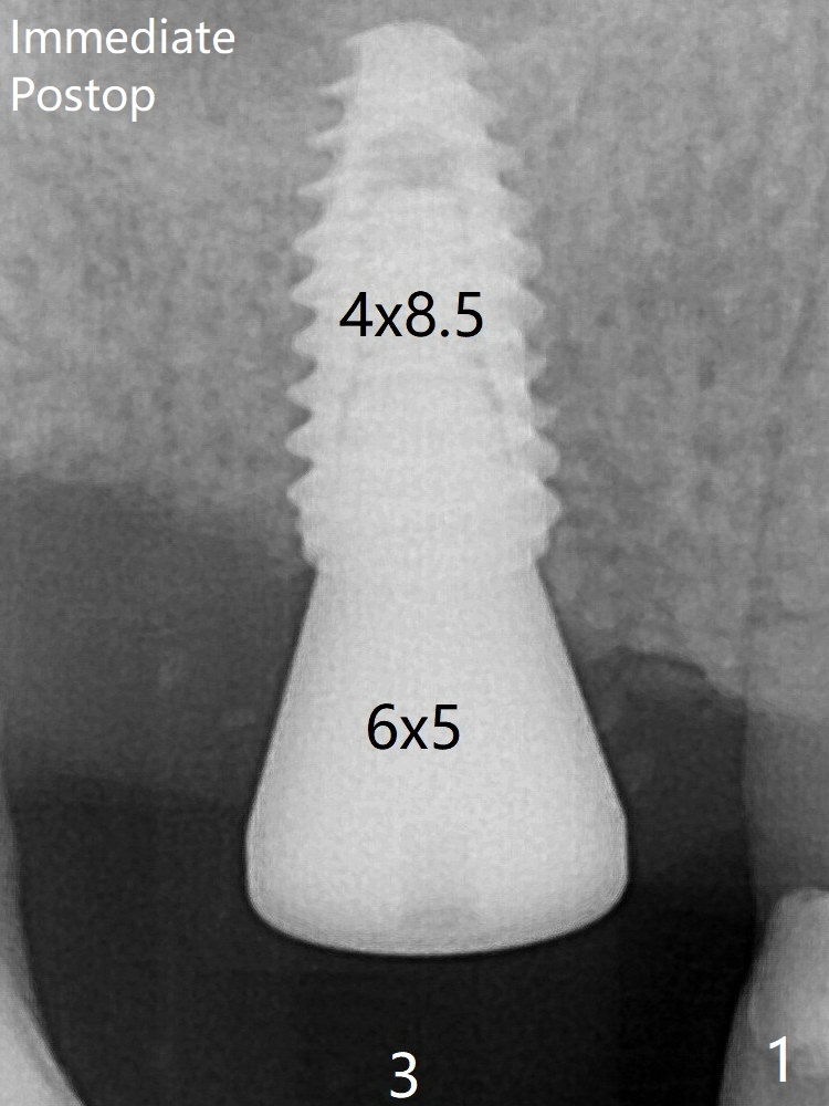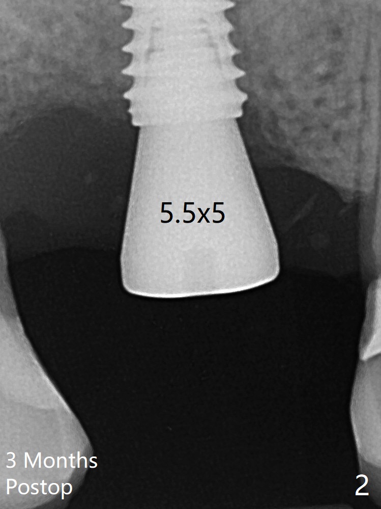 愈合基台术后三个月脱落,他再次要求修复,甚至提出退款,不愿意回诊所,因为他有糖尿病,新冠病毒高危人群。 放置小号愈合基台(图二)。他原来托牙是Valplast,没有occlusal rests,不能经过修改临时使用,可能将直接放置修复基台做临时牙冠。放置修复基台后(图三(术后三个月)),制作临时牙冠时,发现前者有些松动,后者就没有粘固。当基台完全就位,它最冠方与植体没有间隙(箭头),根方有间隙(空心箭头)。其实愈合基台也是一样(图一,二)。