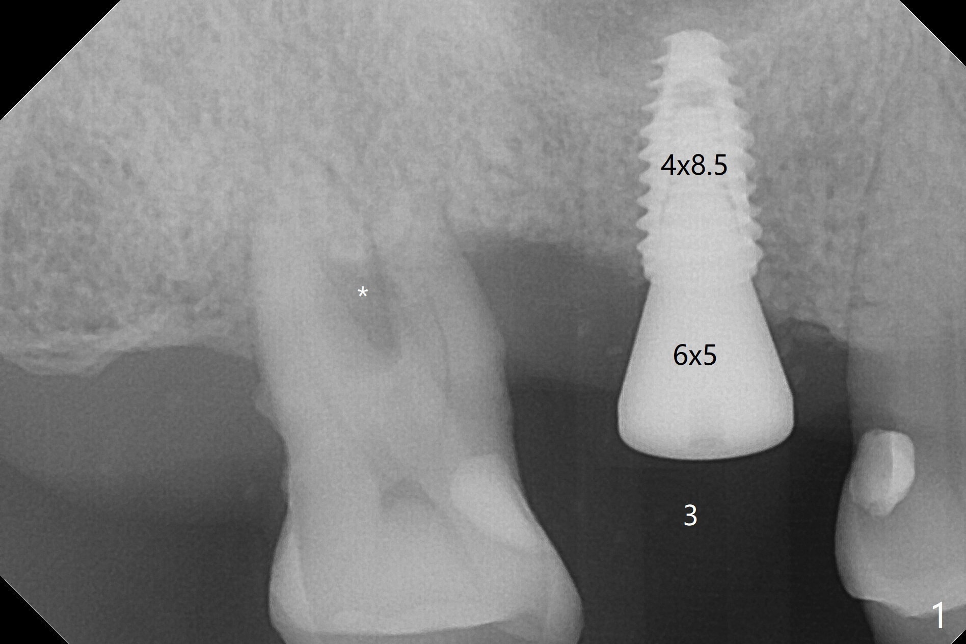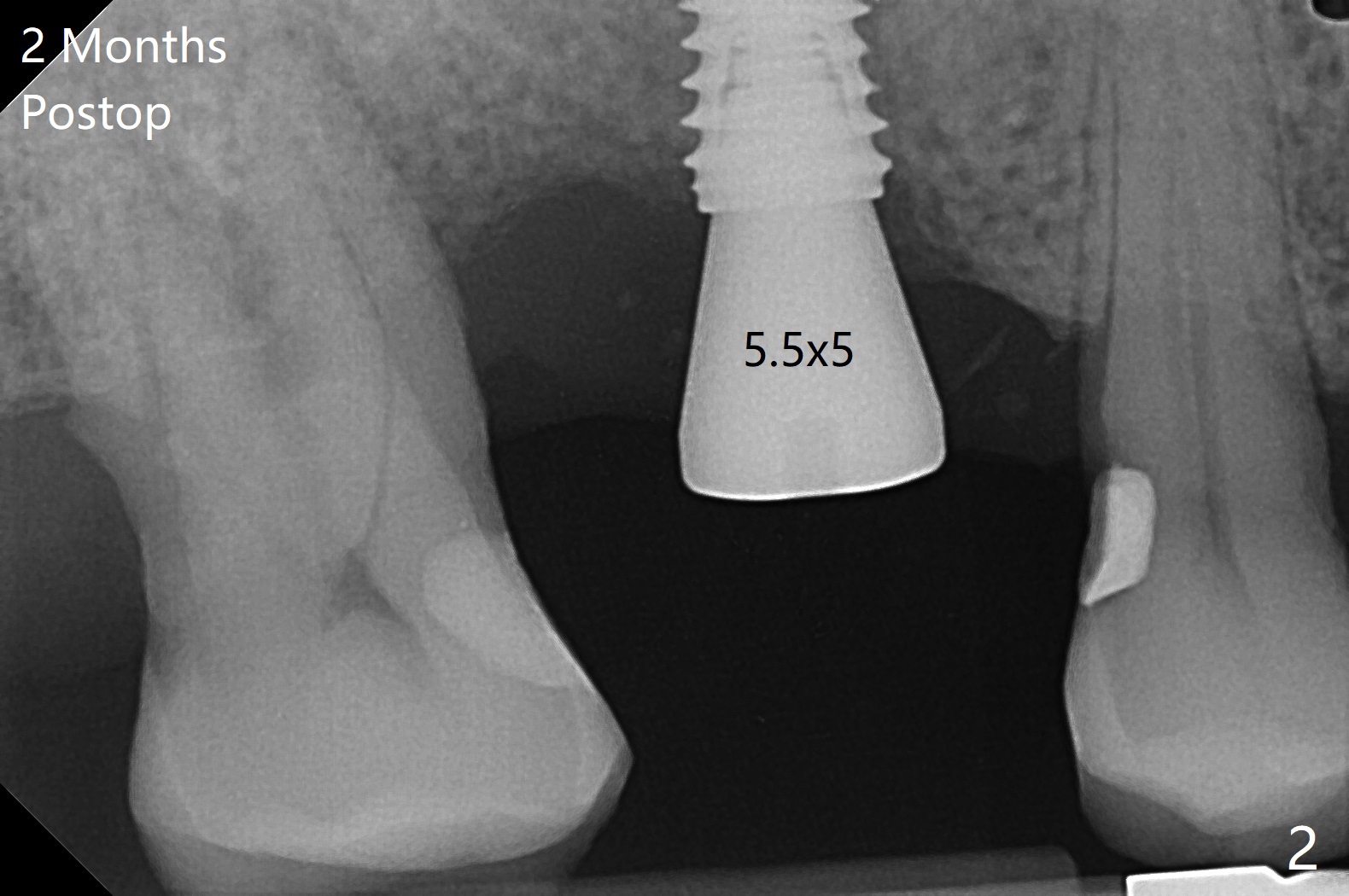 当3号牙短小植体植入后(图一(骨质密度高)),病人纳闷为什么不给他装临时牙冠,术后两个月又打电话要求提前修复,因为放置愈合基台,他无法使用局部托牙(单个牙),而14号牙即刻植牙即刻修复。他无法理解我们苦衷,有什么补救方法?