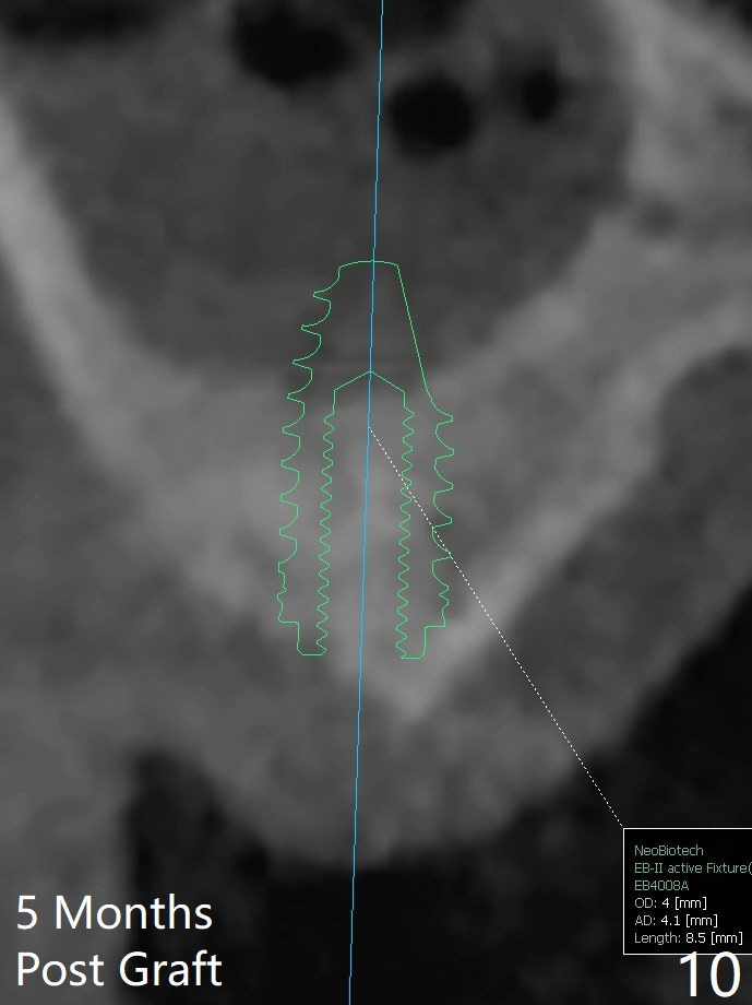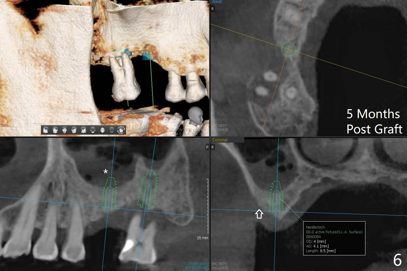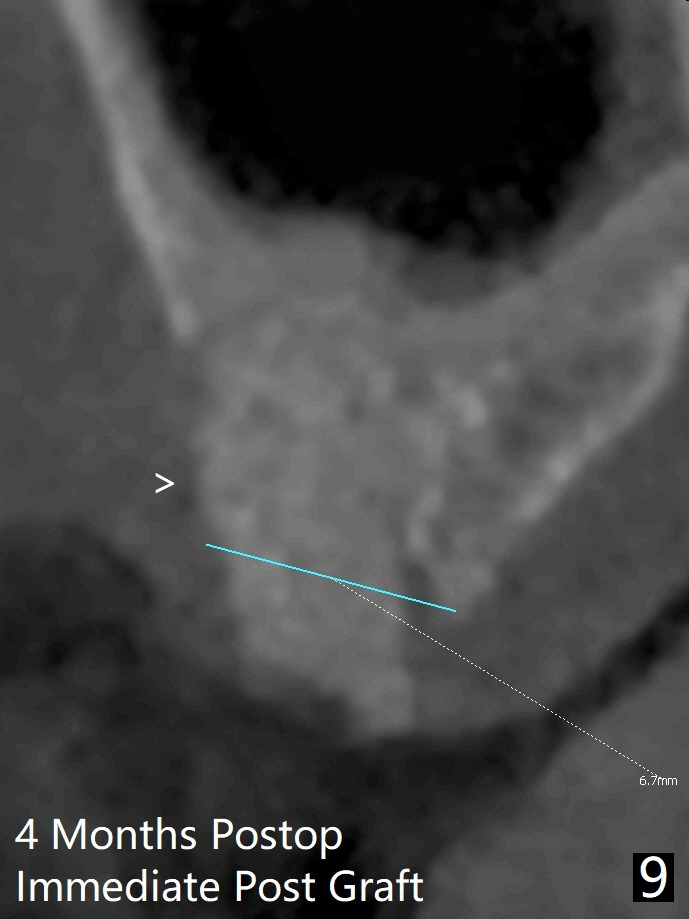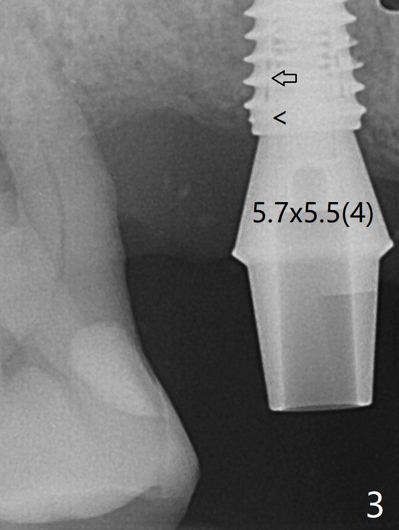 使用来自钻头的自体骨做提升,植体植入后,颊侧骨板薄,刚好骨下。使用5.5毫米profile drill后,放置愈合基台,术后三个月脱落,他再次要求修复,甚至提出退款,不愿意回诊所,因为他有糖尿病,新冠病毒高危人群。 放置小号愈合基台(图二)。他原来托牙是Valplast,没有occlusal rests,不能经过修改临时使用,可能将直接放置修复基台做临时牙冠。放置修复基台后(图三(术后三个月)),制作临时牙冠时,发现前者有些松动,后者就没有粘固。当基台完全就位,它最冠方与植体没有间隙(箭头),根方有间隙(空心箭头)。其实愈合基台也是一样(图一,二)。后来植体松动(术后4个月),拔除,植骨(图四),颊侧骨板缺失(图五:B)。植骨后5个月2号牙疼痛需要拔除种植(图七),与3号牙一起种植(图六),颊侧骨板修复,但是高度有所下降(箭头)。The narrow ridge with the intact buccal plate (Fig.8 >) can hold a 4x8.5 mm implant. The buccal plate is lost 4 months postop (Fig.9) and restores 5 months post graft (Fig.10). Return to Upper Molar Immediate Implant, No Deviation Coronal and Apical Gap in IBS implant Protect Graft Xin Wei, DDS, PhD, MS 1st edition 06/22/2020, last revision 05/02/2021