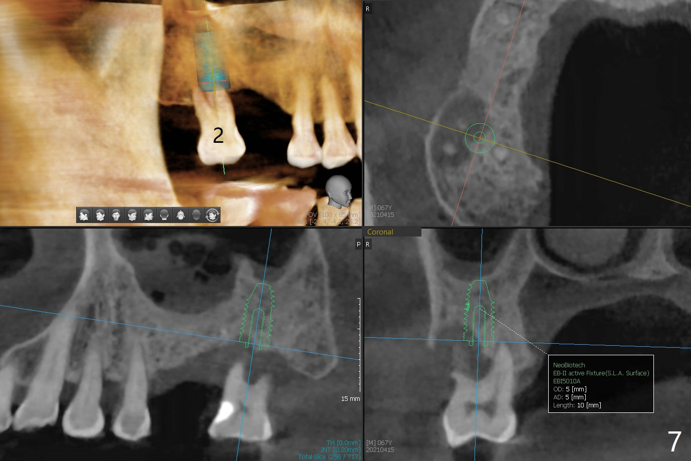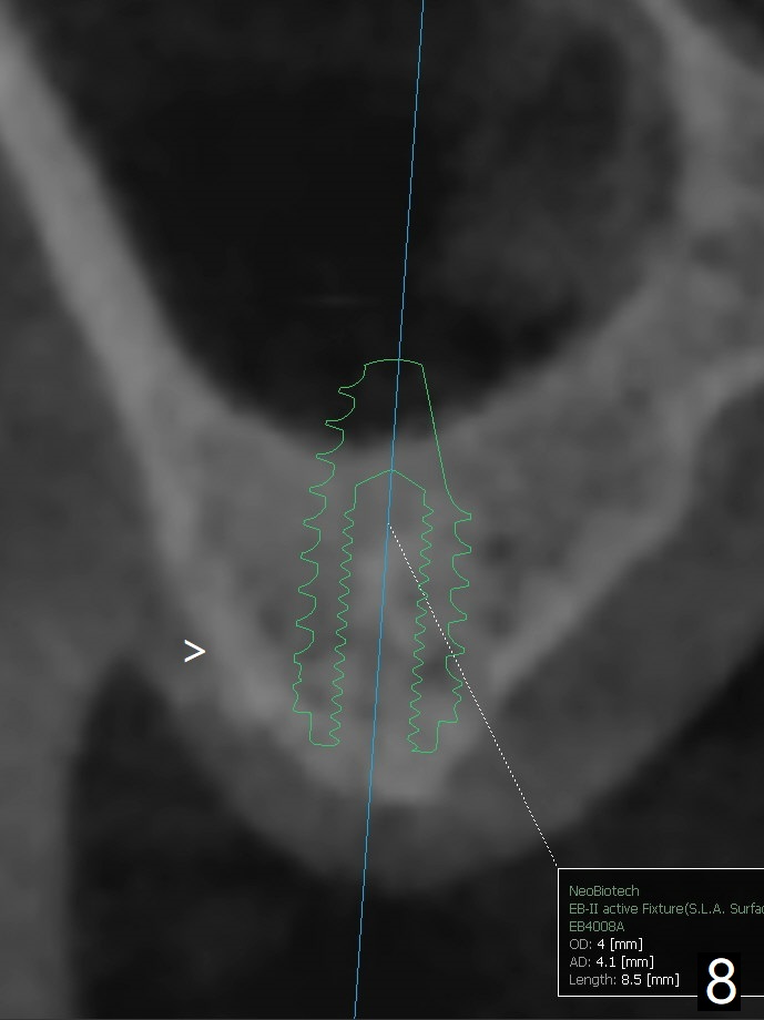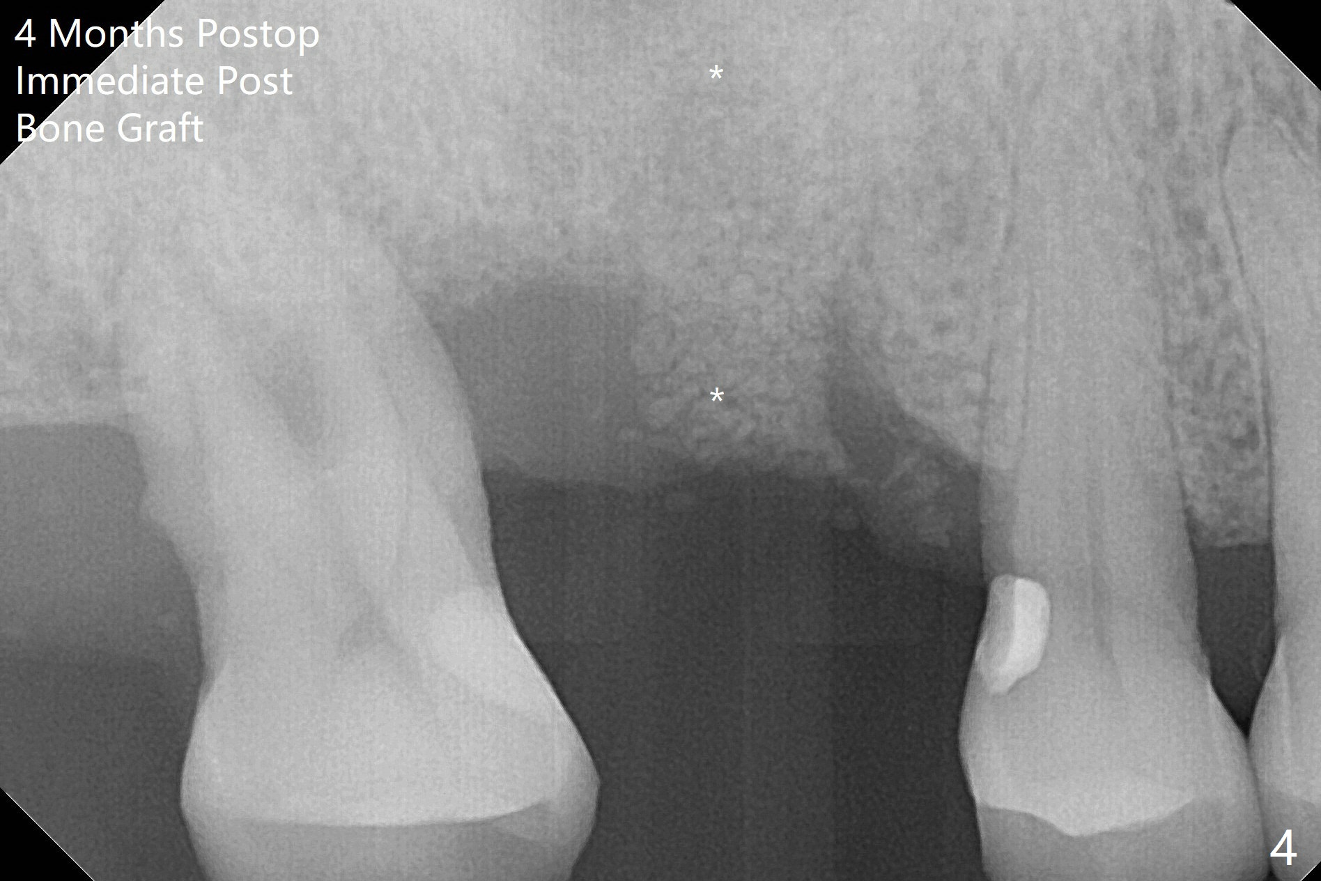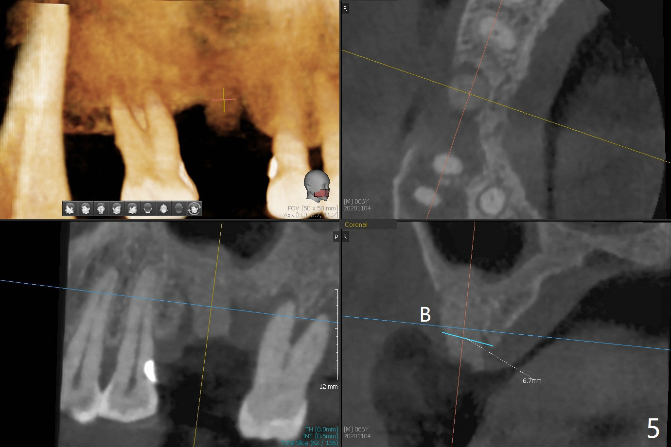 使用来自钻头的自体骨做提升,植体植入后,颊侧骨板薄,刚好骨下。使用5.5毫米profile drill后,放置愈合基台,术后三个月脱落,他再次要求修复,甚至提出退款,不愿意回诊所,因为他有糖尿病,新冠病毒高危人群。 放置小号愈合基台(图二)。他原来托牙是Valplast,没有occlusal rests,不能经过修改临时使用,可能将直接放置修复基台做临时牙冠。放置修复基台后(图三(术后三个月)),制作临时牙冠时,发现前者有些松动,后者就没有粘固。当基台完全就位,它最冠方与植体没有间隙(箭头),根方有间隙(空心箭头)。其实愈合基台也是一样(图一,二)。后来植体松动(术后4个月),拔除,植骨(图四),颊侧骨板缺失(图五:B)。植骨后5个月2号牙疼痛需要拔除种植(图七),与3号牙一起种植(图六),颊侧骨板修复,但是高度有所下降(箭头)。The narrow ridge with the intact buccal plate (Fig.8 >) can hold a 4x8.5 mm implant. The buccal plate is lost 4 months postop (Fig.9) and restores 5 months post graft (Fig.10). Return to Upper Molar Immediate Implant, No Deviation Coronal and Apical Gap in IBS implant Protect Graft Xin Wei, DDS, PhD, MS 1st edition 06/22/2020, last revision 05/02/2021