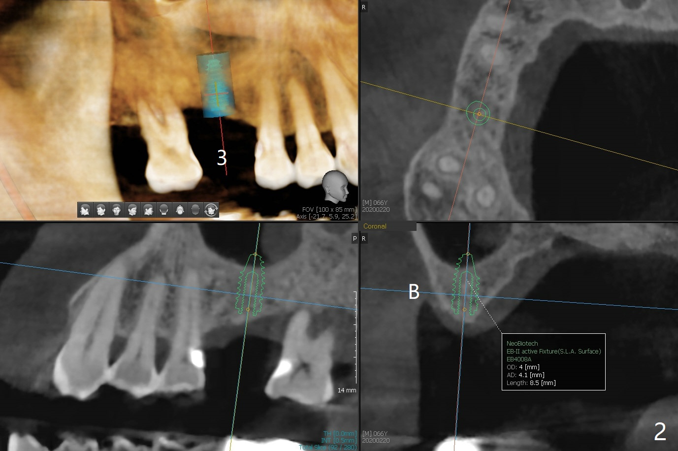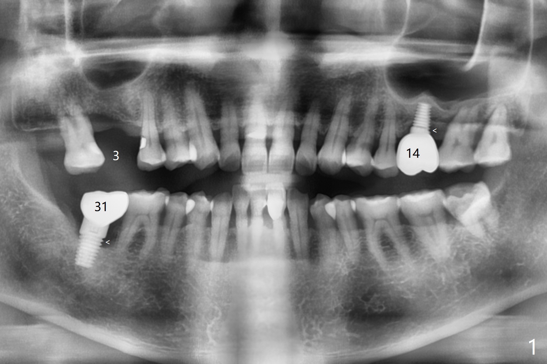 A 66-year-old man returns for #3 implant 1 month post #14 cementa-tion (Fig.1). The latter was placed free hand because of emergency (tooth fracture). The distal threads are exposed (<) probably related to shallow placement (imprecision) or insufficient bone graft. In spite of the wide ridge at #31 (data not shown), there is bone loss around the extremely large implant (<). In contrast, the ridge at #3 is narrow (Fig.2). A small implant (4x11 mm tissue-level) will be placed precisely in depth and position relative to the ridge with guide.