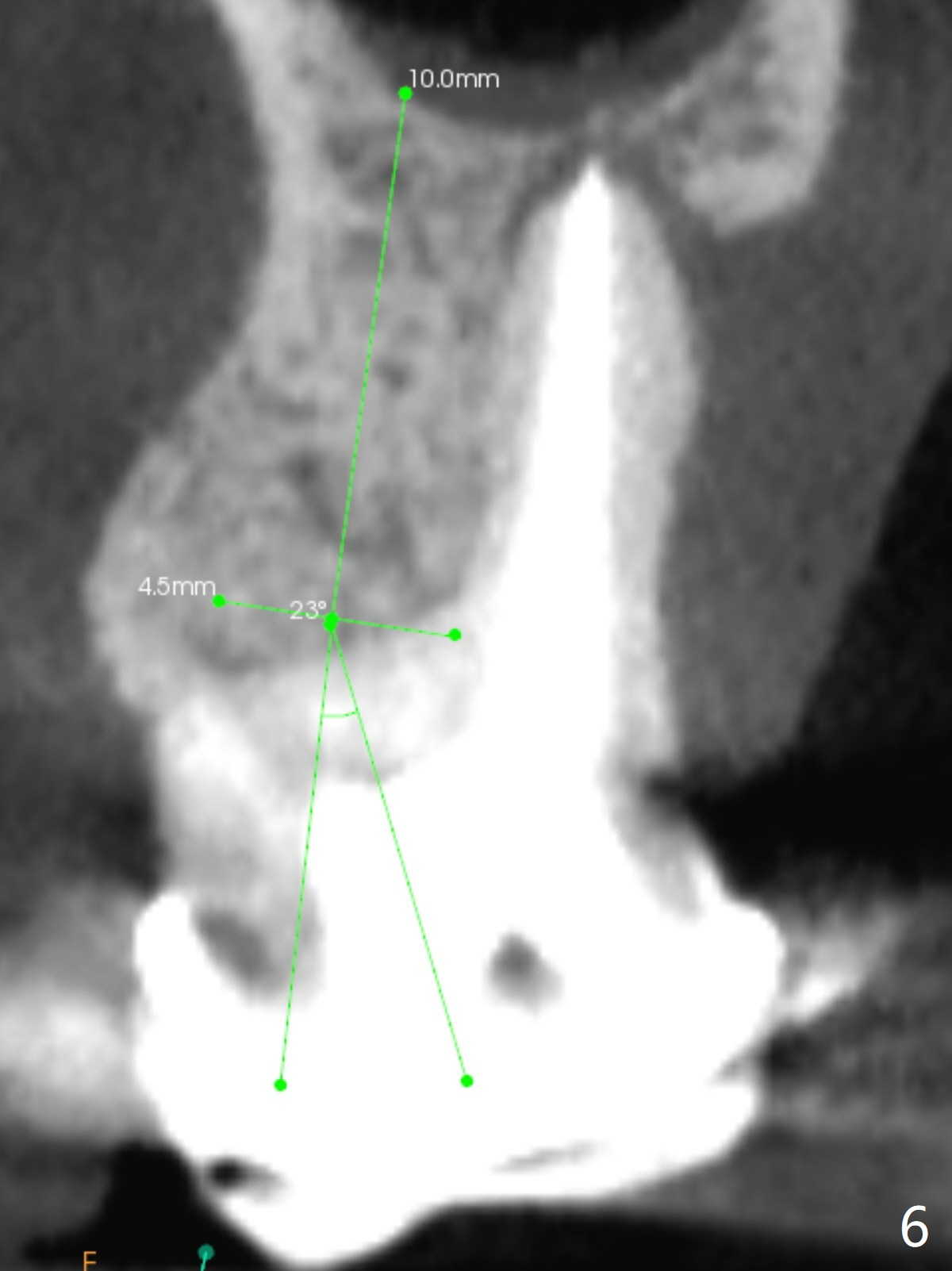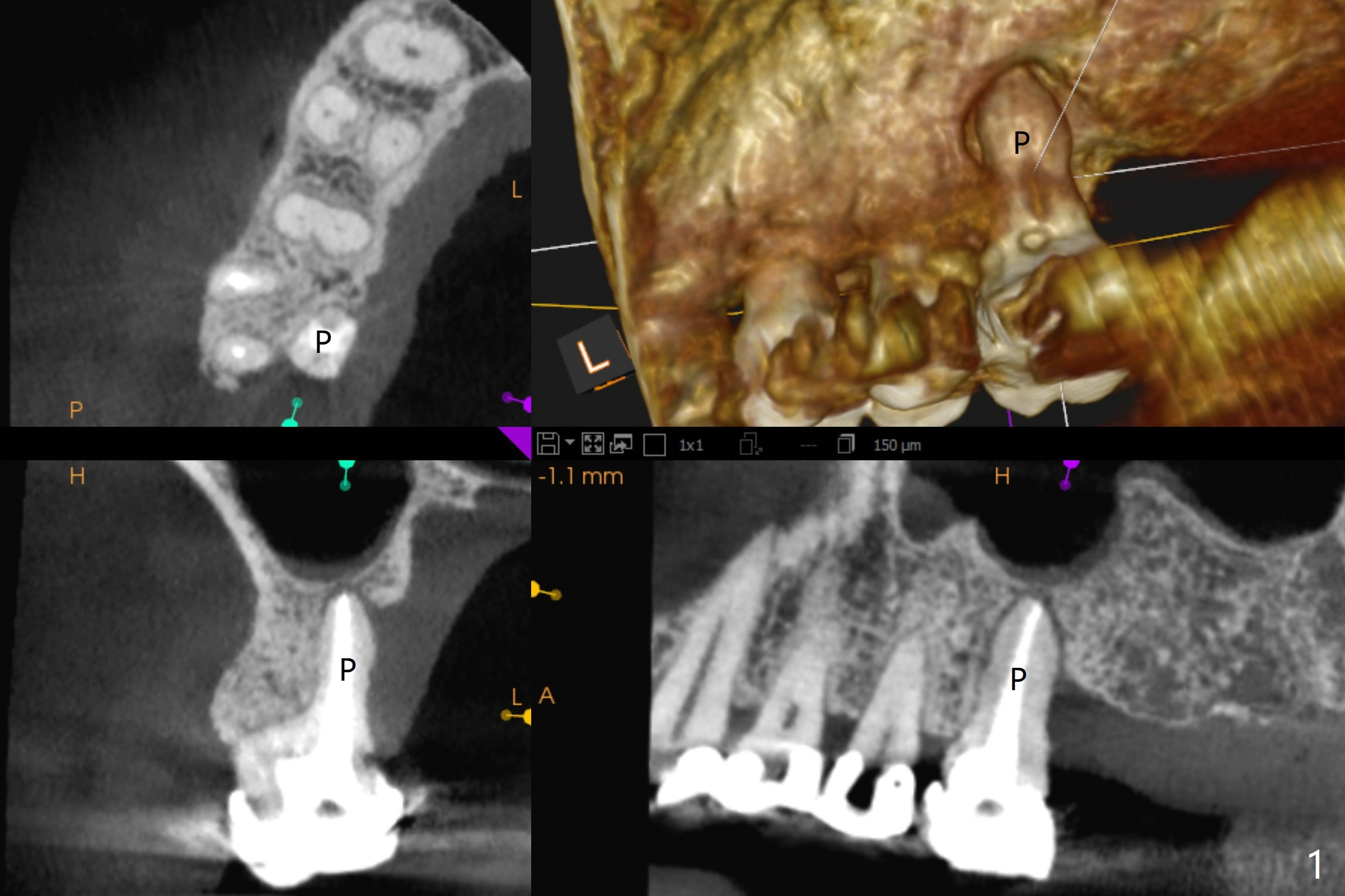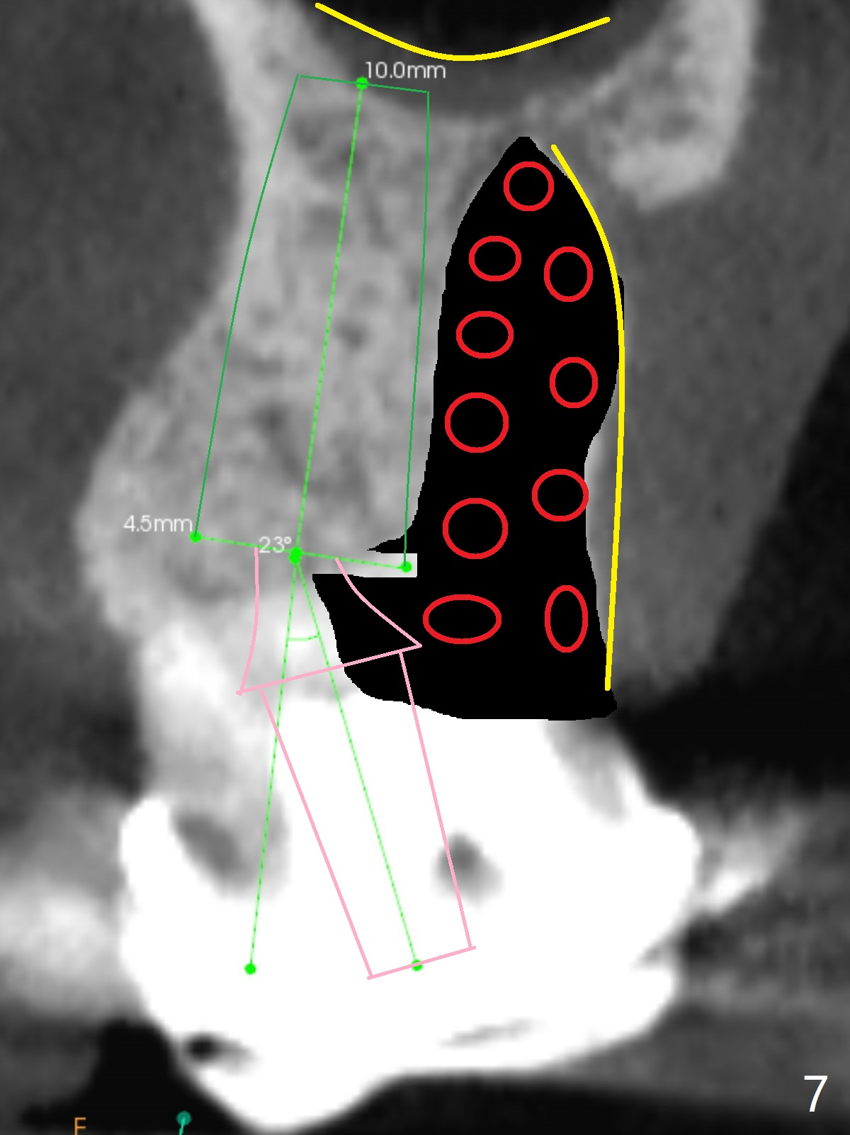 A 52-year-old woman has had chronic abscess associated with the tooth #3. The palatal root is exposed (Fig.1 P), suggesting root fracture. The apex of the mesiobuccal root seems to stick out of the buccal plate (Fig.2 *). The root canal filling is incomplete in the distobuccal root (Fig.3 *). The tooth appears to have guarded prognosis. Extraction and immediate implant is apparently a better option (Fig.4,5). It would be safer to start osteotomy in the middle of the remaining septum (Fig.6, as compared to Fig.5). After sinus lift with PRF membrane (Fig.7 yellow curved line) and implant placement (green), another piece of PRF membrane will be placed against the palatal wall of the socket, followed by bone graft (red circles) and a 25-degree angled abutment (pink).