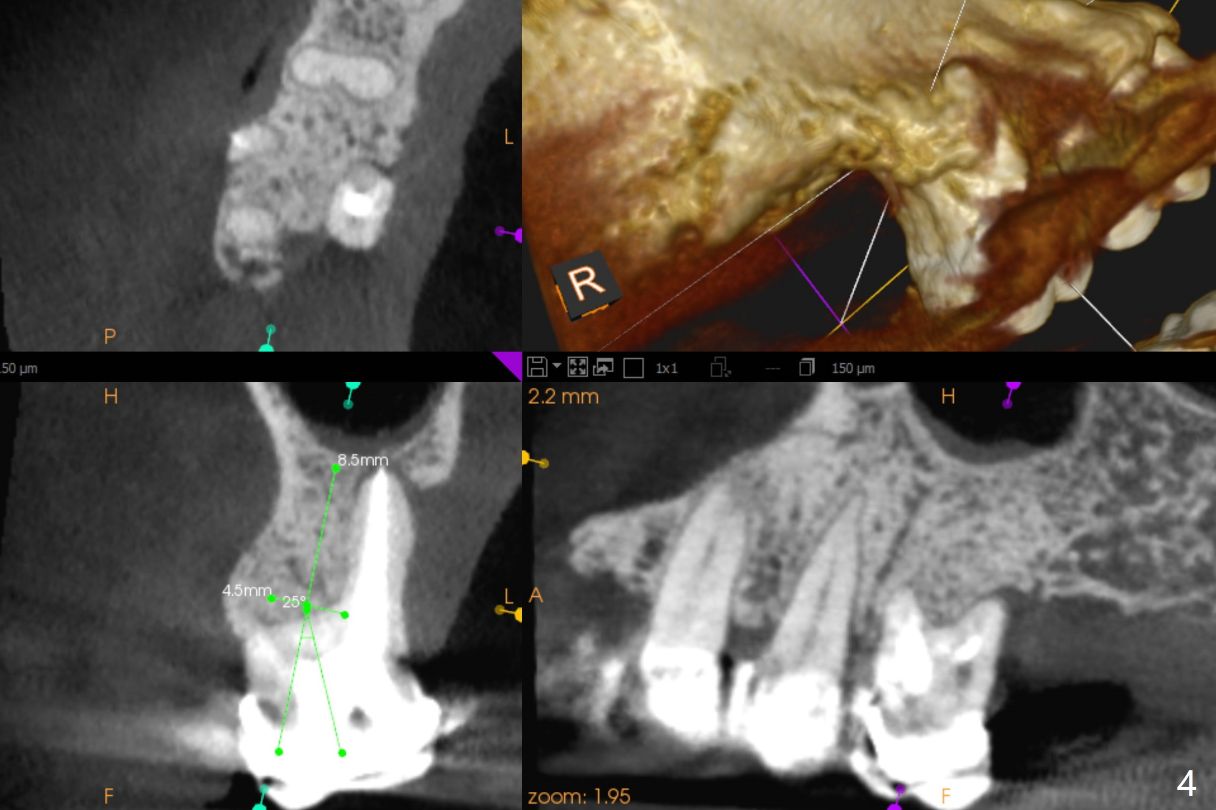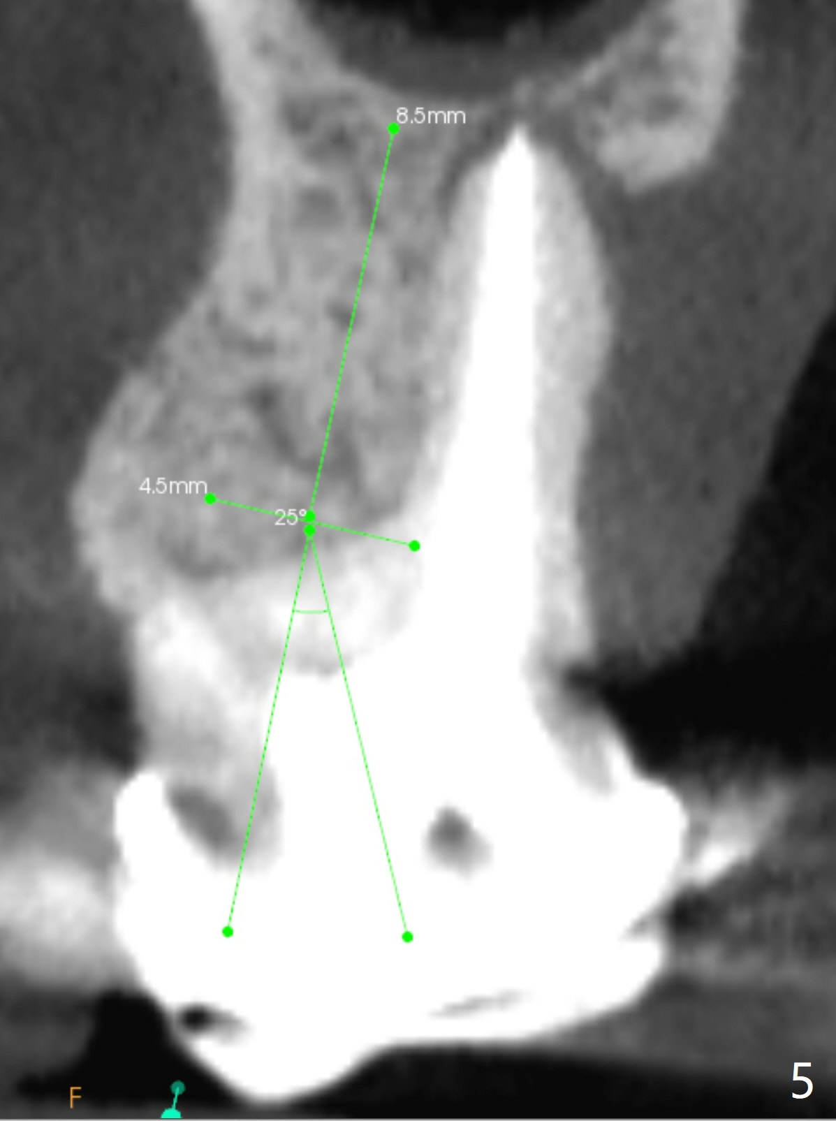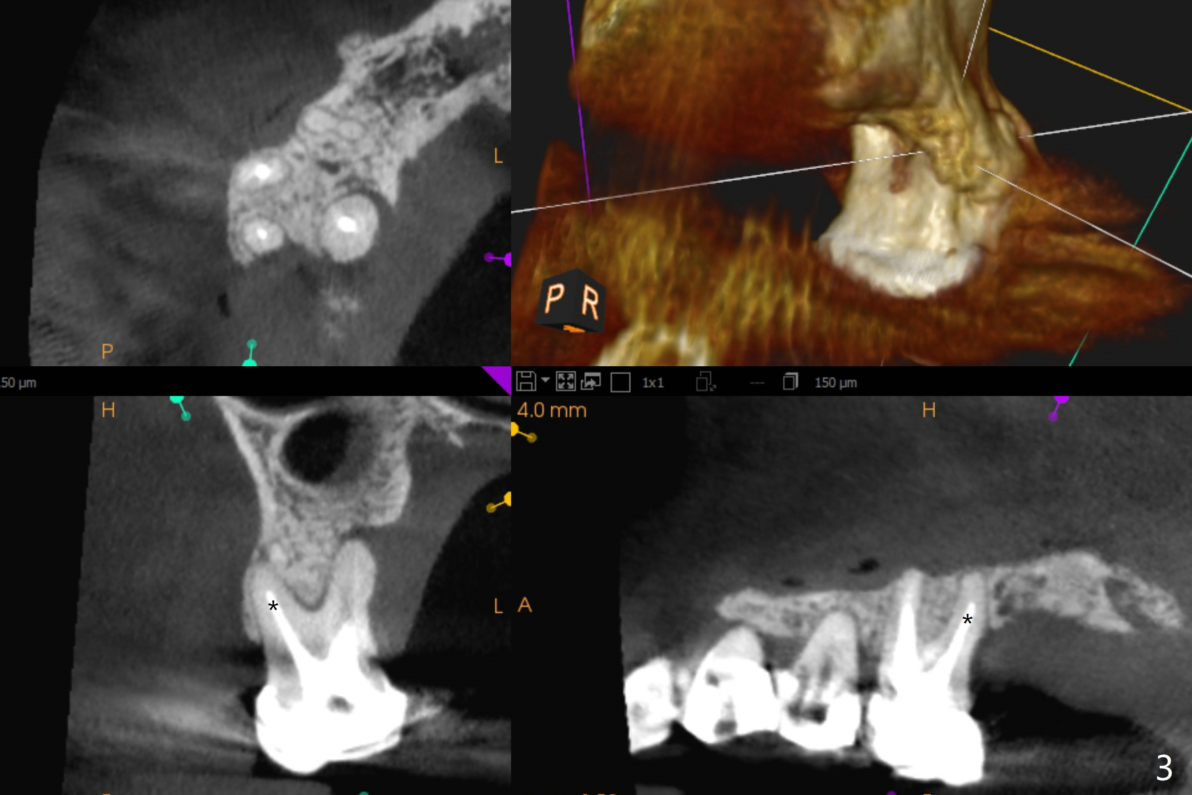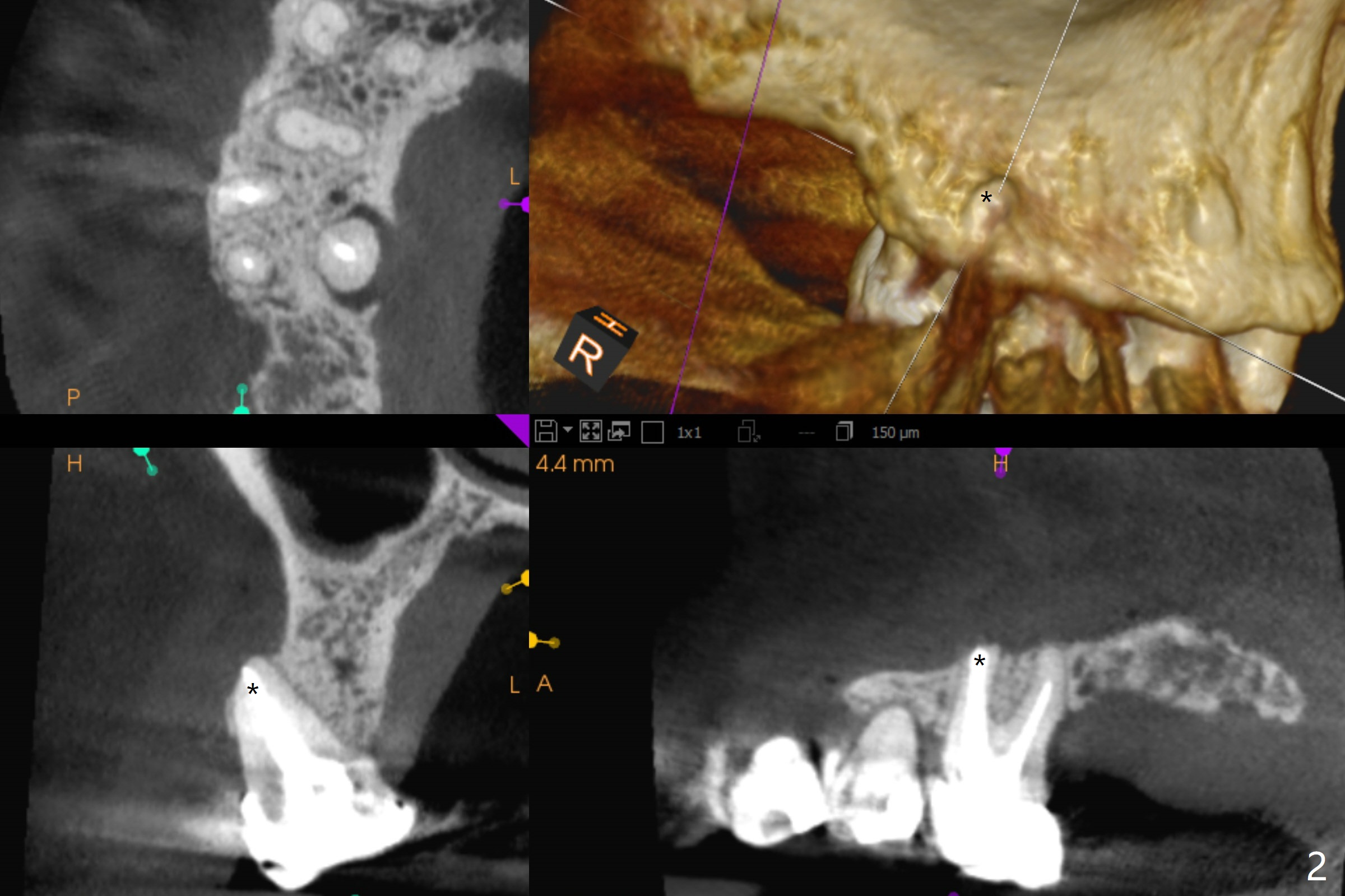 A 52-year-old woman has had chronic abscess associated with the tooth #3. The palatal root is exposed (Fig.1 P), suggesting root fracture. The apex of the mesiobuccal root seems to stick out of the buccal plate (Fig.2 *). The root canal filling is incomplete in the distobuccal root (Fig.3 *). The tooth appears to have guarded prognosis. Extraction and immediate implant is apparently a better option (Fig.4,5). It would be safer to start osteotomy in the middle of the remaining septum (Fig.6, as compared to Fig.5). After sinus lift with PRF membrane (Fig.7 yellow curved line) and implant placement (green), another piece of PRF membrane will be placed against the palatal wall of the socket, followed by bone graft (red circles) and a 25-degree angled abutment (pink).