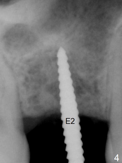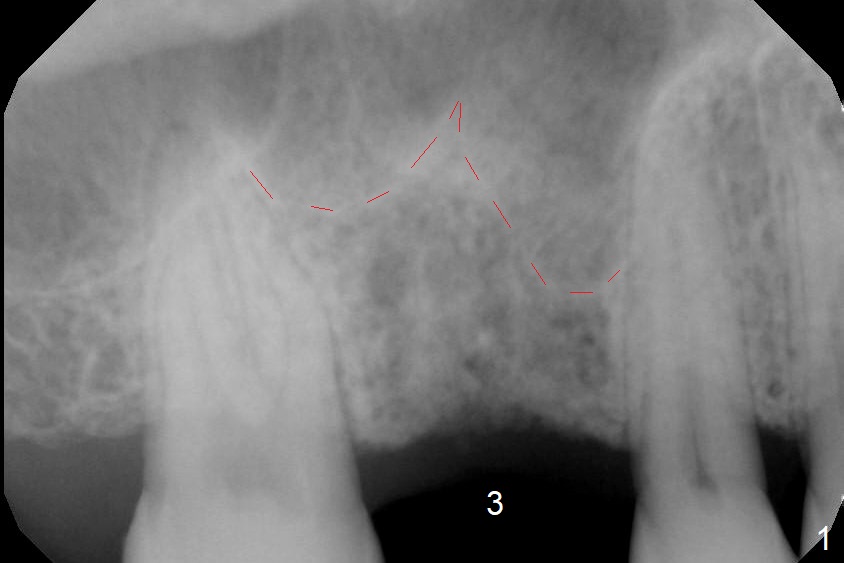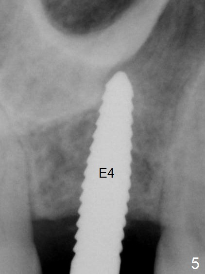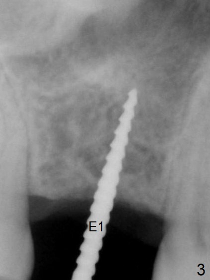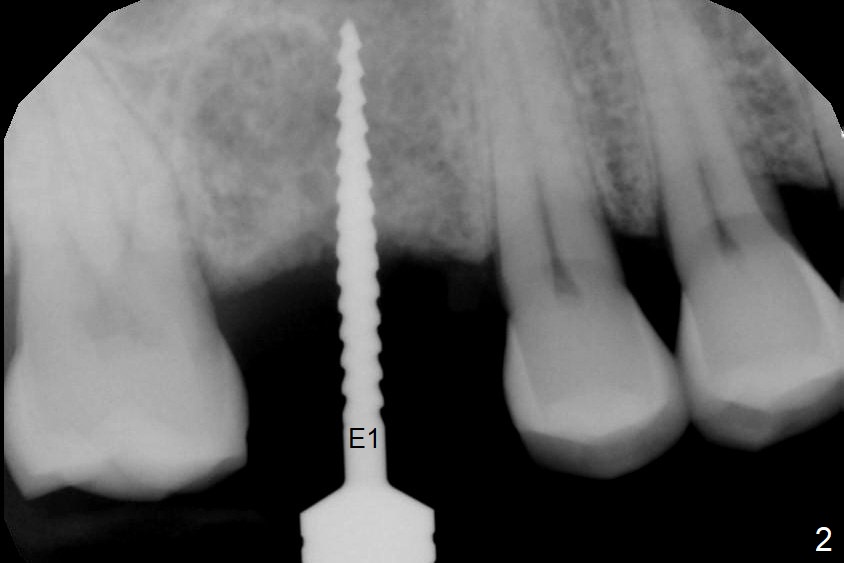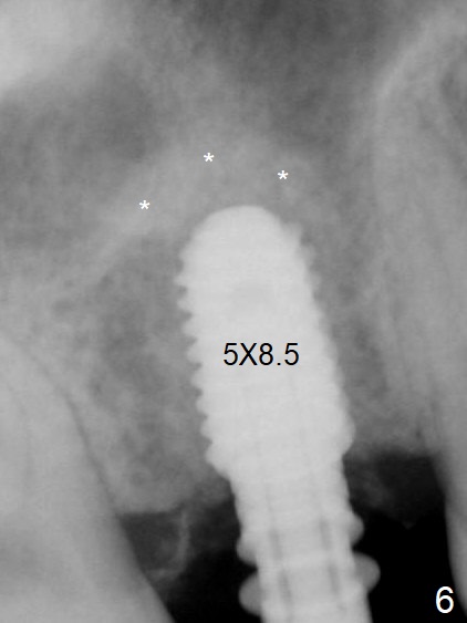 A 54-year-old man has lost the tooth #3 for 6 months with complicated sinus floor morphology (Fig.1 red dashed line (one of 2 outlines), bone height ~ 7 mm). Initial osteotomy depth is ~ 6 mm (Fig.2,3 with 1.2 mm initial drill and DIO Bone Expander 1 (E1 with diameter 1.0/1.6 mm). Following change in the trajectory, E2 (1.3/2.3 mm) is used for ~ 8 mm (Fig.4). After application of E4 (2.4/3.7 mm, Fig.5) and E5 (3.0/4.4 mm) for ~ 12 mm, the sinus membrane is found to have perforated. With placement of collagen membrane and cortical allograft (Fig.6 *), a 5x8.5 mm Hiossen implant is placed with >50 Ncm.