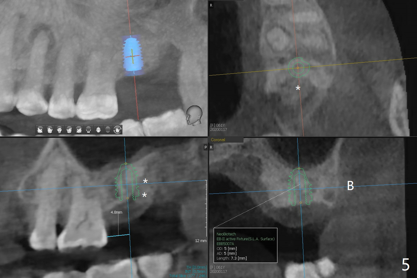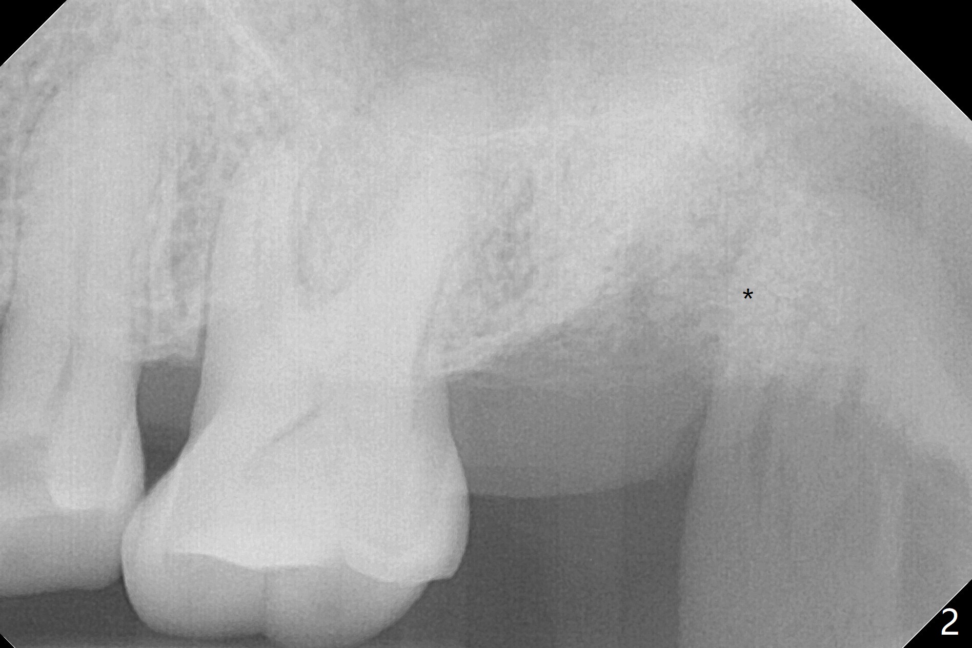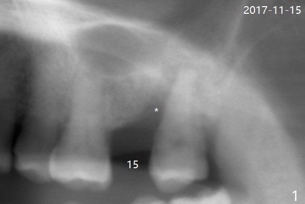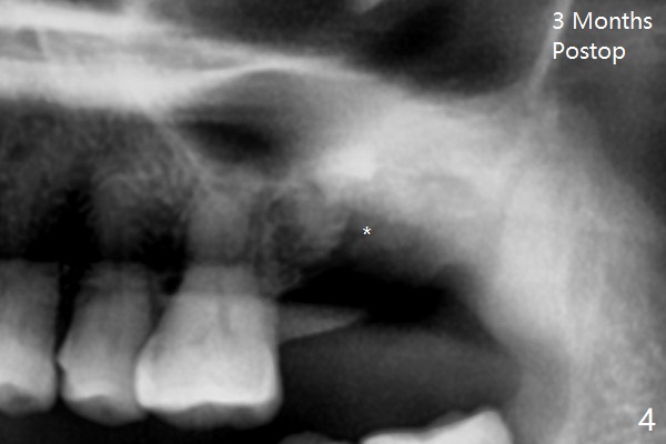 A 61-year-old woman requests #15 implant post ones at #2 and 6 because of pain in mastication (Fig.1). Examination shows that the tooth #16 has advanced periodontitis with mesial bone loss (Fig.1 *). It appears that there is insufficient bone for #15 implant. Bone graft seems necessary at #16 after extraction. There is severe hemorrhage post extraction. Osteogen plug is inserted for hemostasis prior to placement of allograft (Fig.2 *). The socket opening is covered with 12x12 mm Amnion-Chorion Membrane and 5-0 Polysyn. The socket seems to heal 9 days postop (Fig.3). The bone graft in the socket of #16 three months postop (Fig.4 *) will support an implant to be placed at #15 distal (Fig.5 *).